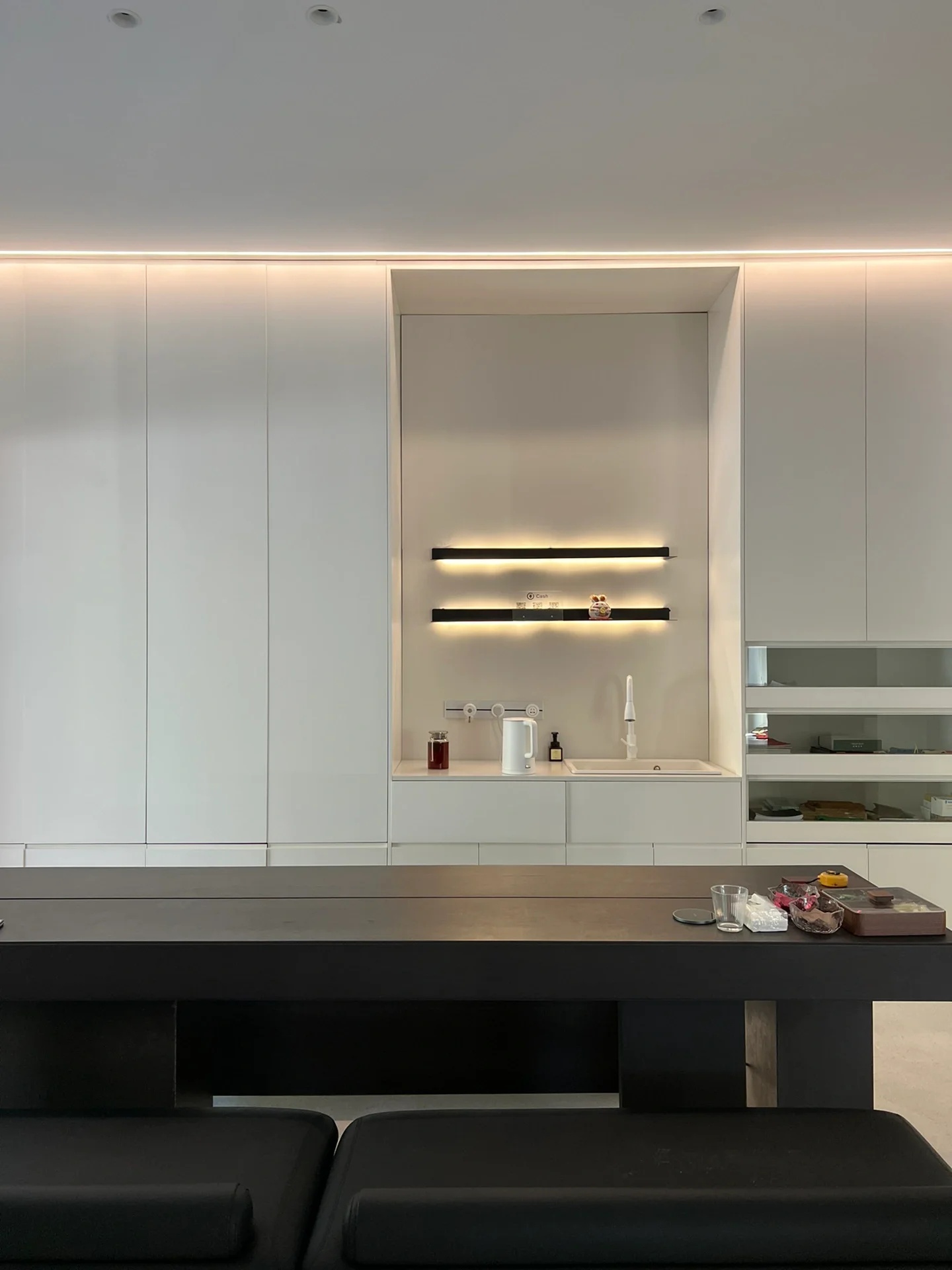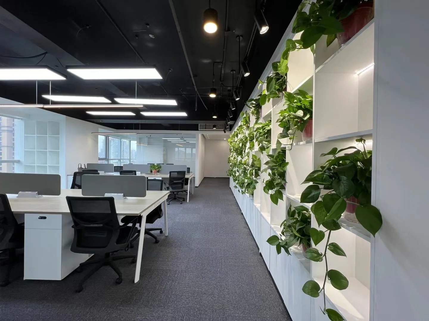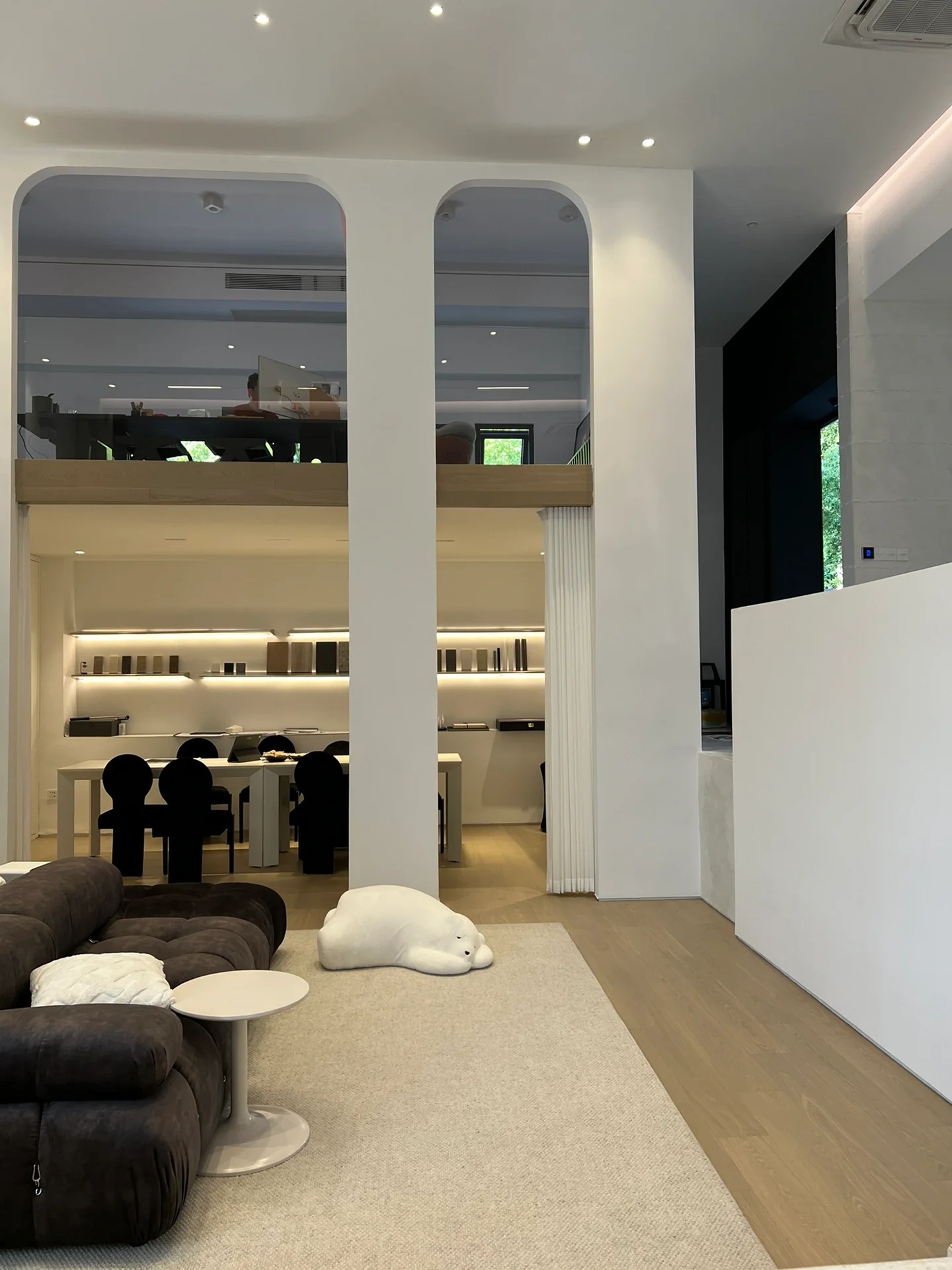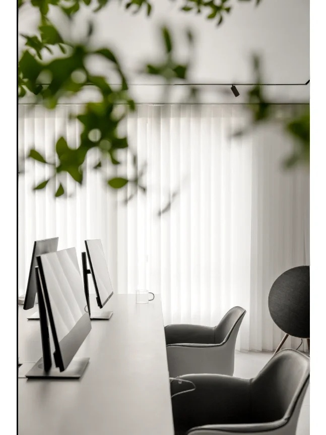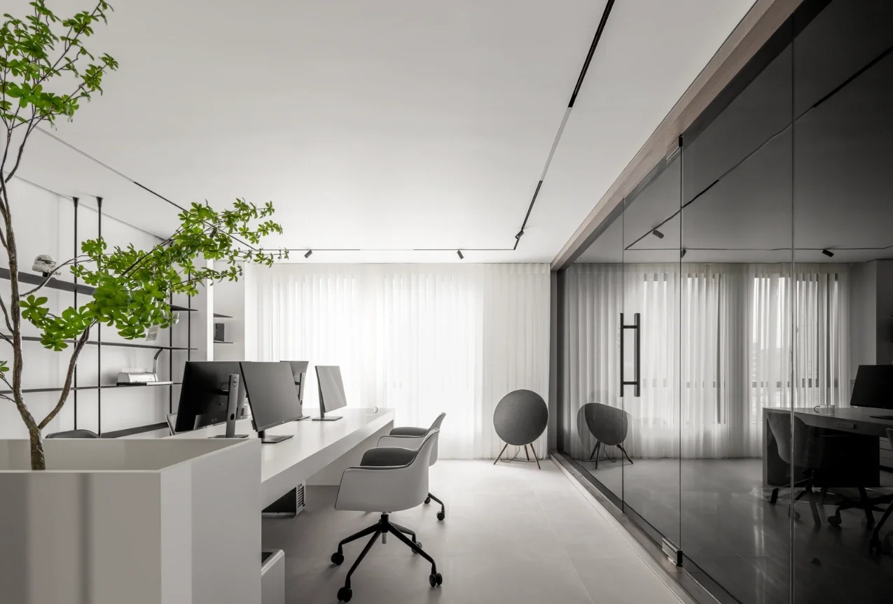 刚搬进来不久,入户有个非常大换鞋区,把室外的尘埃与室内隔绝!室内动线清晰,有员工区,2个设计总监办公区,茶水台!下沉式会客区及会议区!大面积的隐藏柜子将办公的物料全部隐蔽,整个办公室以白色涂料为主!
