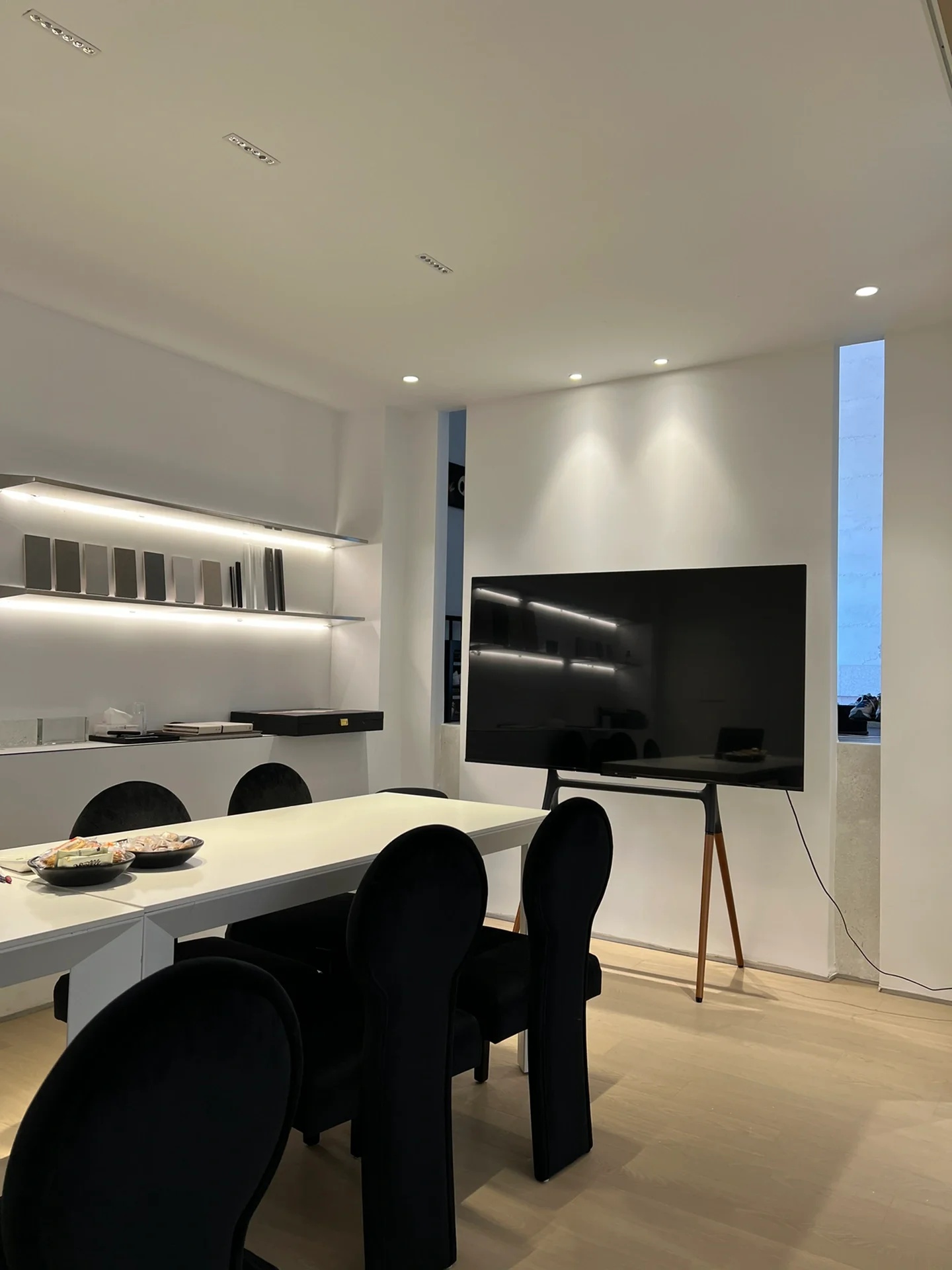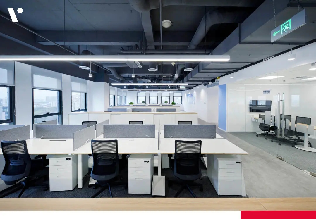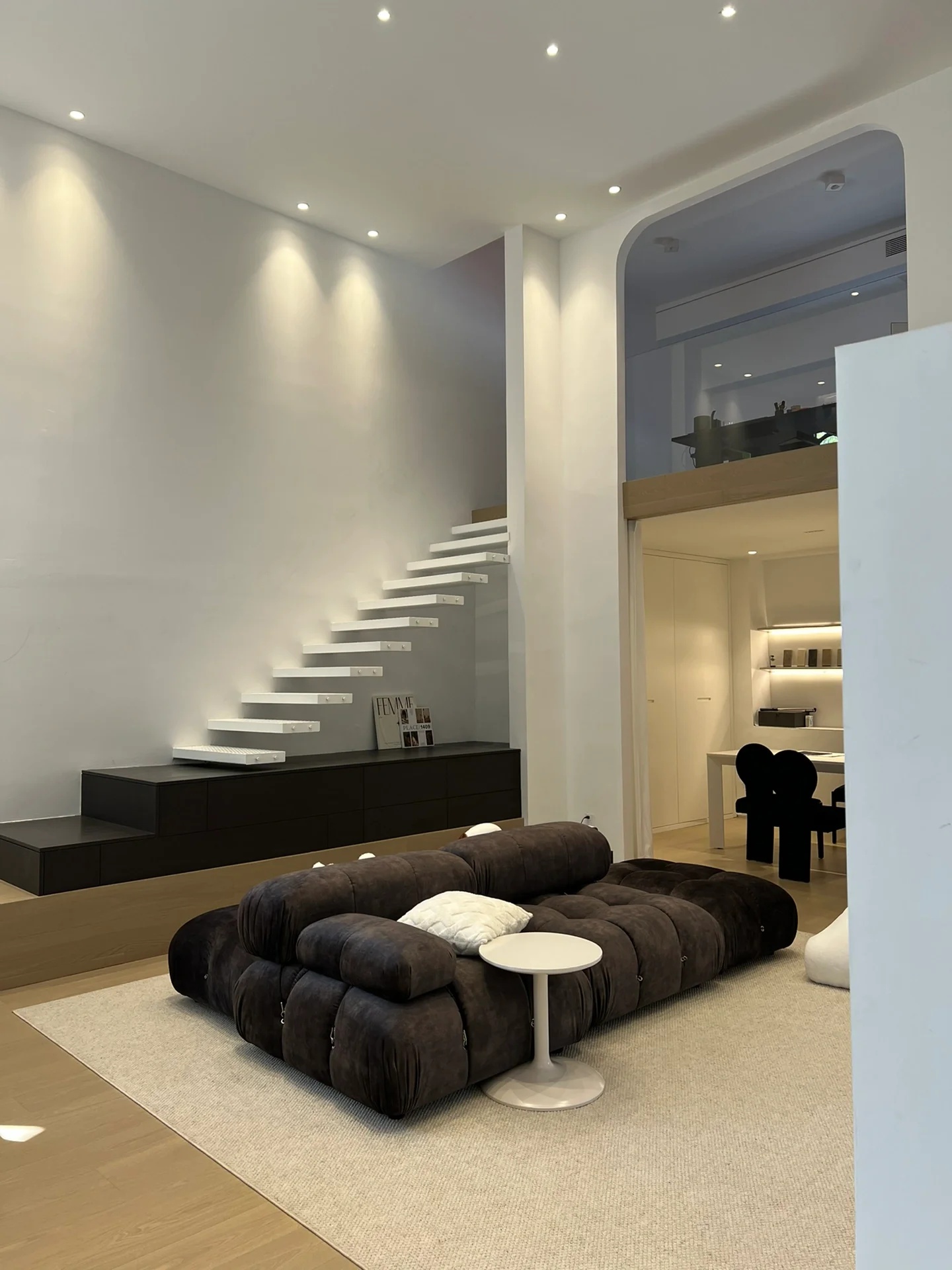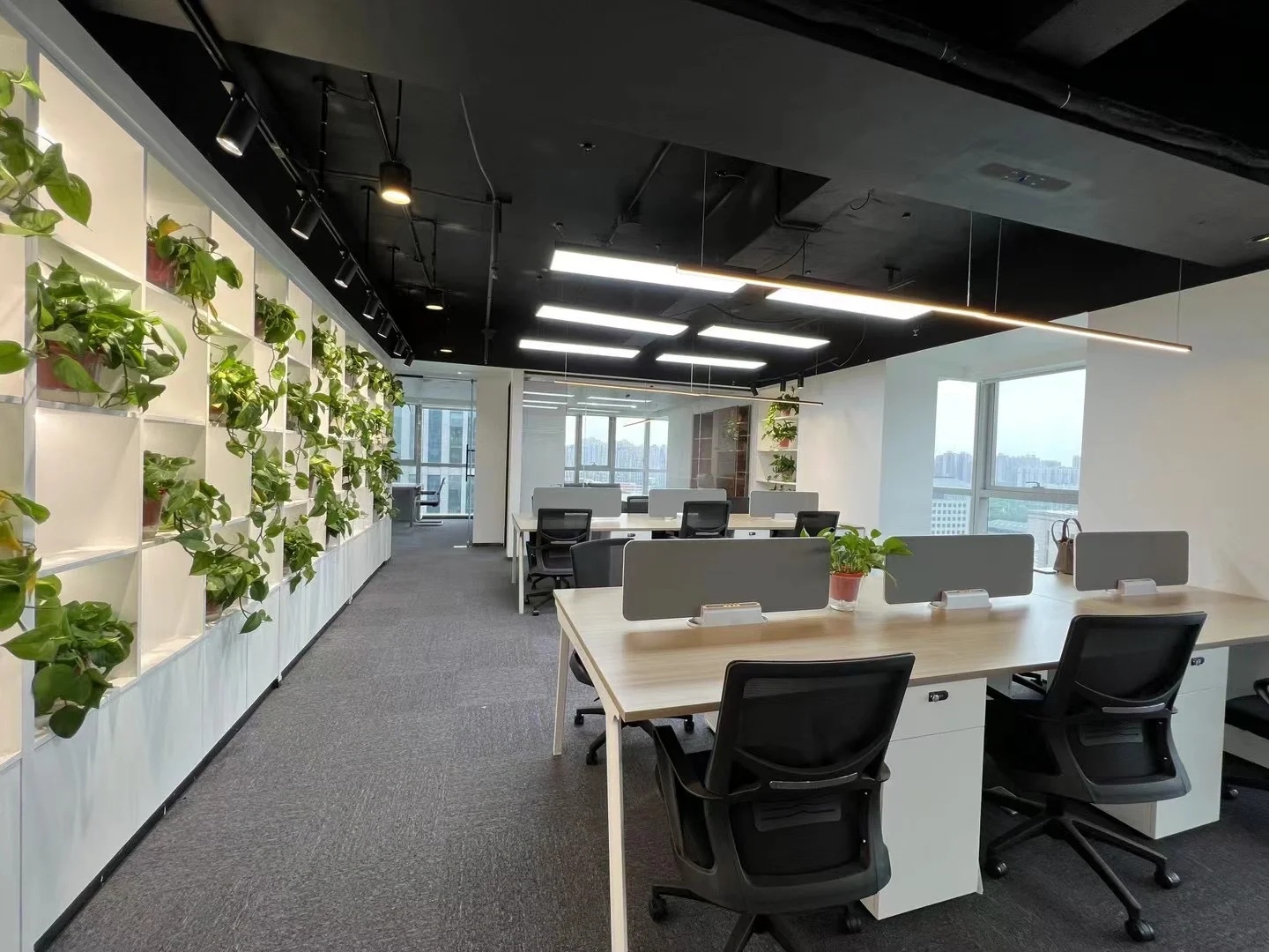 刚搬进来不久,入户有个非常大换鞋区,把室外的尘埃与室内隔绝!室内动线清晰,有员工区,2个设计总监办公区,茶水台!下沉式会客区及会议区!大面积的隐藏柜子将办公的物料全部隐蔽,整个办公室以白色涂料为主!