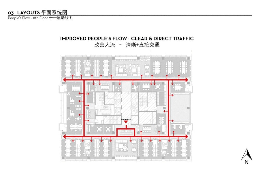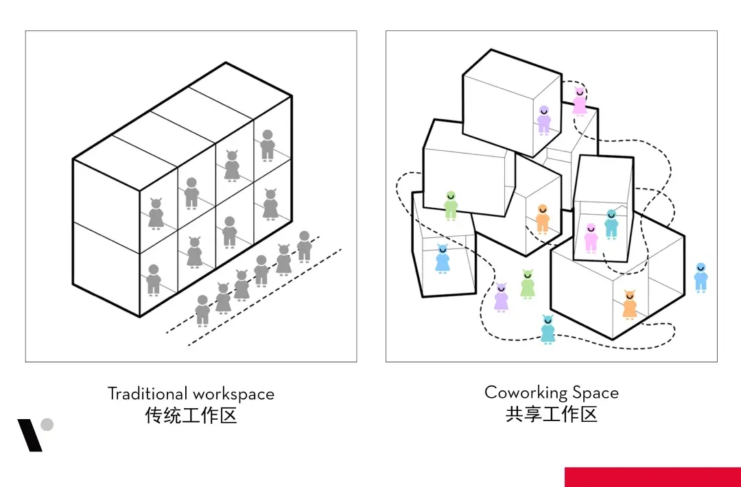分隔左右两个空间的墙体也被打通,在规范允许的范围内,被更换为防火卷帘。人们因此可以自由地在左右两个空间中穿梭。桌子的布置也延续了这一横向的形态,连通左右空间。