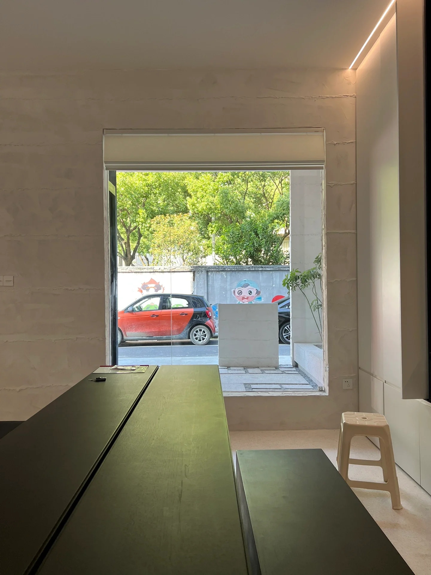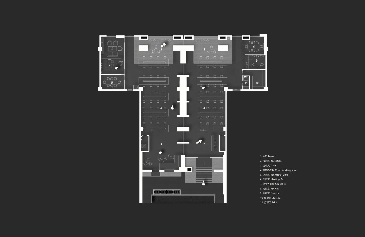 场地的现状条件是非常严峻的。客户租用的空间是相邻的独立两户,由厚重的墙体分隔为左右两个空间,两户之间仅可以通过外部的外廊连接。空间呈窄开间,大进深的长条矩形平面,中部区域的自然采光很弱。另外,梁的间距较密,梁下的高度也较低,仅有2.6米净高,让人略有压抑之感。