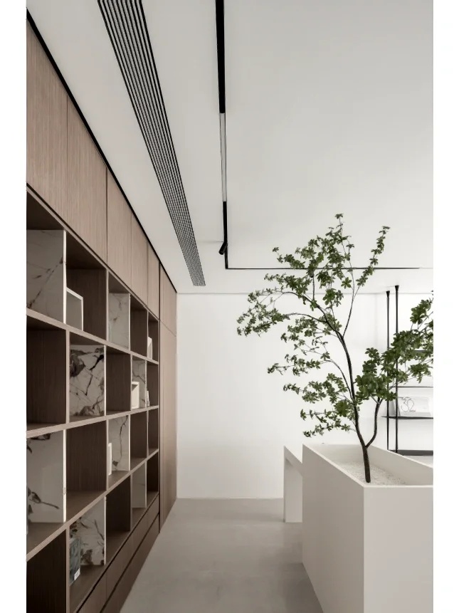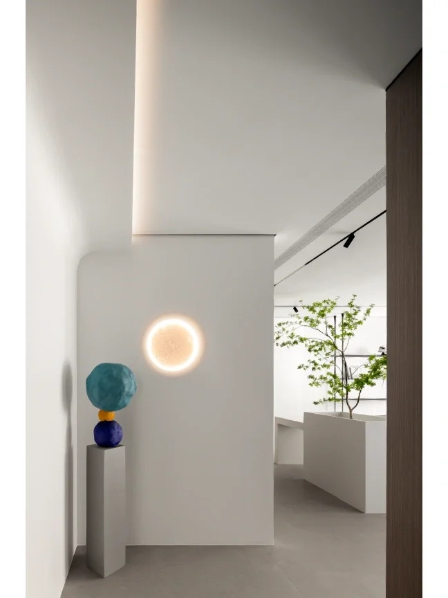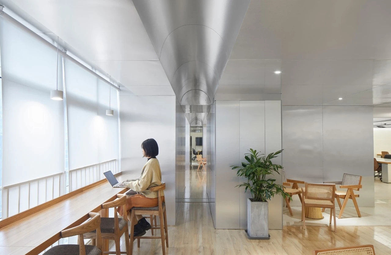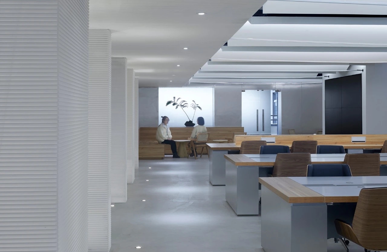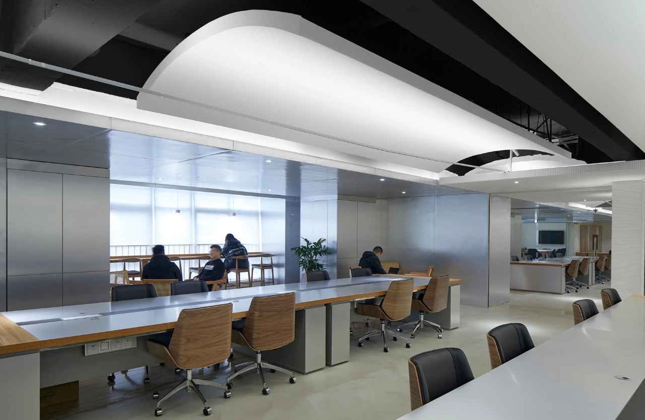 我们设计了许多个白色的长筒形天花板,用于形成大屋檐的意向。再用向上打光的灯条将其打亮,引导光线通过拱形天花再折射下来,形成一种明亮的,柔和弥散的光线氛围。长筒形的天花板遮挡住上方裸顶的杂乱管线,同时又微微向上拱起,让人感知上忽略掉了层高较低的影响。
