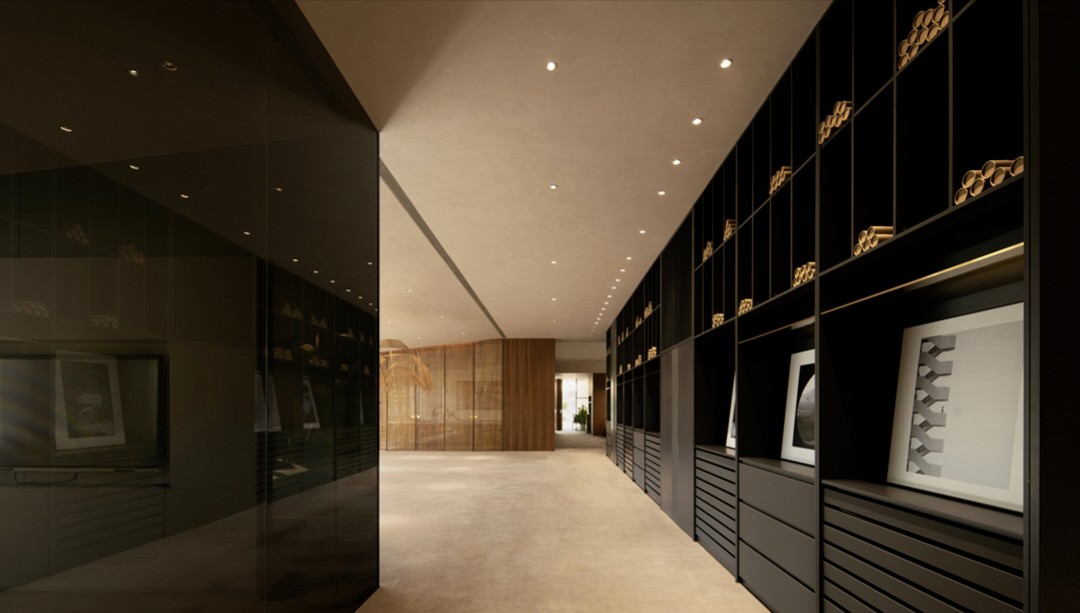 总裁办公室简约而不失精致,于细节中彰显品味与身份。设计延续整体格调量身定制了一个兼具收纳、环保、审美的大面积墙体书柜,突出明与暗、凹与凸的对比,流露优雅大方的气质。