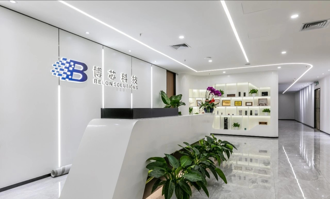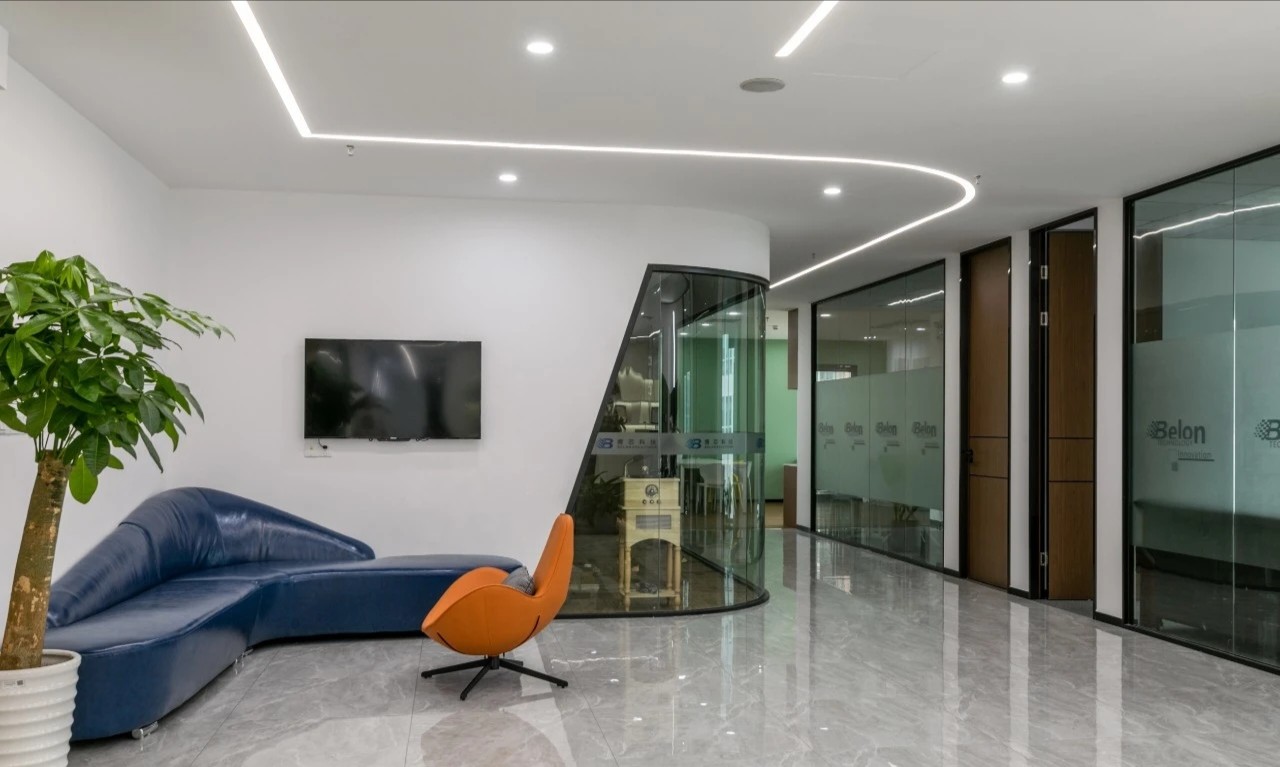 博芯科技正是这样,初入空间,发光logo、趣味化几何形体,结合公司研发的芯片把灵动多元和功能美学相得益彰。