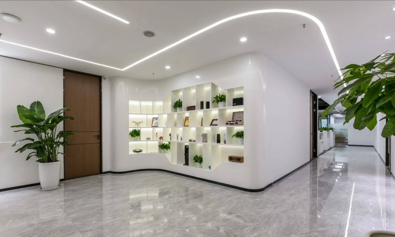 为了契合协作管理系统强大的科技能力,六道空间将整个大厅的主基调设定成简约、优雅的白色,并点缀轻量线性灯光,打造科技未来印象,以此贴合现代化的办公需求。