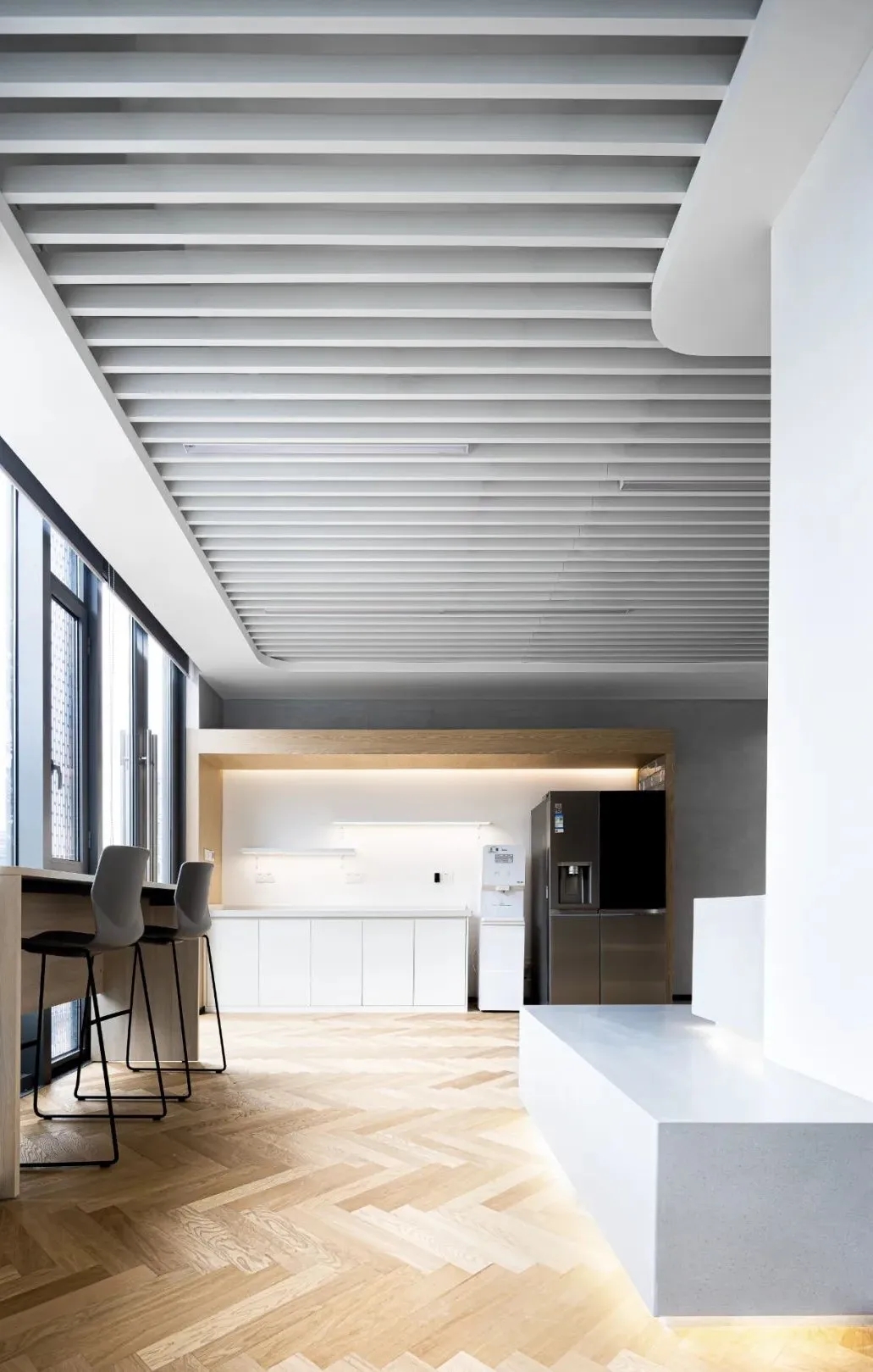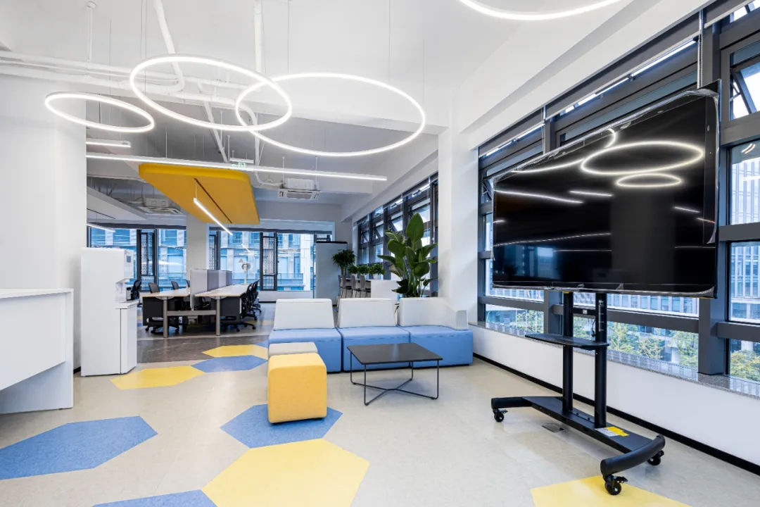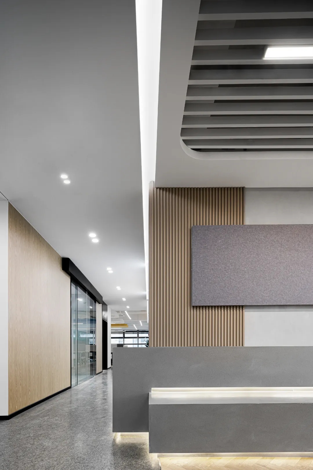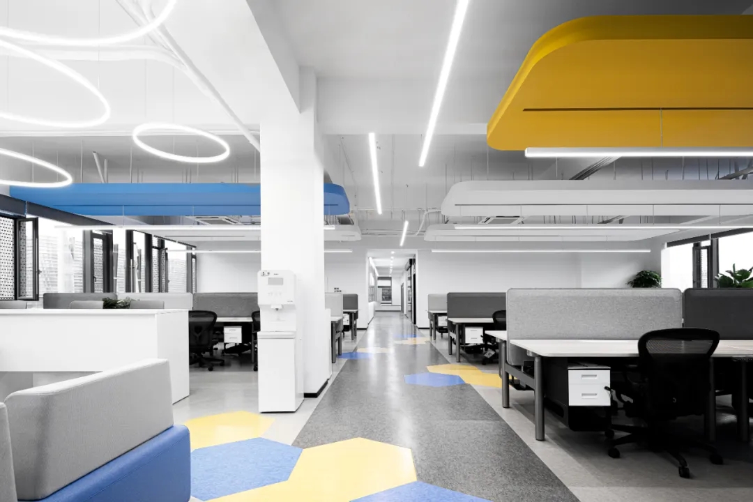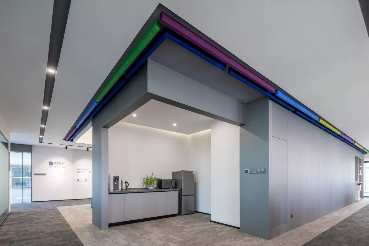 造型吊顶与地面色块相互呼应,轻松有趣的气质穿梭在人员协作之间,中性色彩办公家具在细节上增加耐用和降低视觉刺激导致的疲劳感。真正舒适的空间做到与功能需求一致,提供给使用者专心的设施和敏捷的思路。