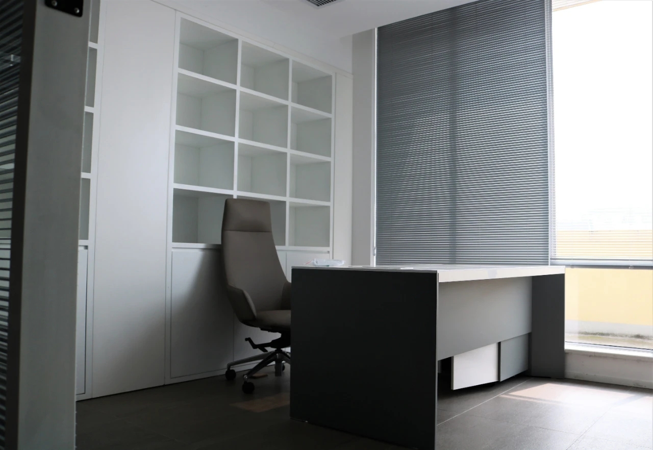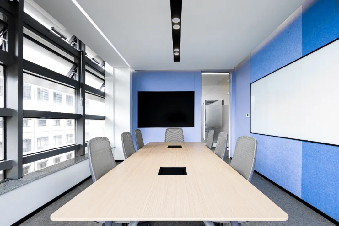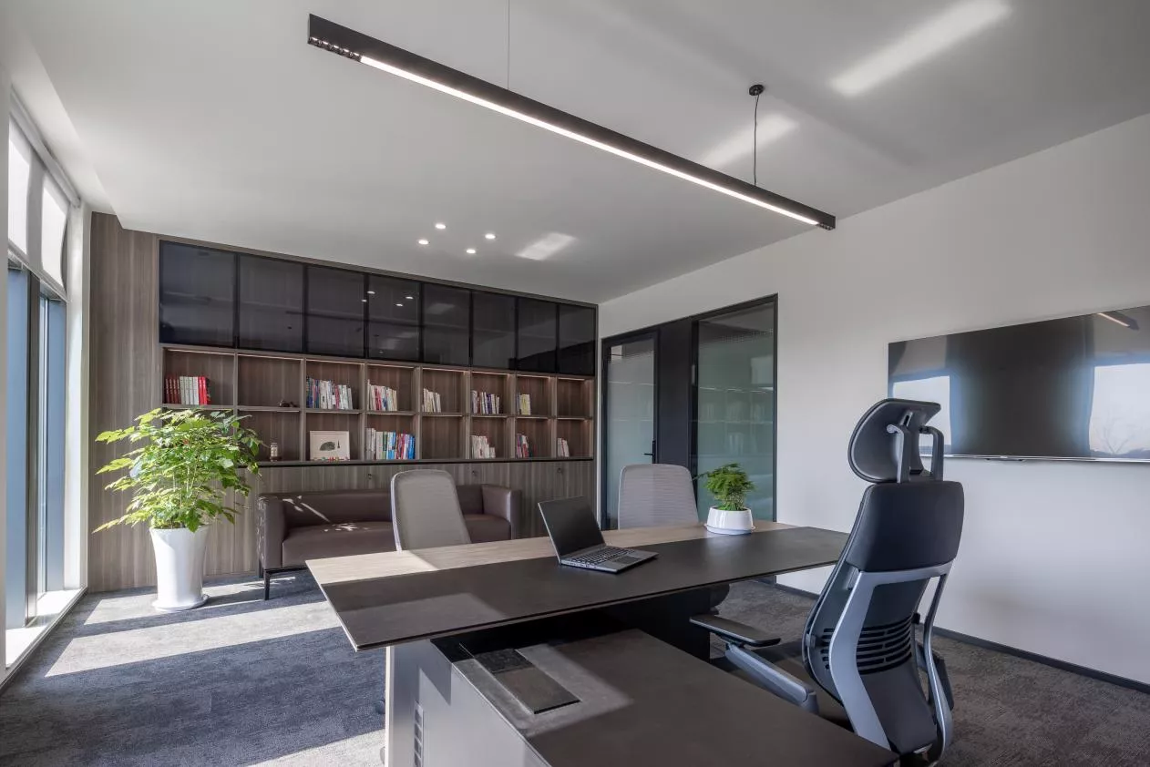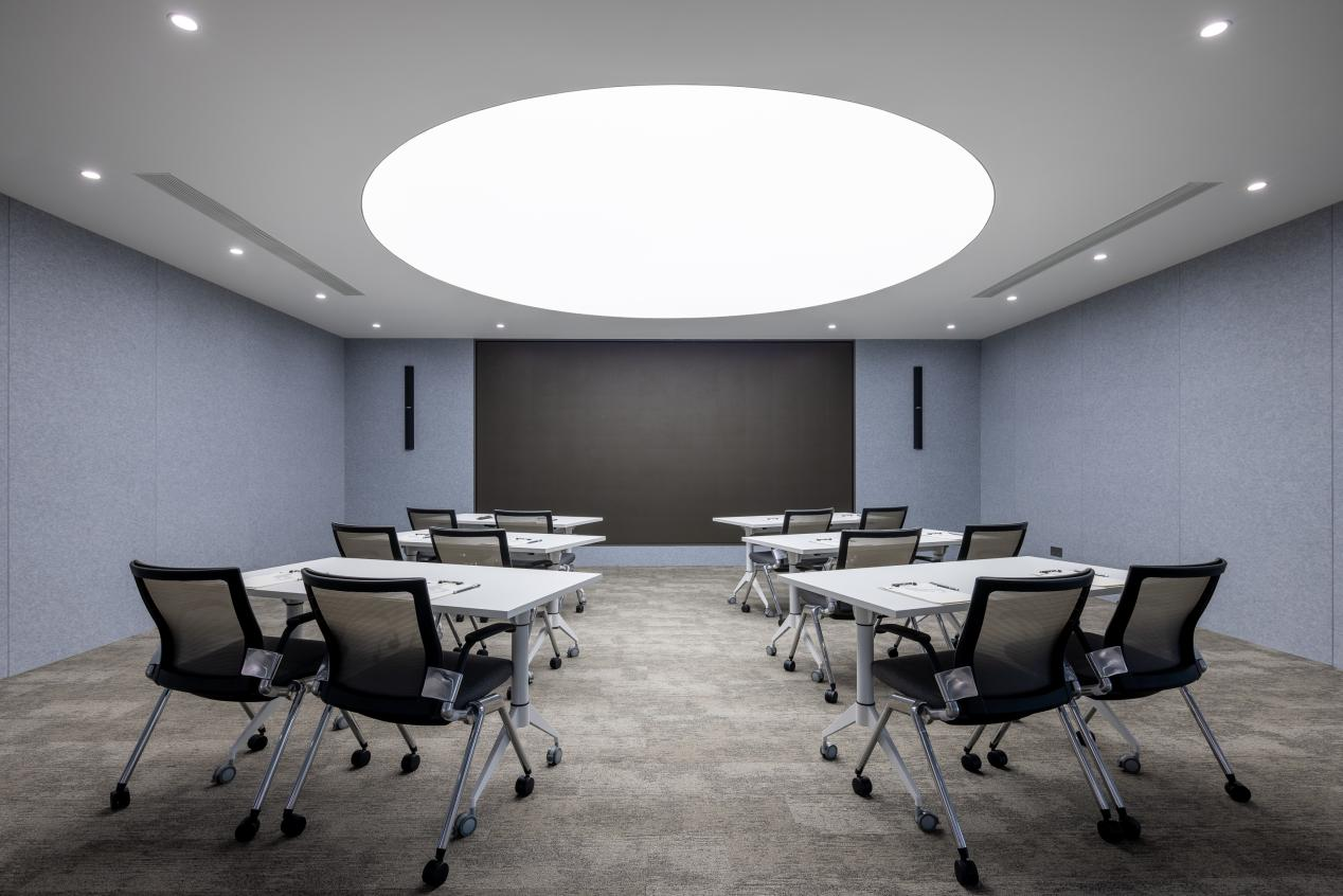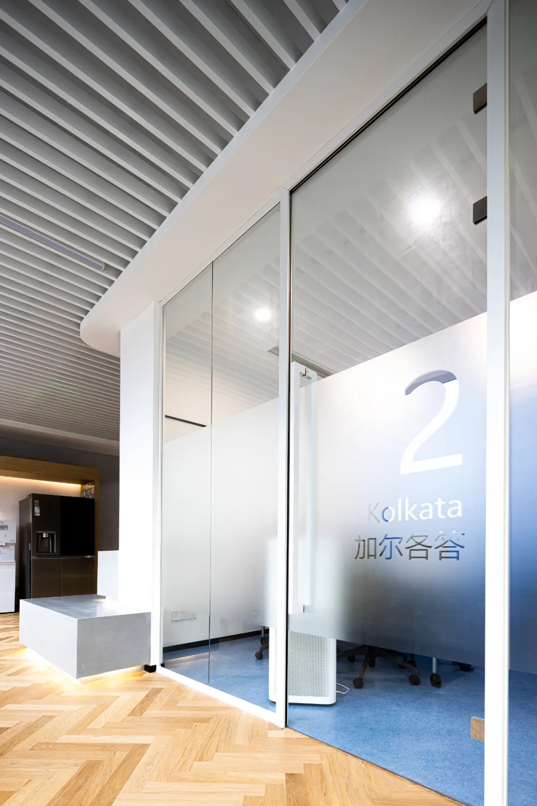 玻璃隔断既保留了采光也确保了隔音需求,配合磨砂膜的使用保护了使用人员的私密性。
