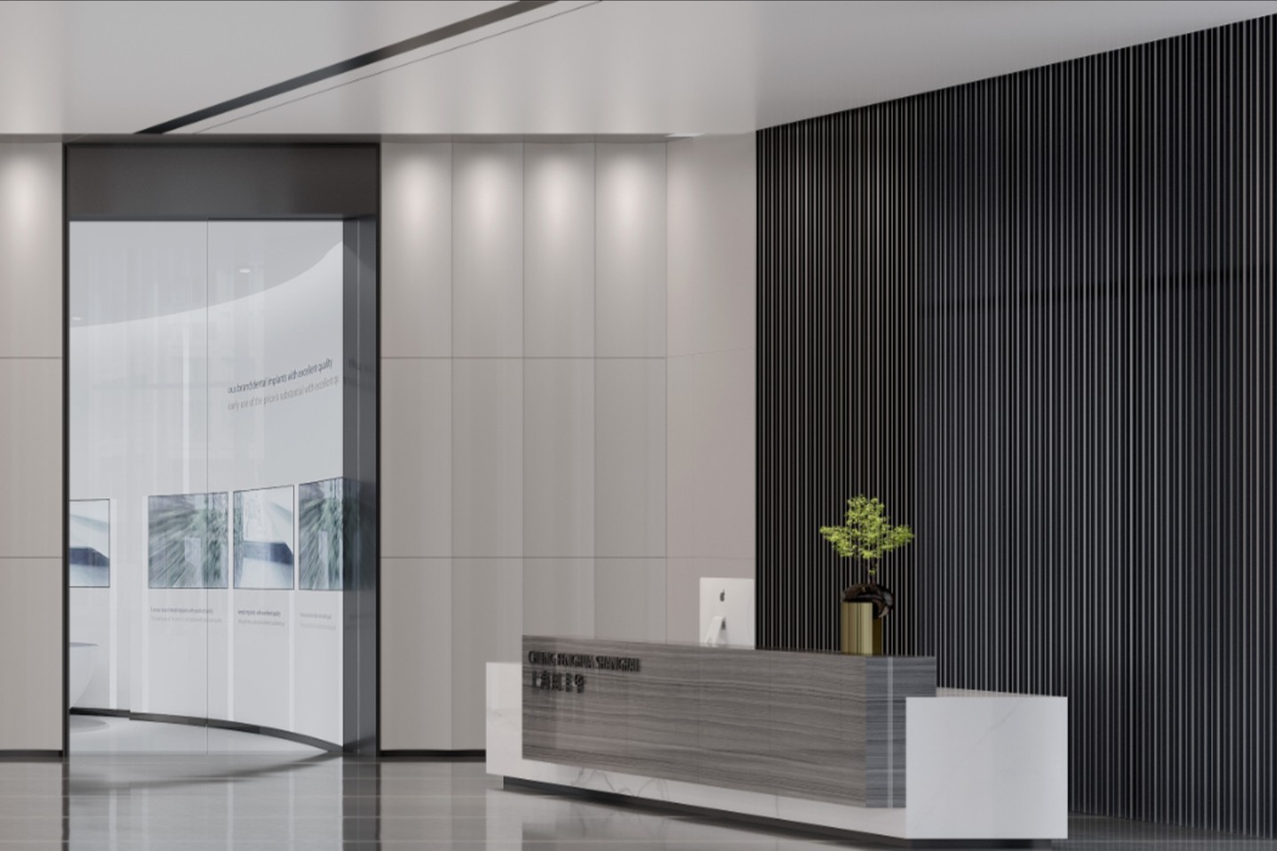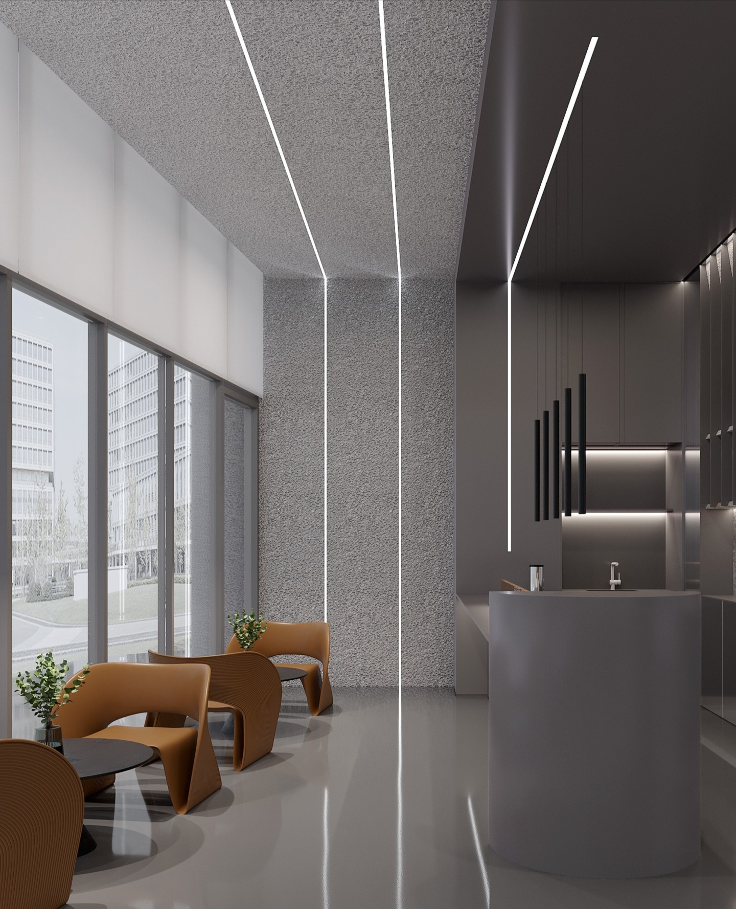 电梯间作为第一印象门面,在线性灯带与白色格栅的通透感下配合打造光影质感空间,将大理石花纹地面最大体现出质感,智能门禁系统后背景墙发光LOGO彰显品牌标识。