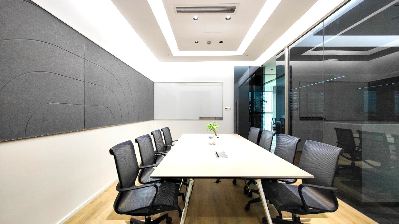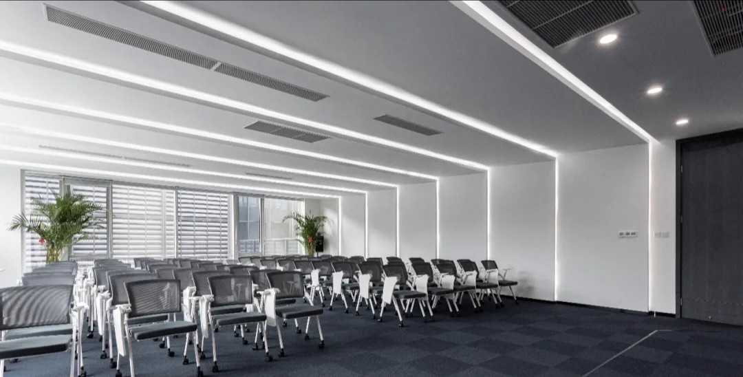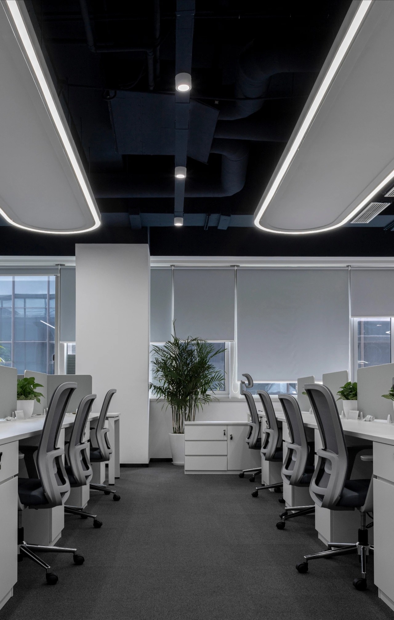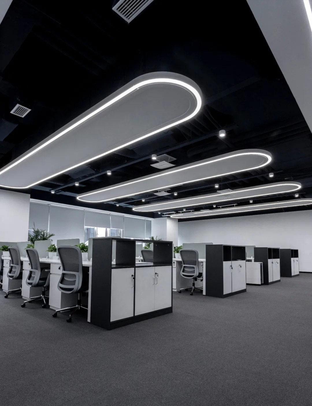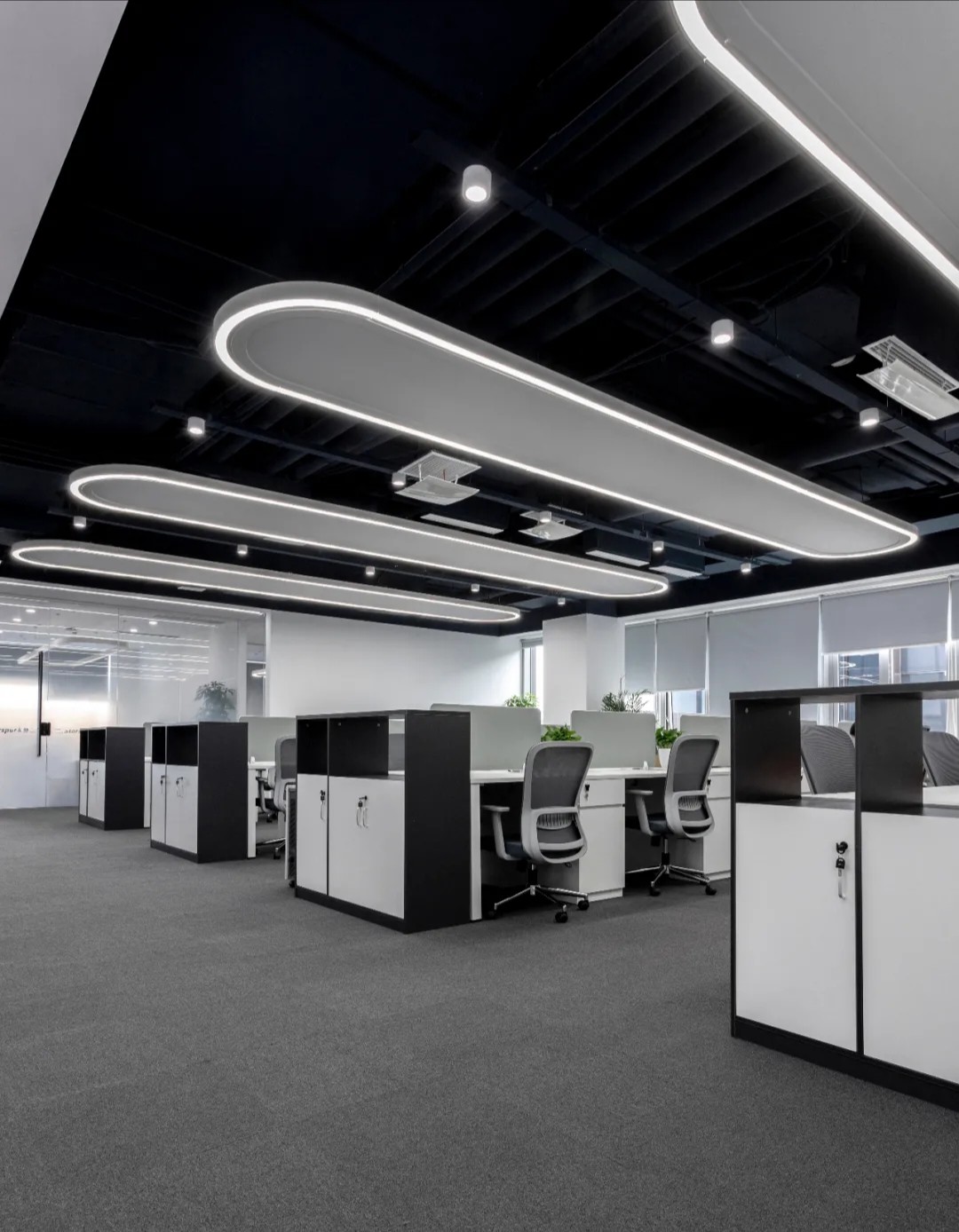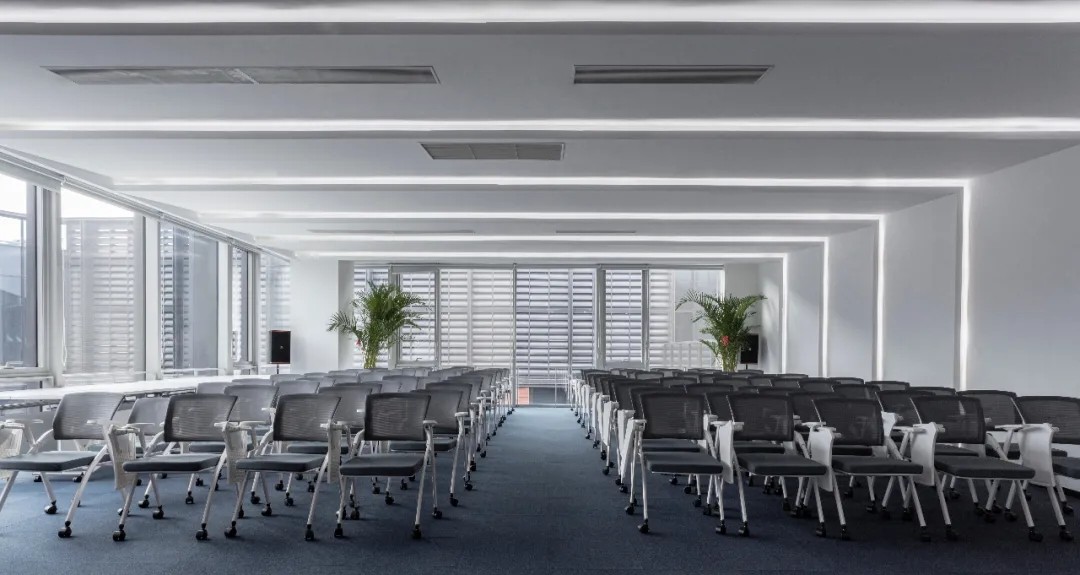 黑白色调的现代风格,室内的灯光与入口通道的设计理念一致,同样传递出科技未来的感觉。角落的绿植传递出生机与自然的力量。会议室选用的是一体式桌椅,提升空间利用率,让该空间可以容纳更多的参会人员。所有的椅子都是可移动的,为会议提供更多可能性。