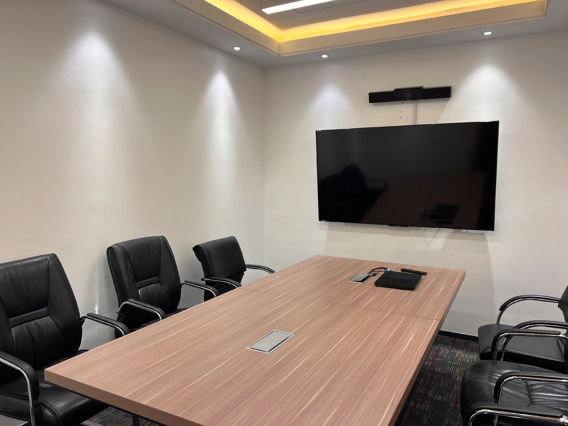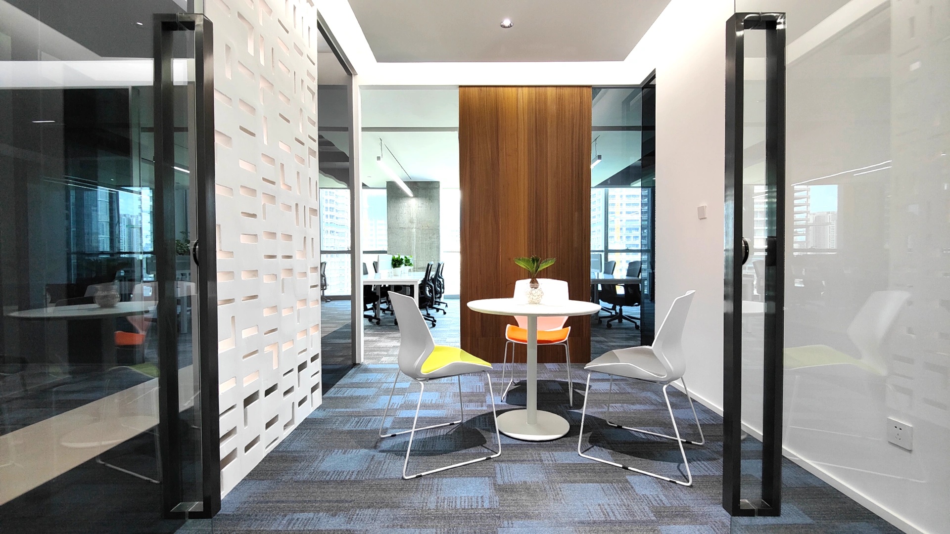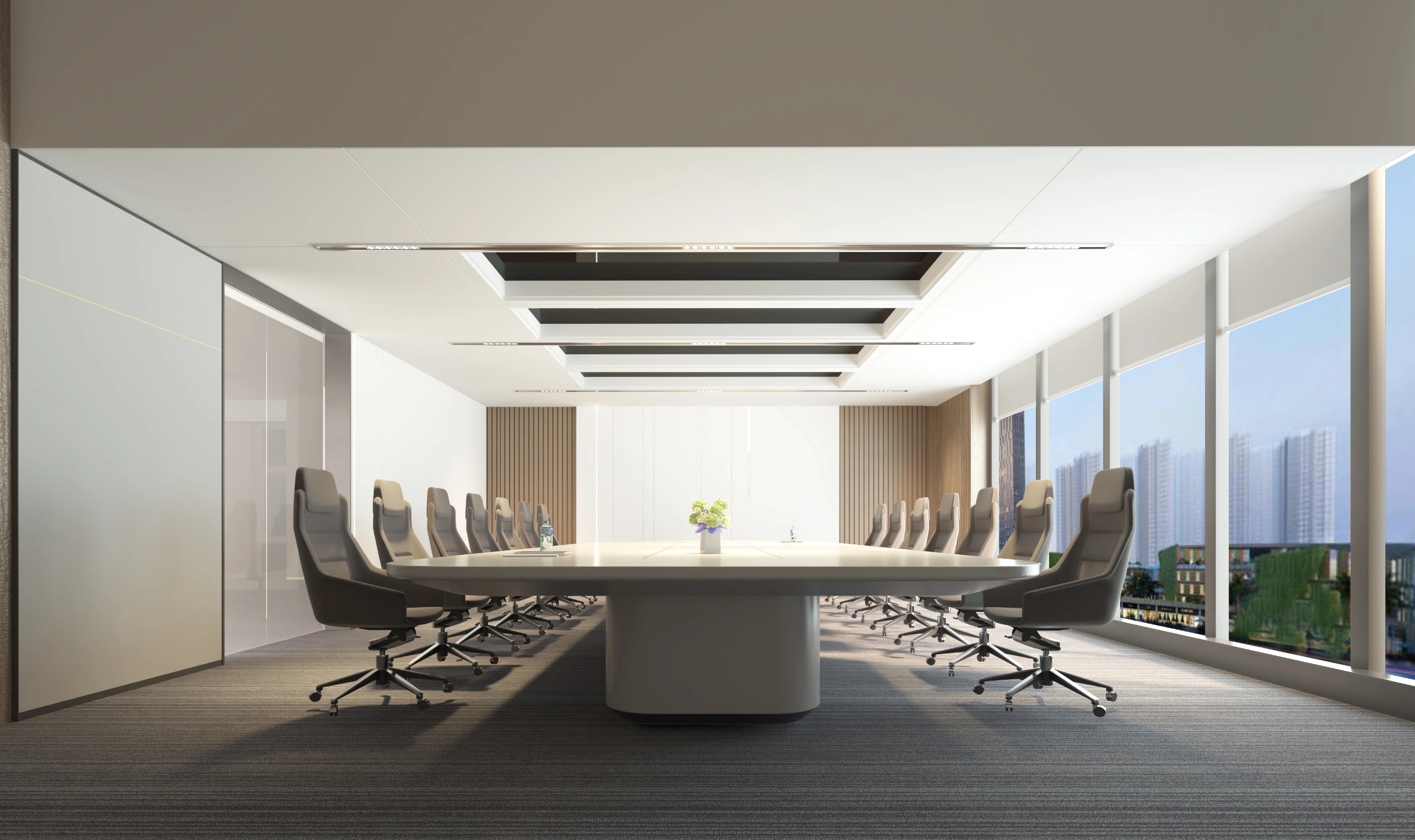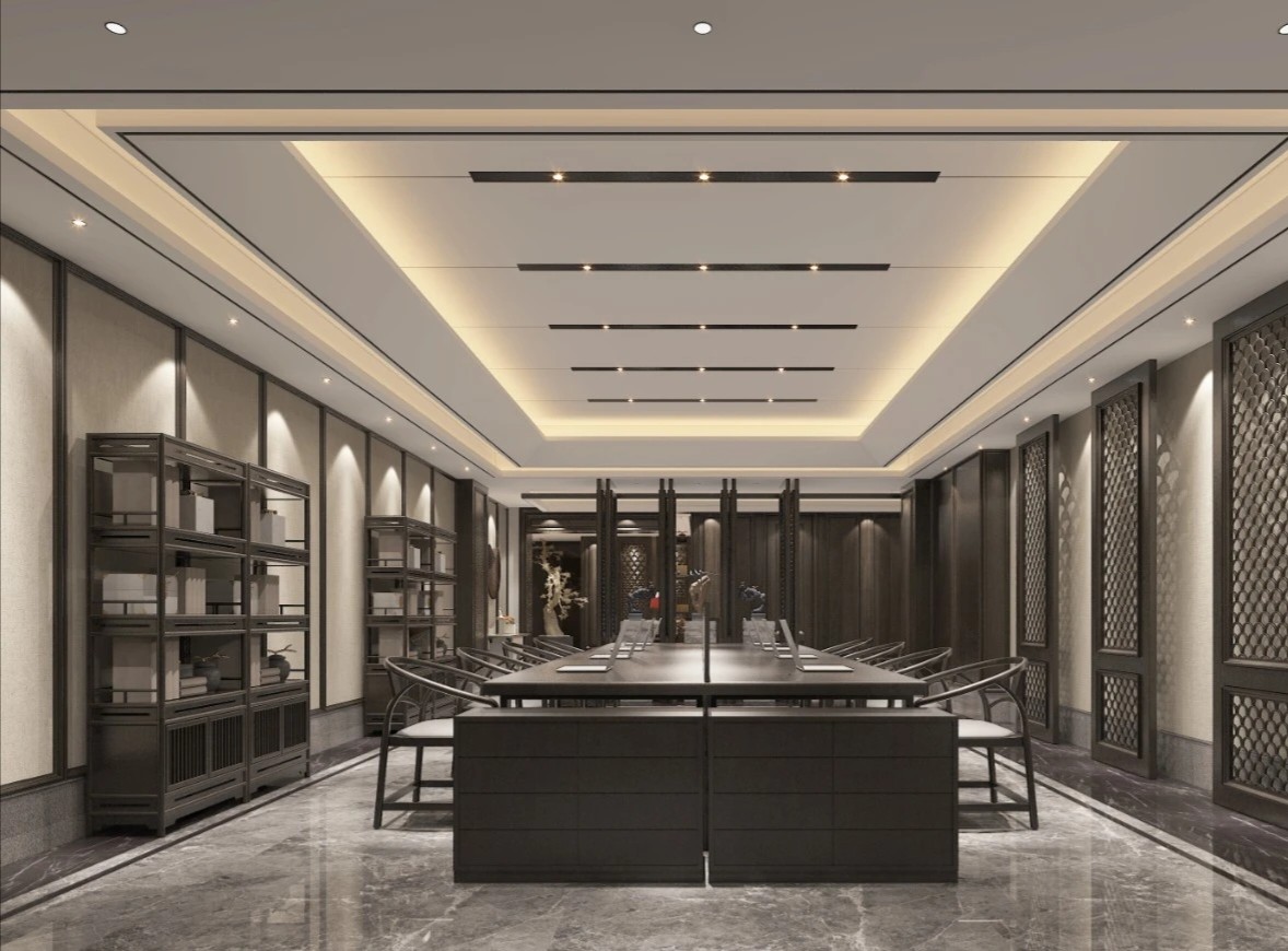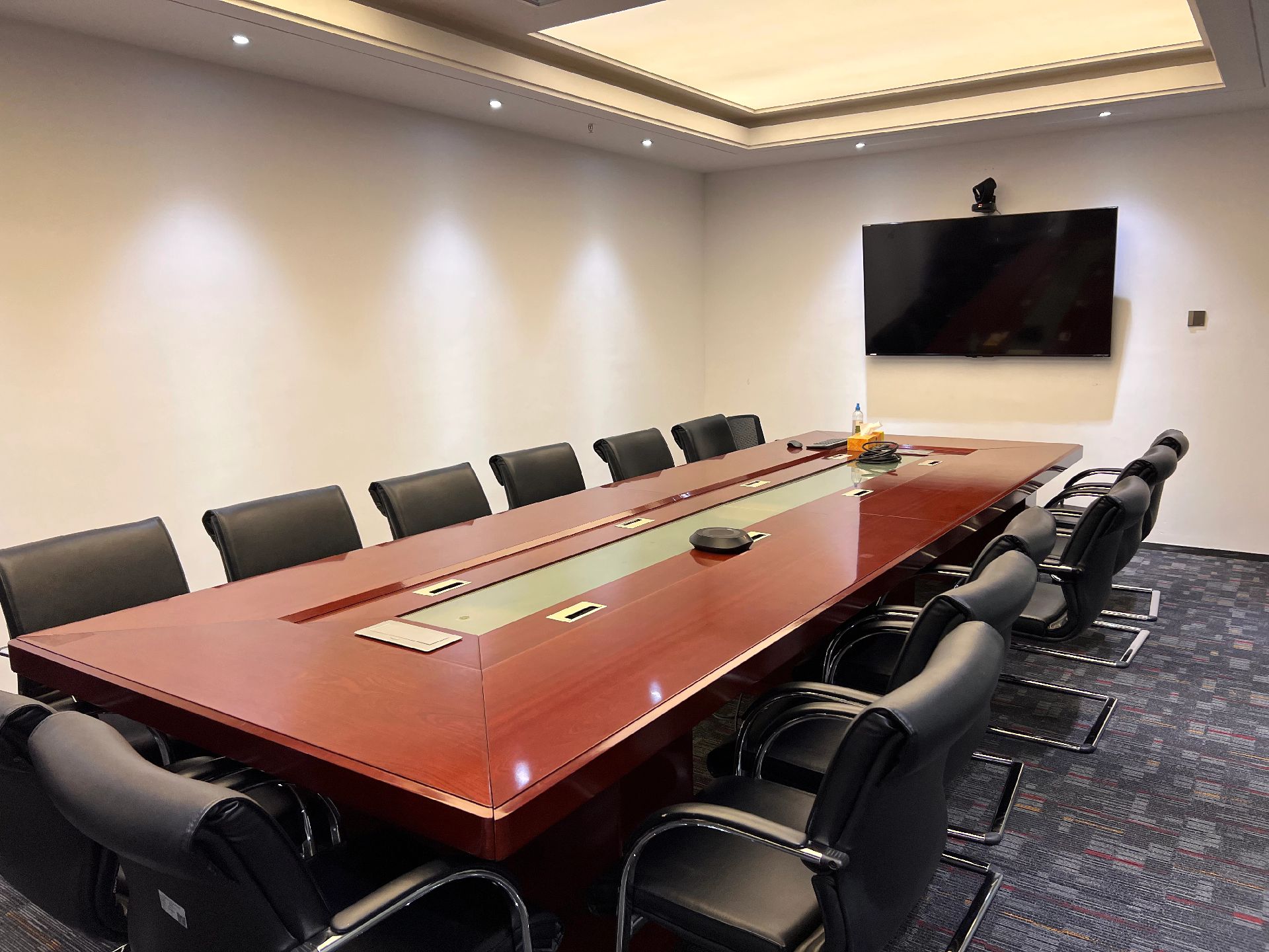 黑白色调的现代风格,室内的灯光与入口通道的设计理念一致,同样传递出科技未来的感觉。角落的绿植传递出生机与自然的力量。会议室选用的是一体式桌椅,提升空间利用率,让该空间可以容纳更多的参会人员。所有的椅子都是可移动的,为会议提供更多可能性。