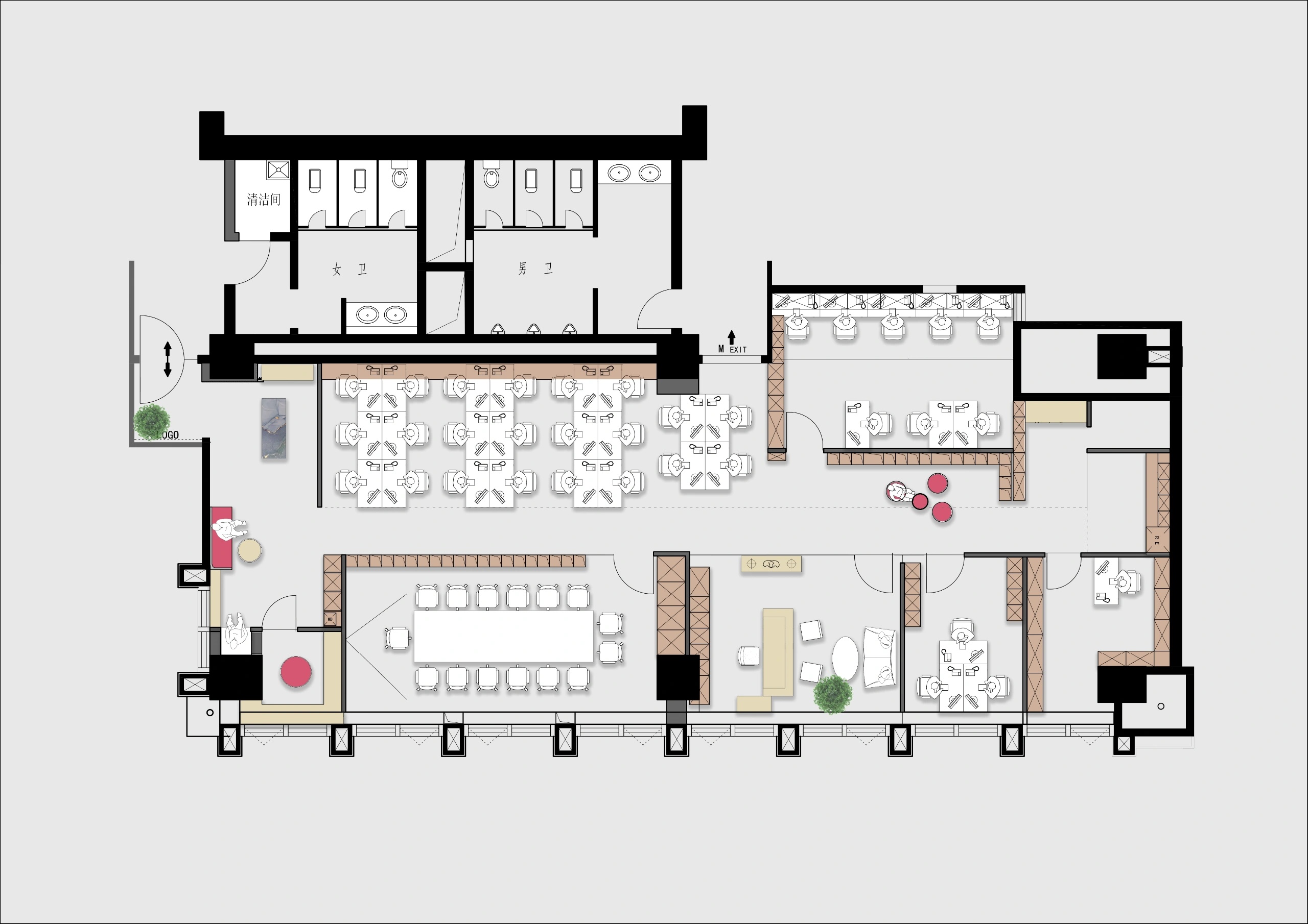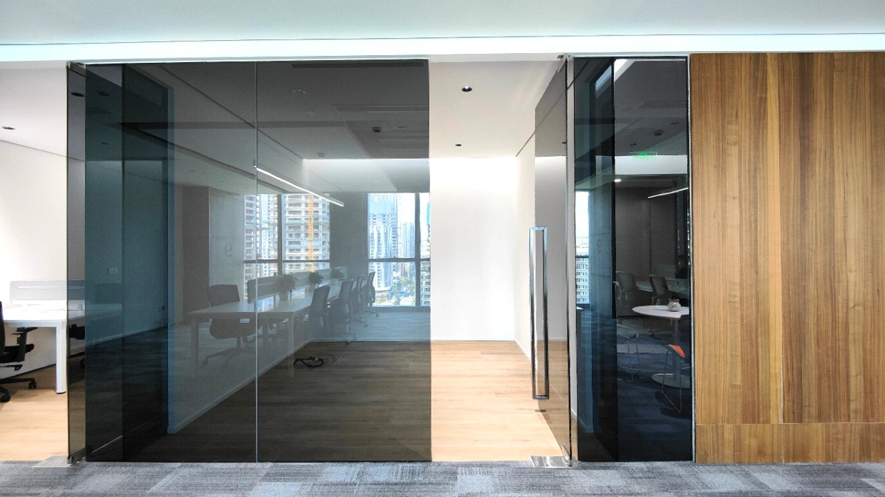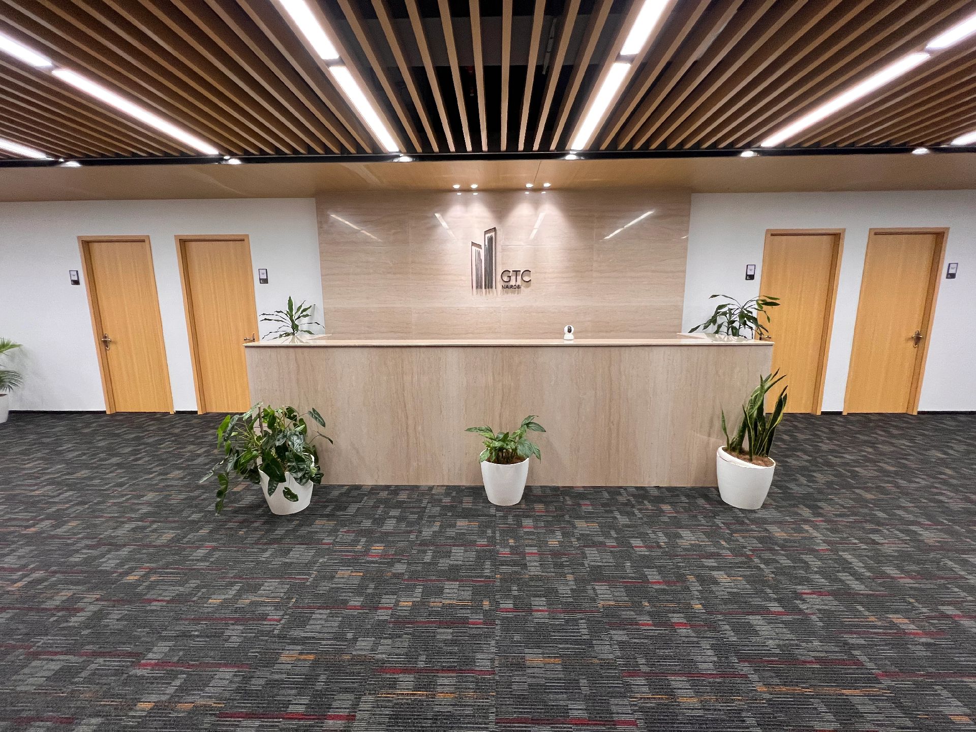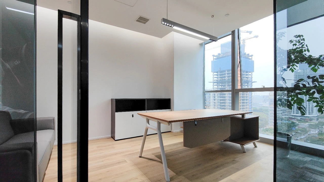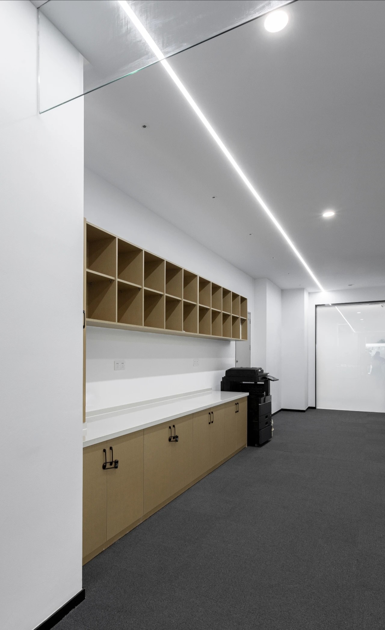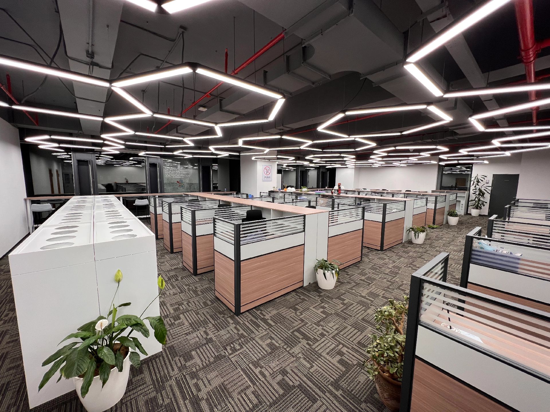 黑白色调的现代风格,室内的灯光与入口通道的设计理念一致,同样传递出科技未来的感觉。角落的绿植传递出生机与自然的力量。会议室选用的是一体式桌椅,提升空间利用率,让该空间可以容纳更多的参会人员。所有的椅子都是可移动的,为会议提供更多可能性。