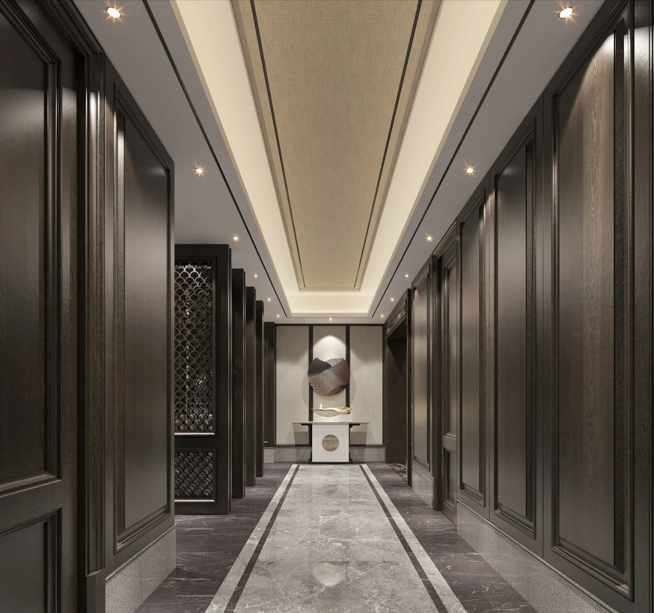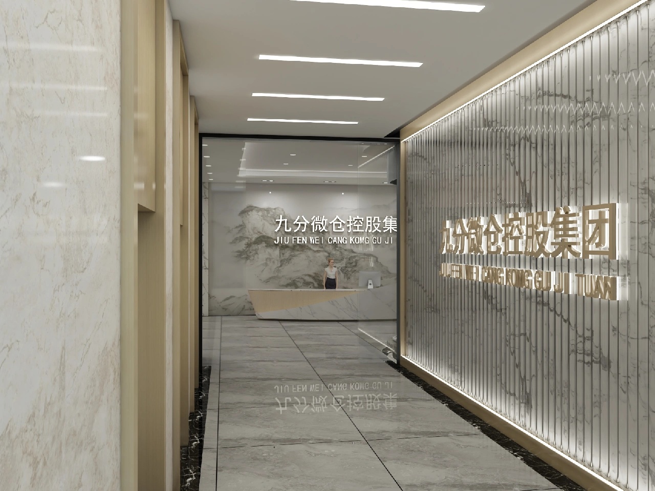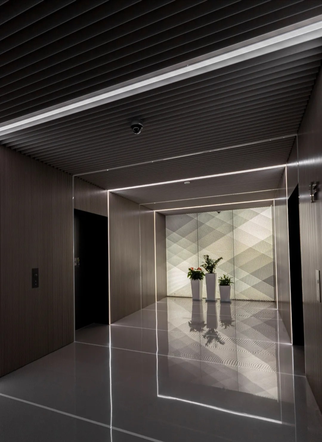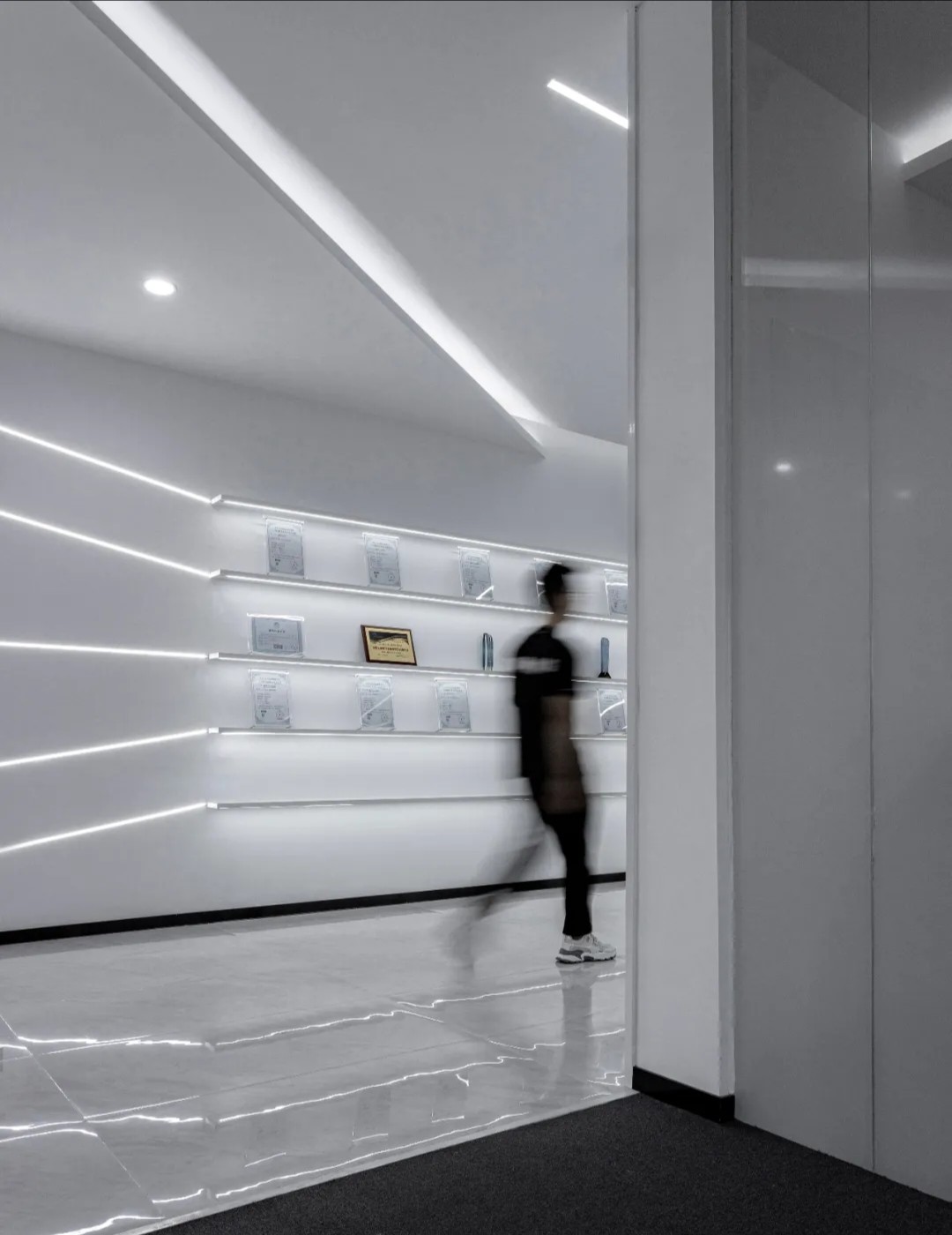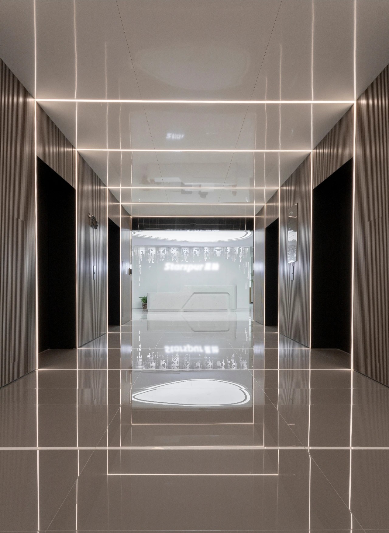 墙面和天花板设置长条形灯管,搭配透亮的纯色大理石地板,让同一层的光线组成了方正的矩形。等距离布置这些灯管,既能照亮整个通道,又展现出层层递进的科技感。