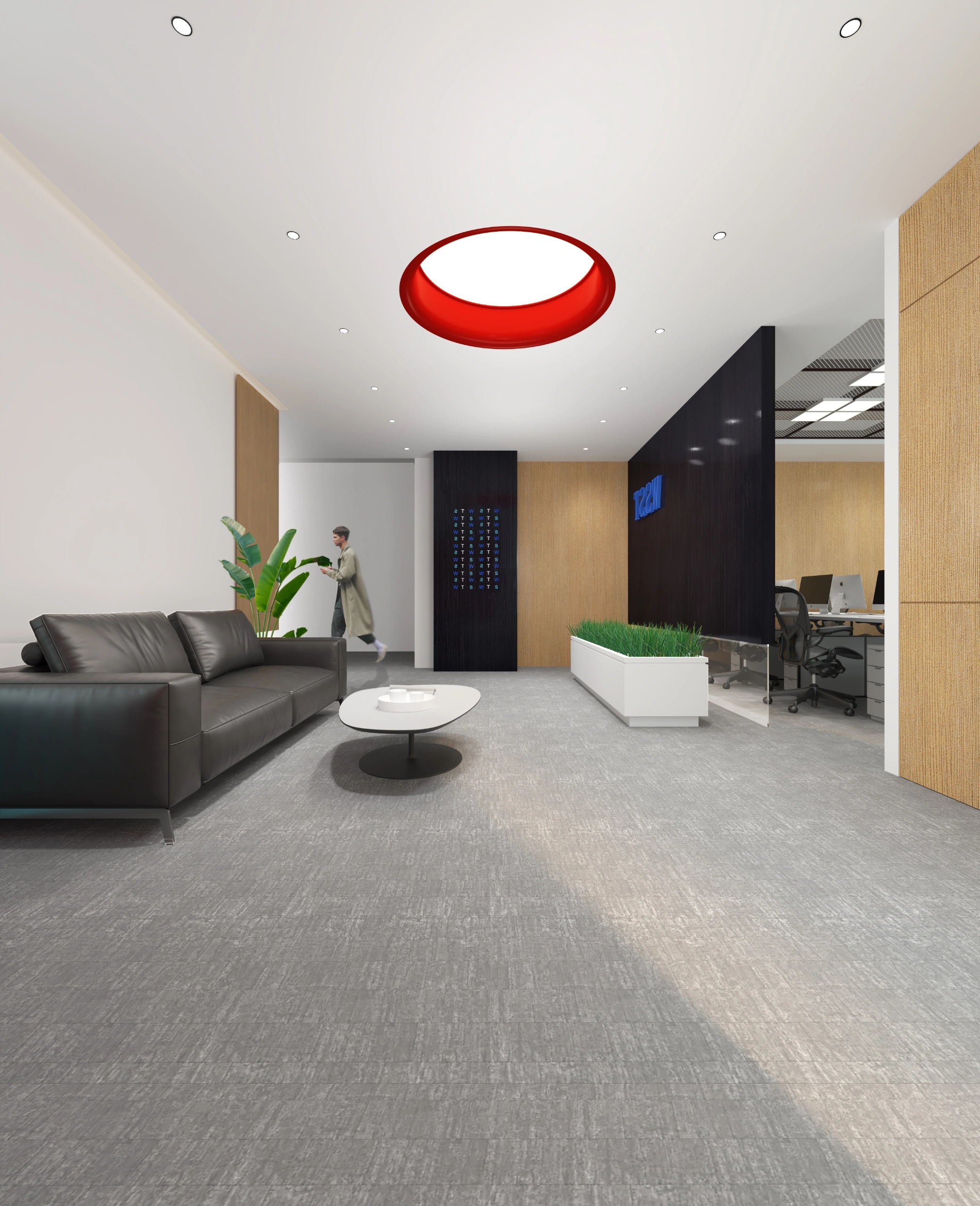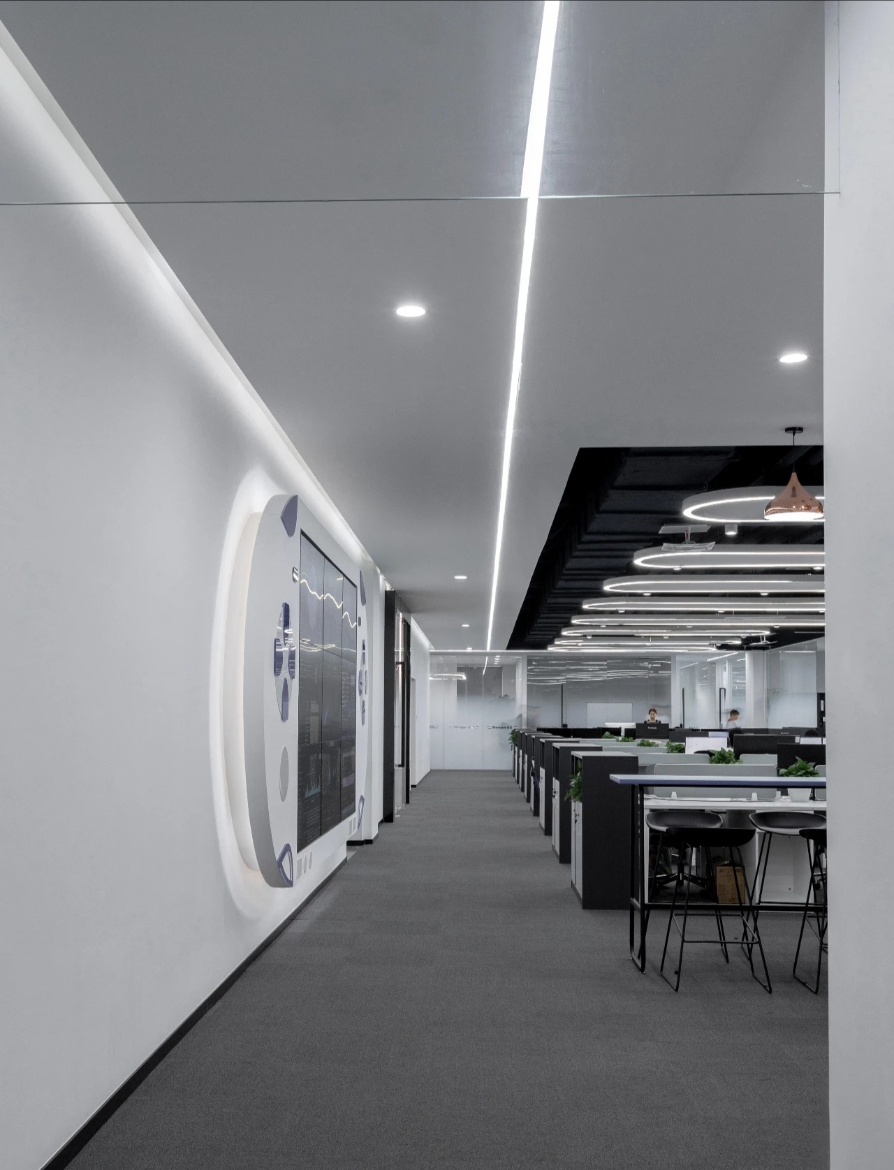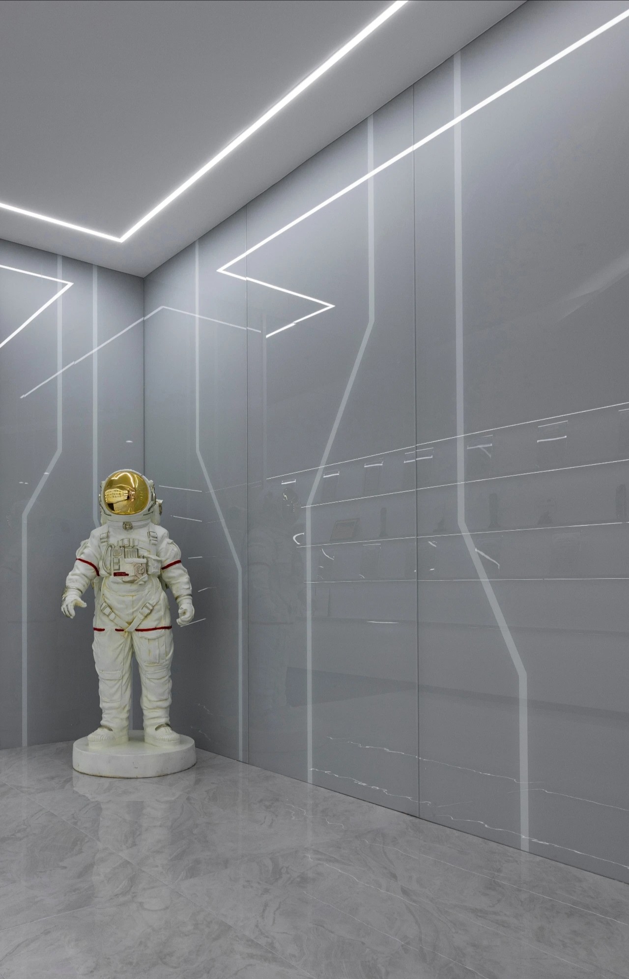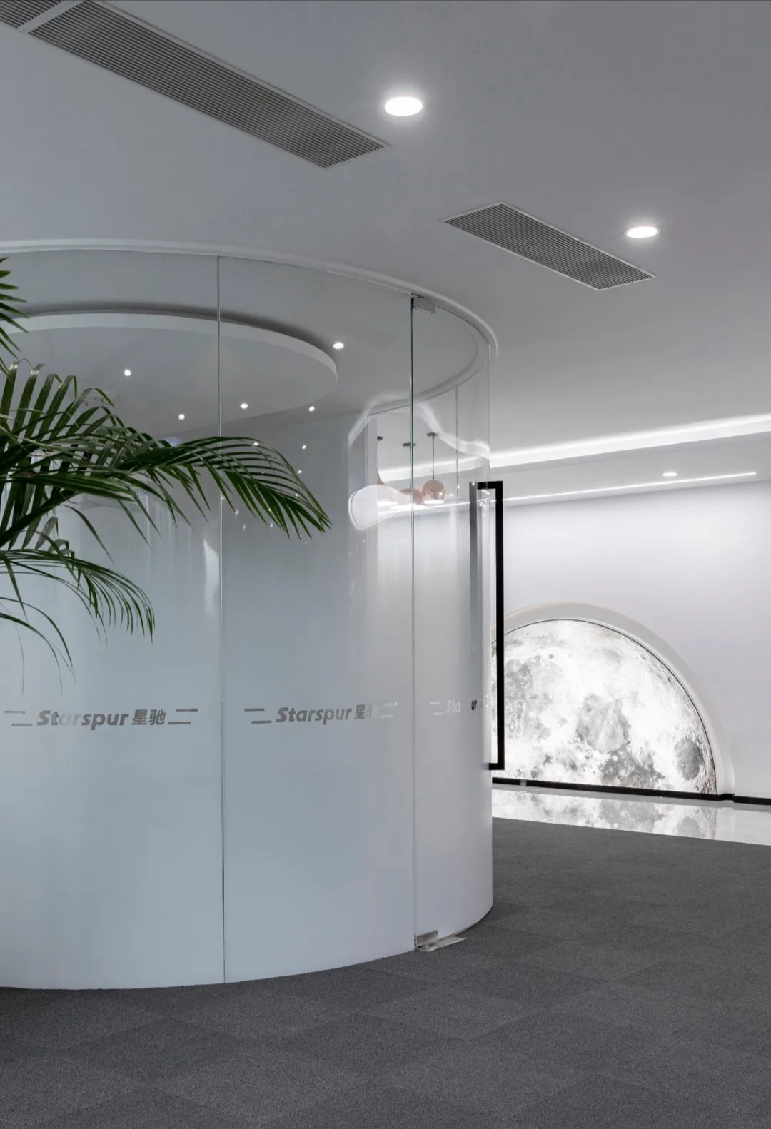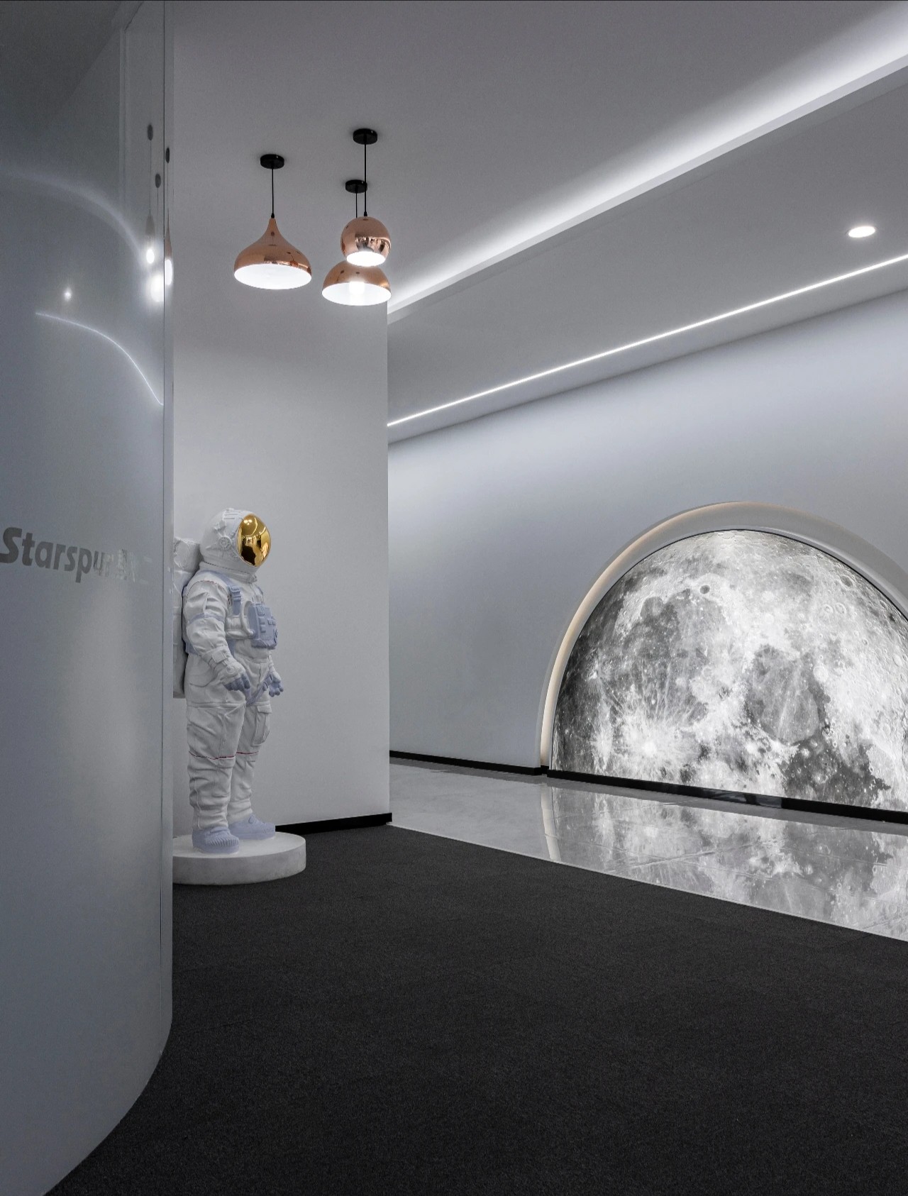 宇宙元素则成为了展现这一愿景的最佳选择。进入公司大厅就可以看到角落里的宇航员形象以及对面的星球装饰灯墙。室内整体采用黑白灰三色,色彩高级且具有科技感。深灰色地毯将空间进行分割,过道选用乳白色大理石,颜色差异明显,为使用者指引前进的方向。
