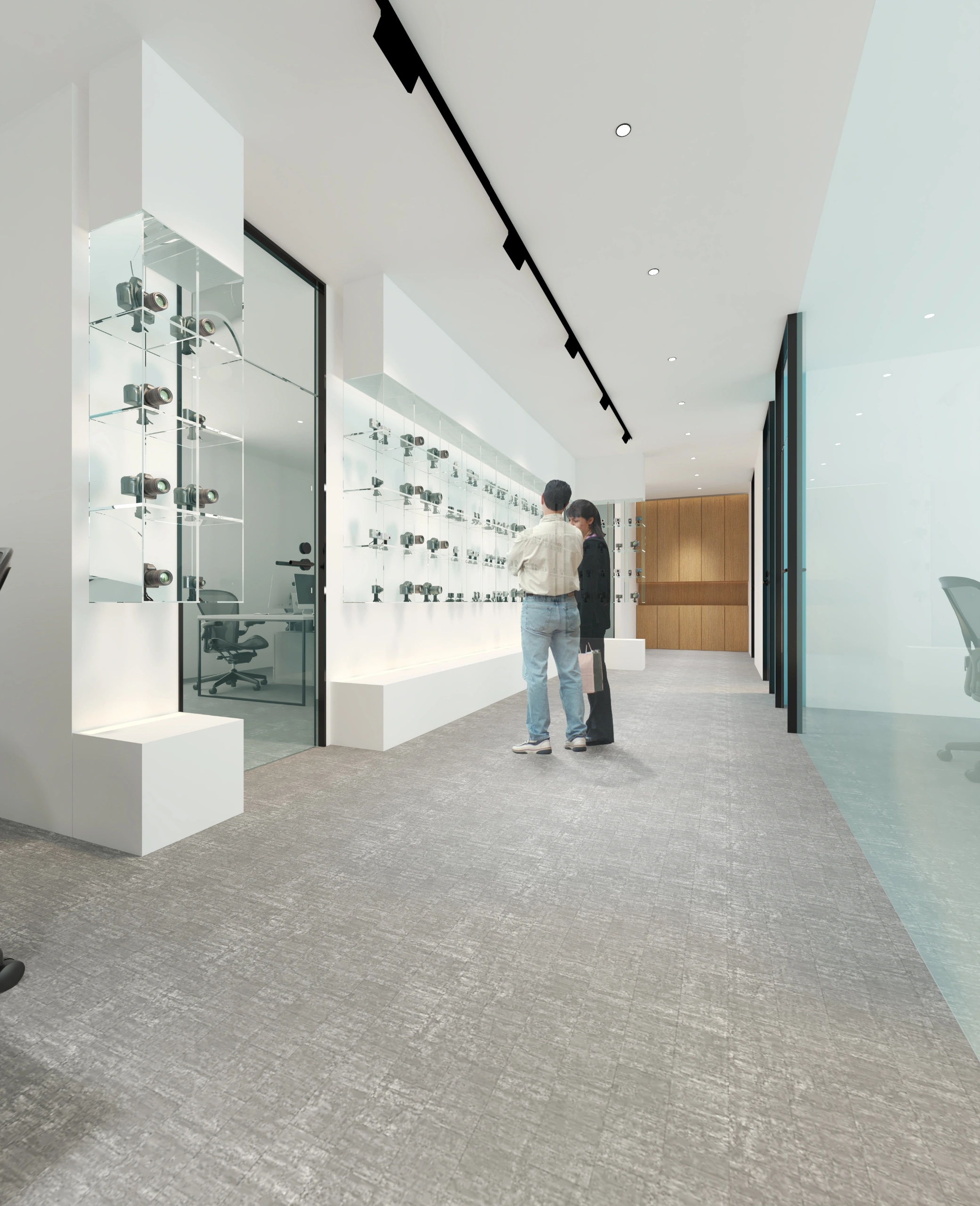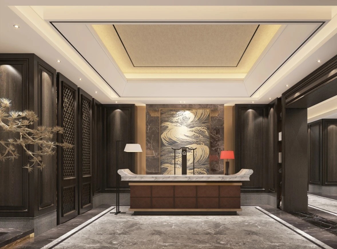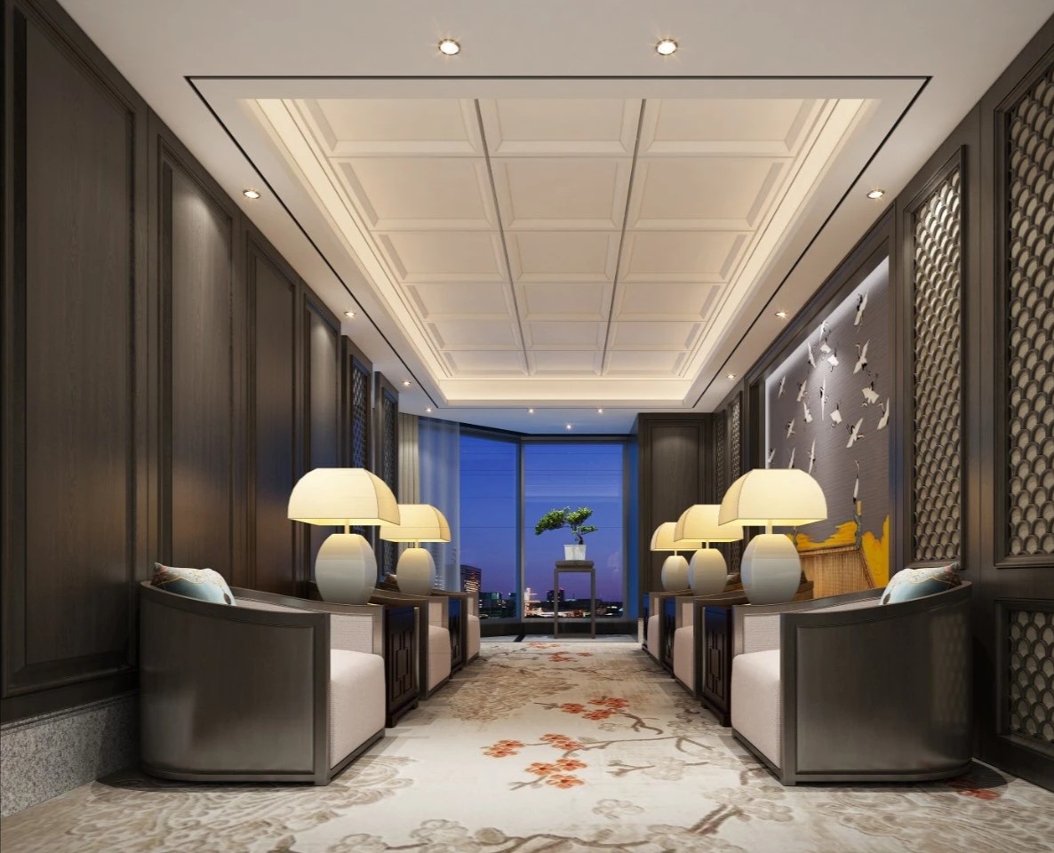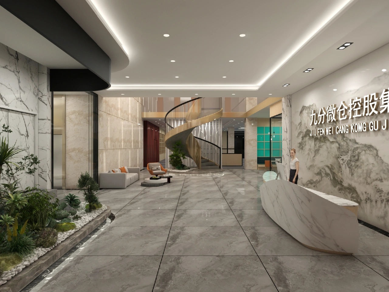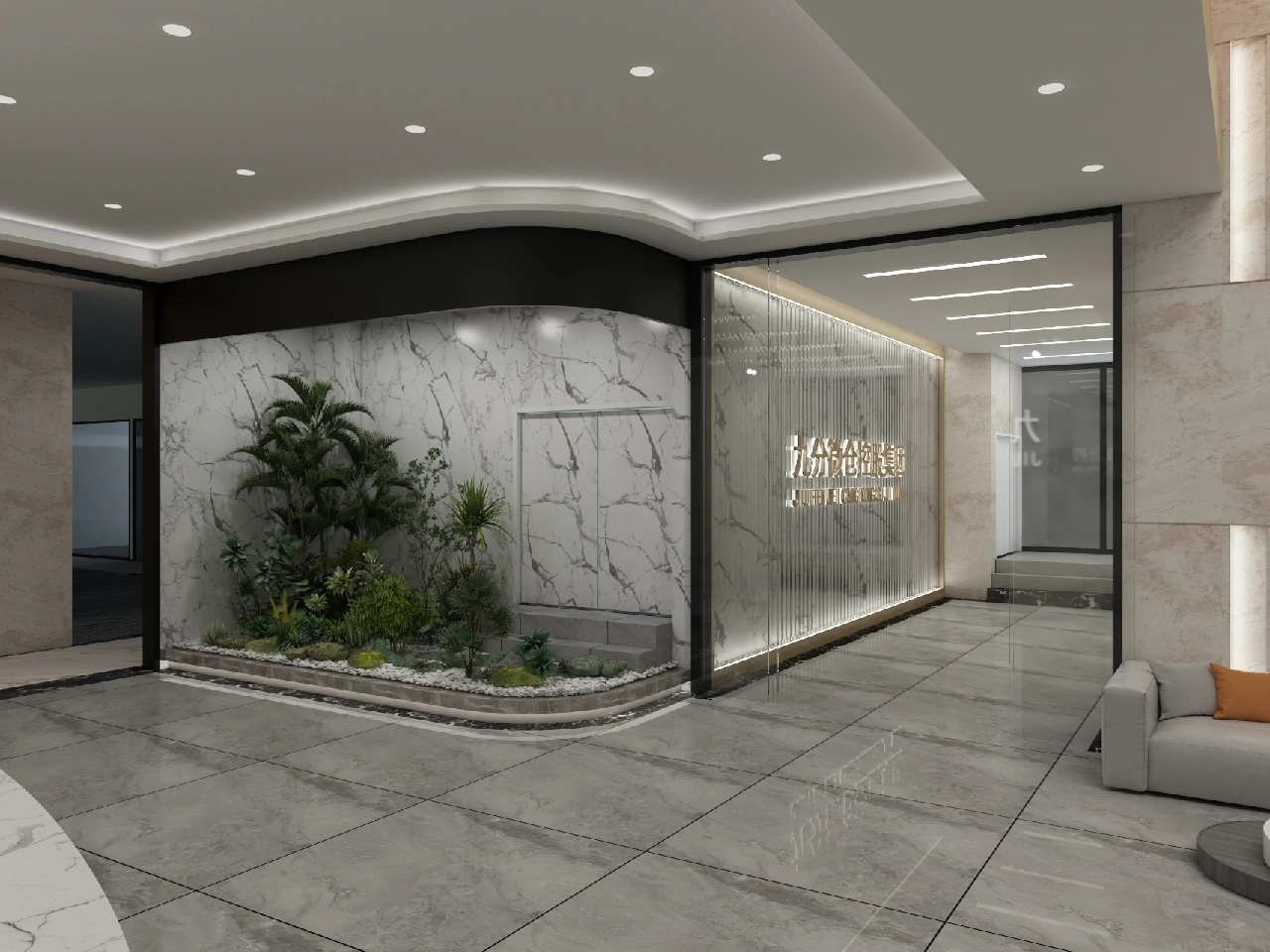 宇宙元素则成为了展现这一愿景的最佳选择。进入公司大厅就可以看到角落里的宇航员形象以及对面的星球装饰灯墙。室内整体采用黑白灰三色,色彩高级且具有科技感。深灰色地毯将空间进行分割,过道选用乳白色大理石,颜色差异明显,为使用者指引前进的方向。