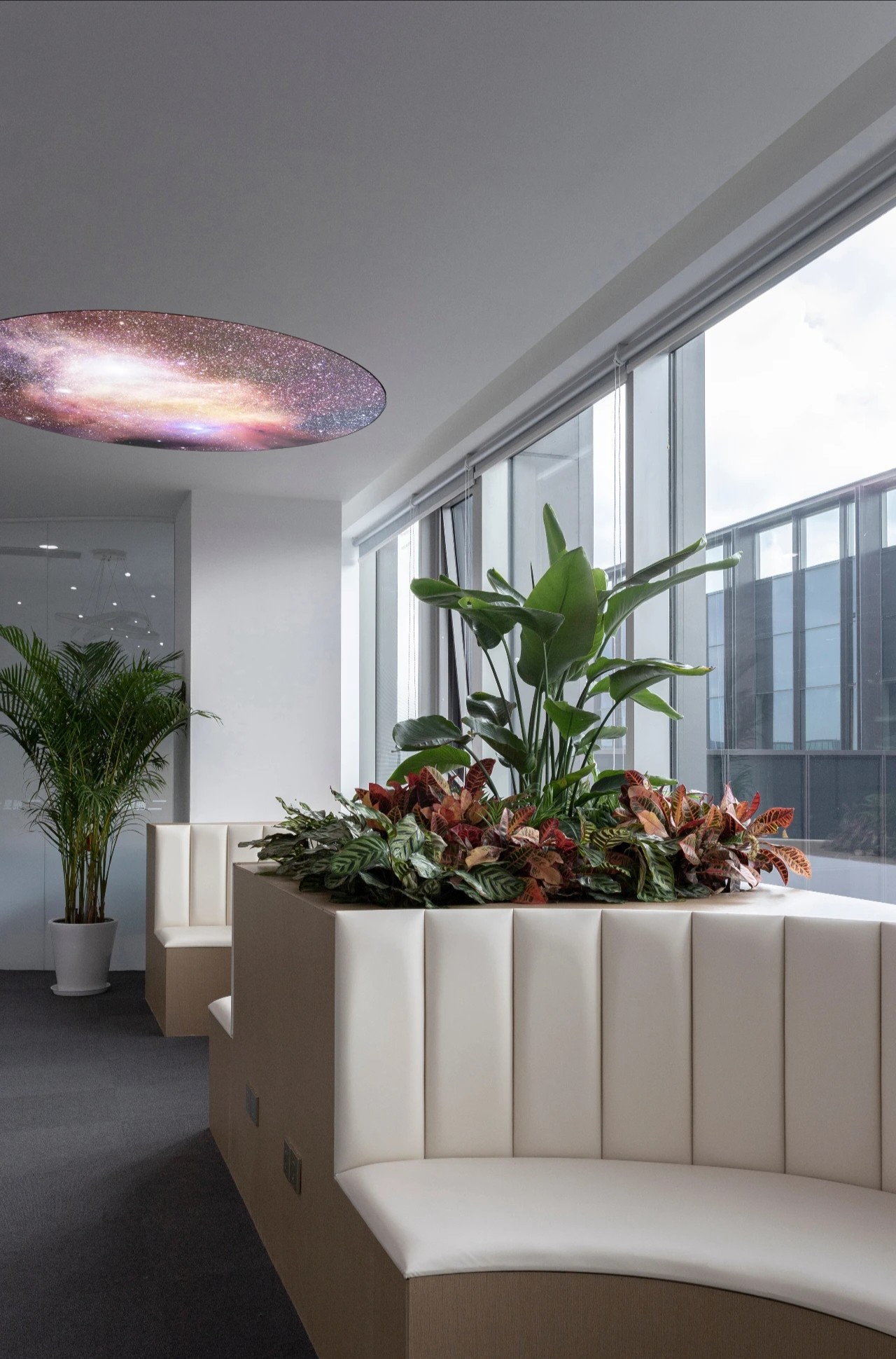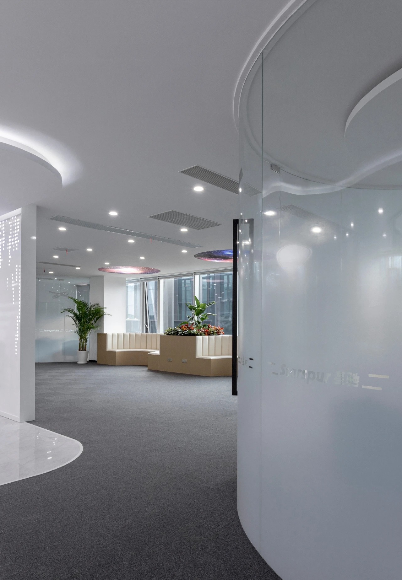 洽谈区设计2块大型圆形空间,呼应星际未来的主题设计,圆形面环窗视野极佳,内部的设计充满未来感,半透明的视觉感充满对未知的探索,不管是内部同事或者外部人员到访交流,优秀的企业文化都会将其包围。
