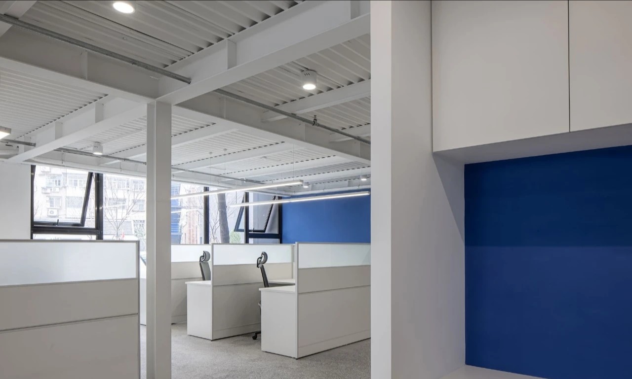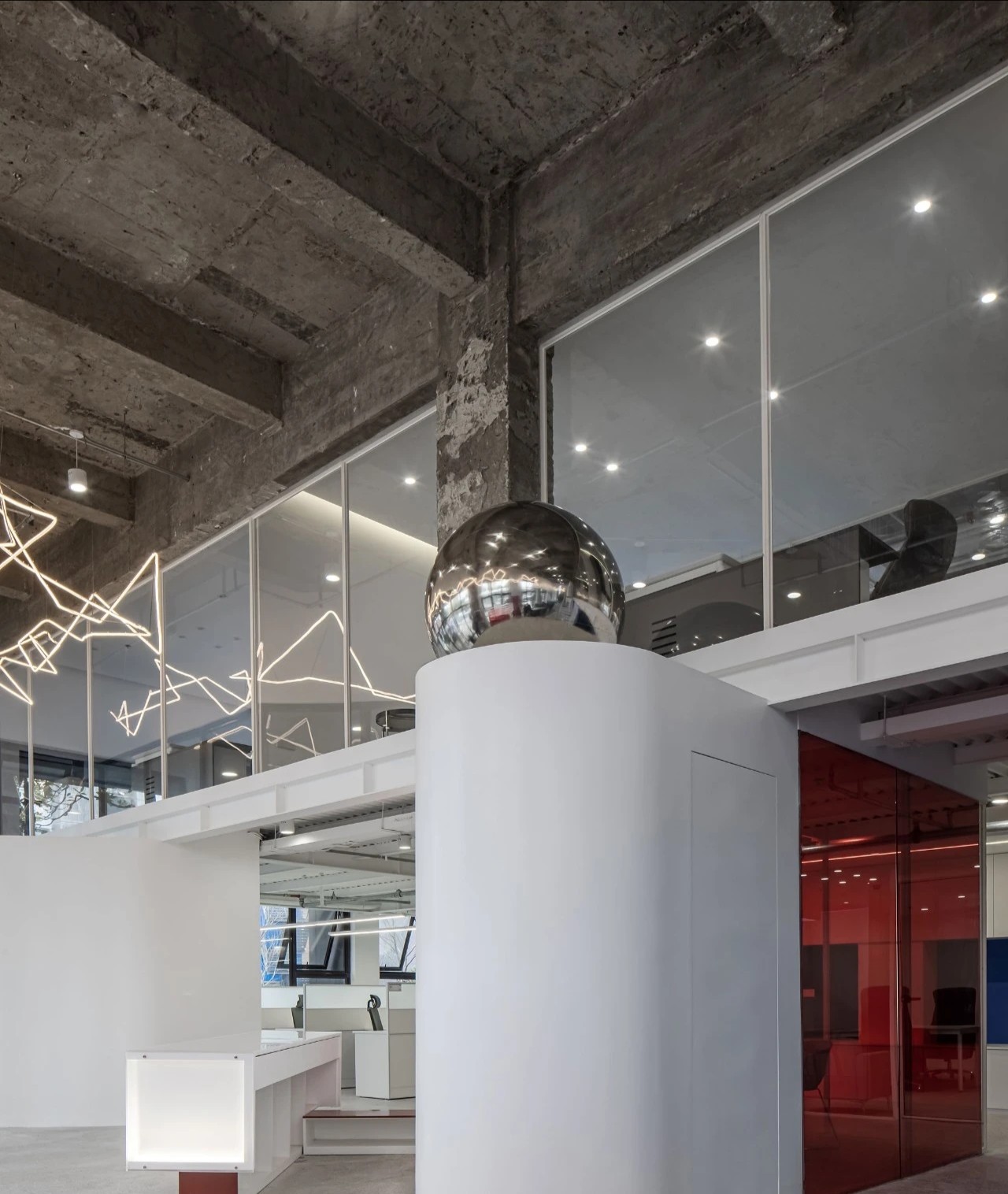设计上结合业主企业特点以及项目场地自身肌理,保留了原始建筑的顶面粗狂的混凝土顶,以及水磨石地面,办公室大面的材质都以白色基调为主,营造一种更具舒适的办公氛围。