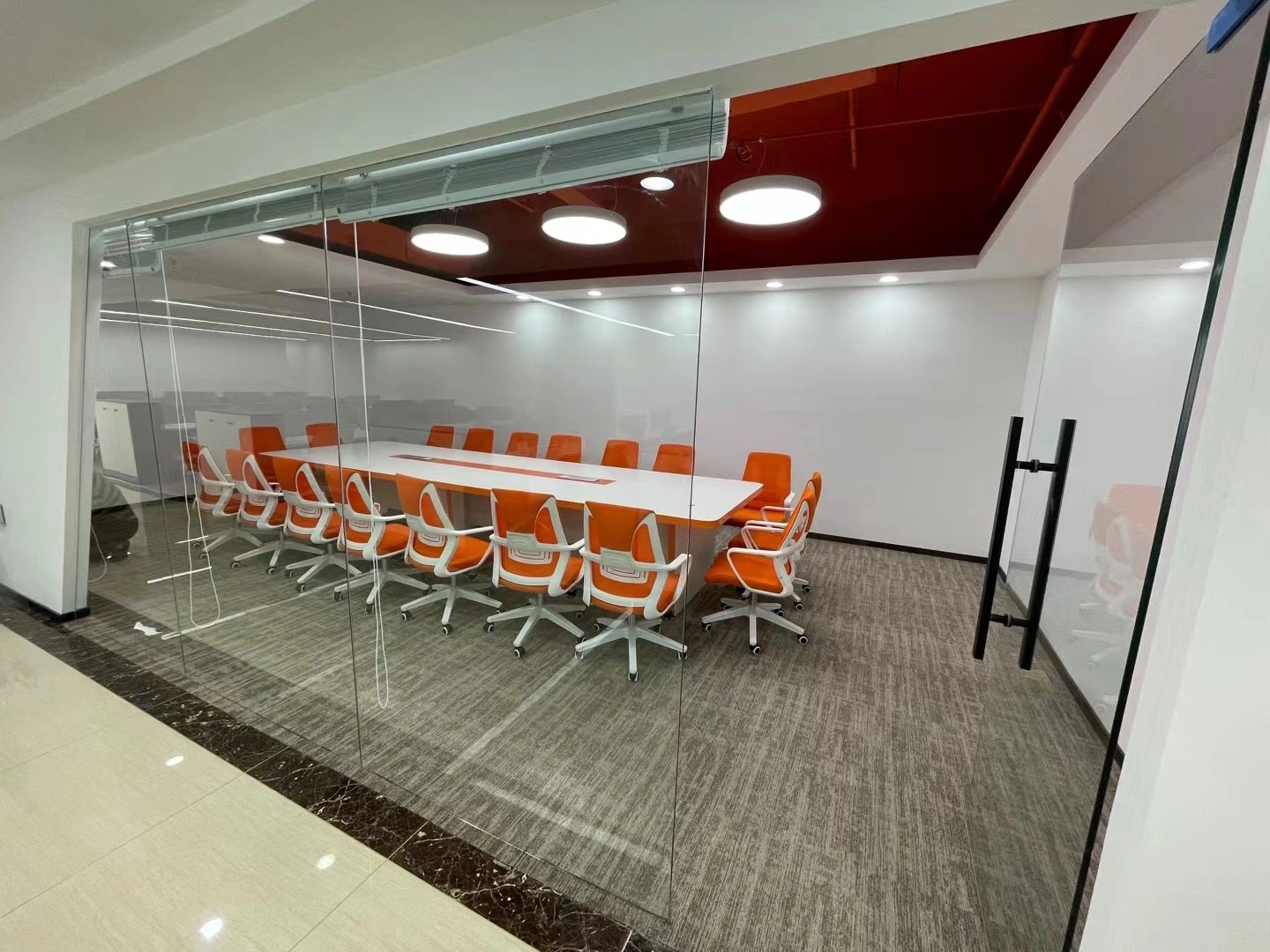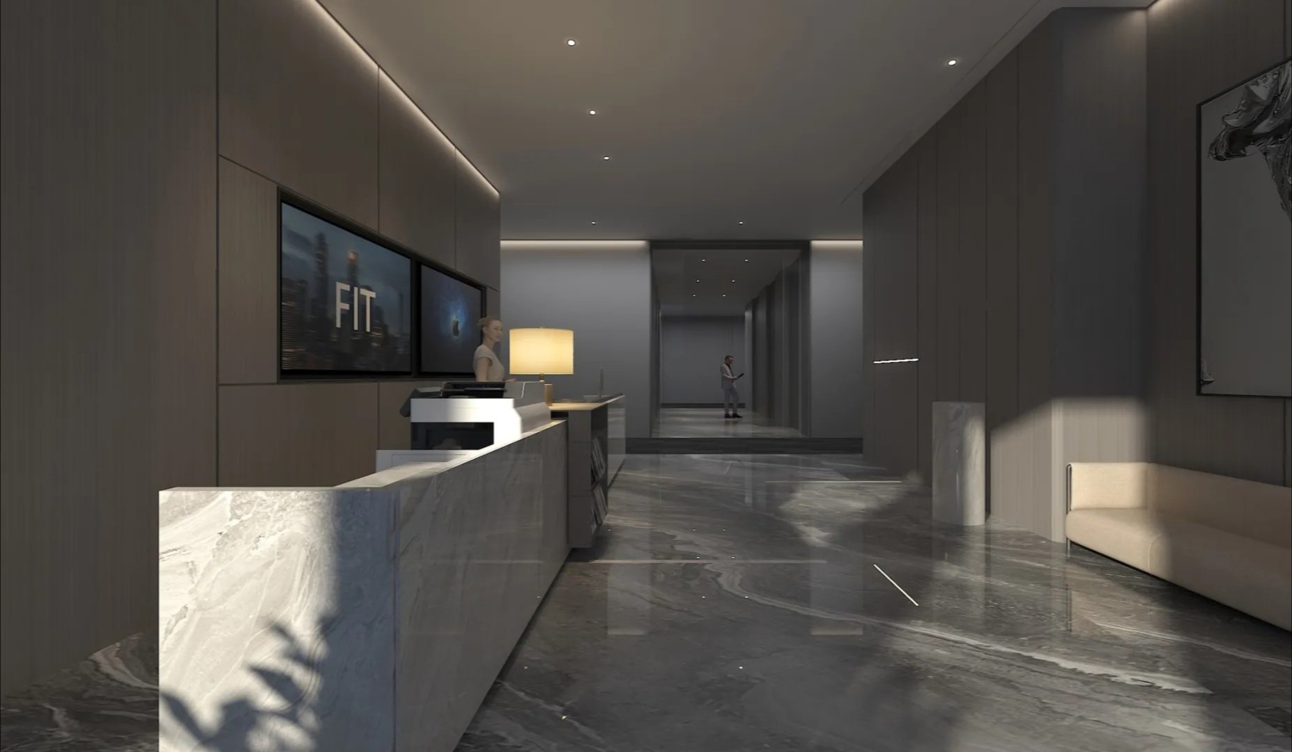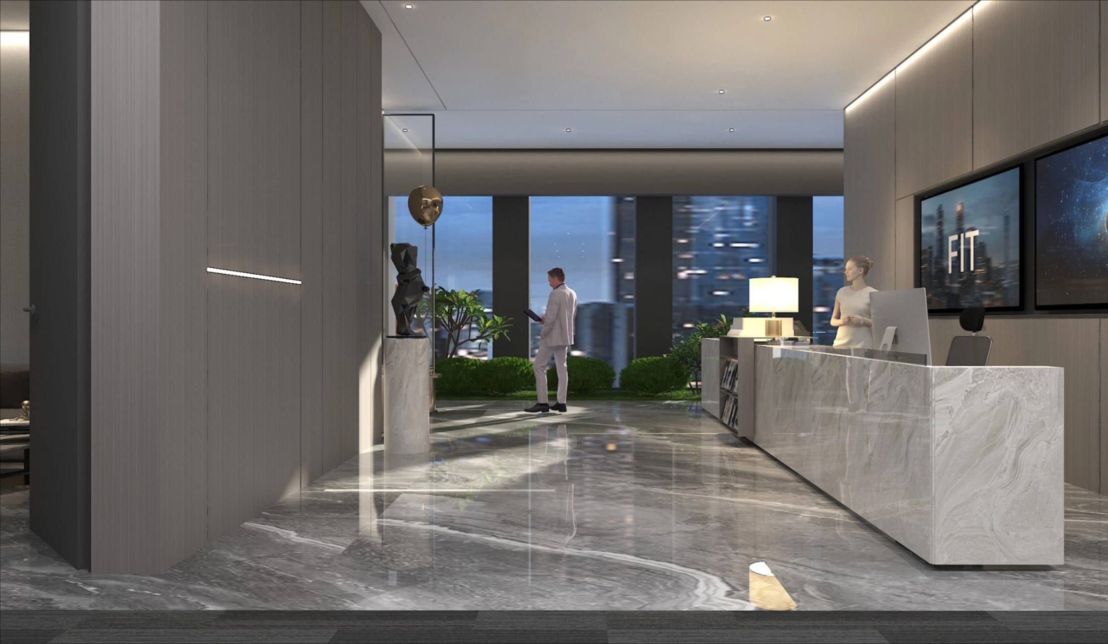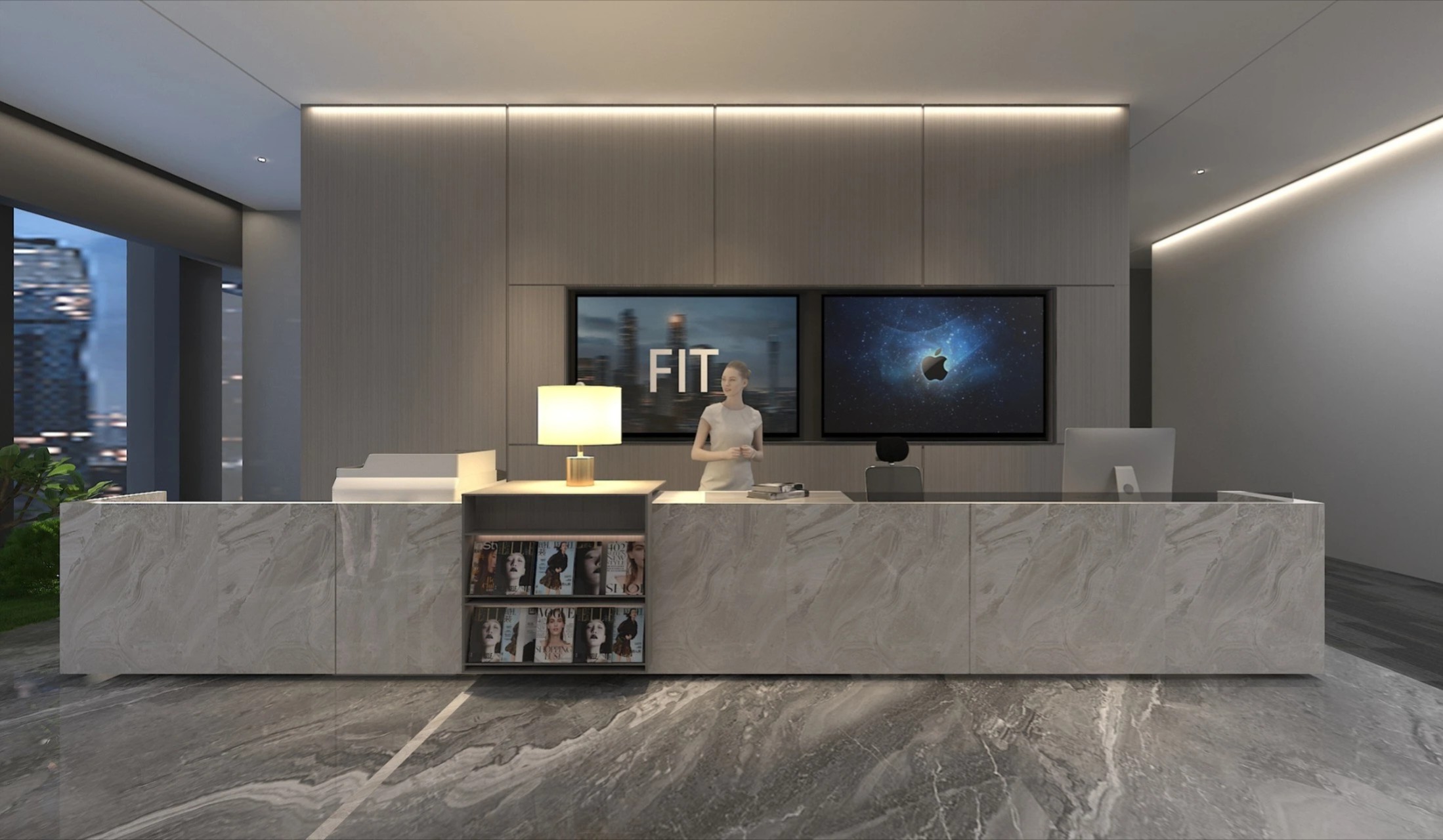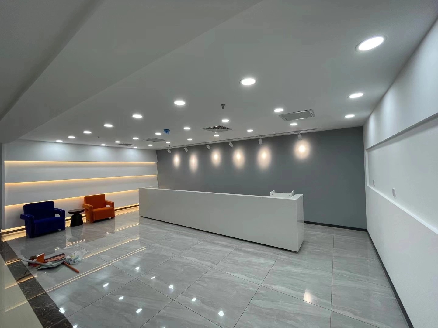 前台桌子用了亚克力的材质,结合暗藏线性灯,从前台开始就营造一种现代化的科技办公氛围