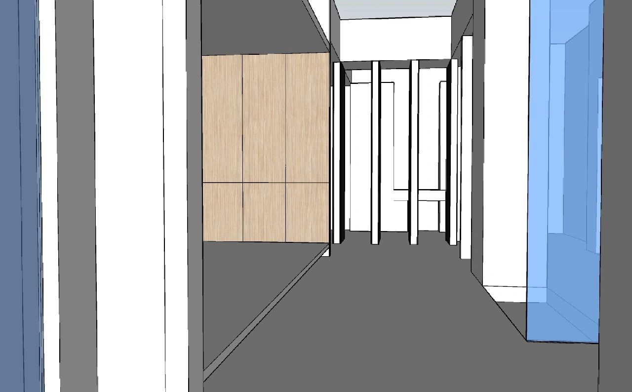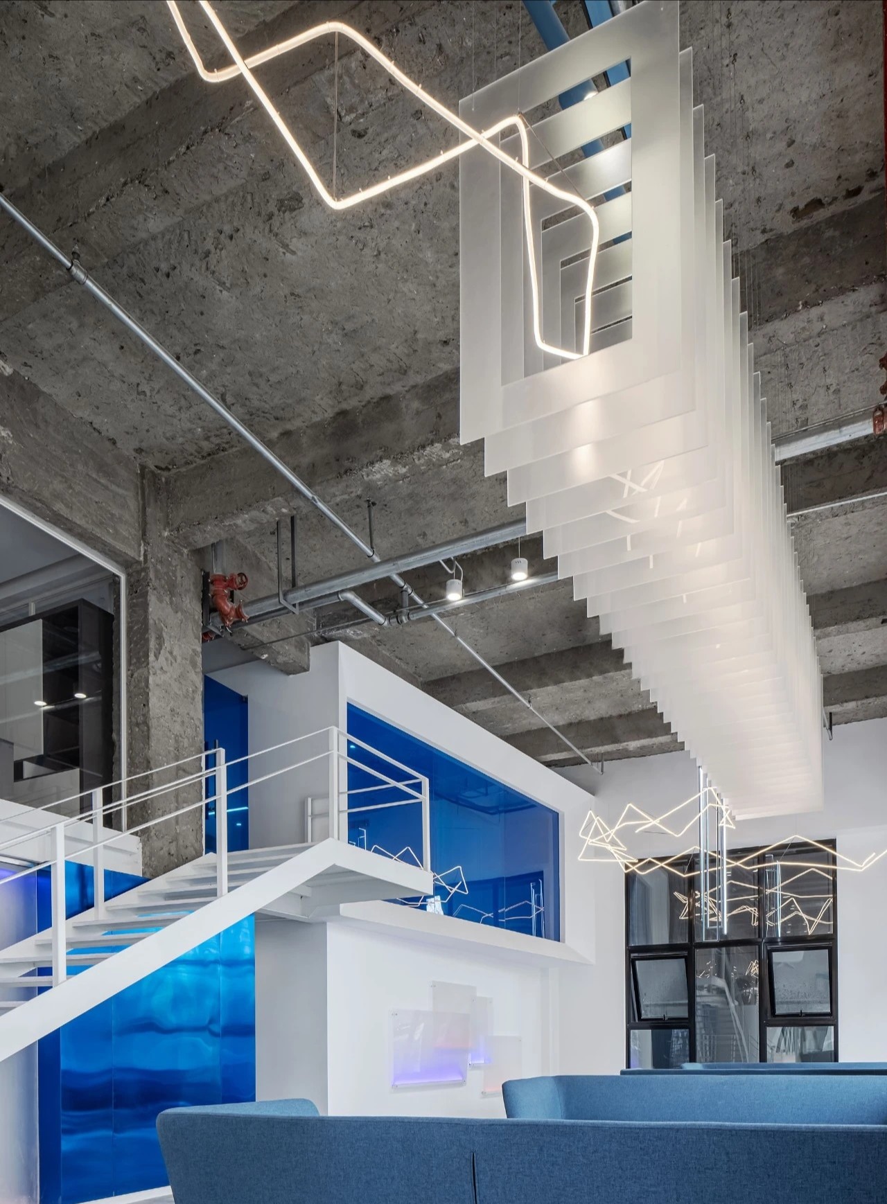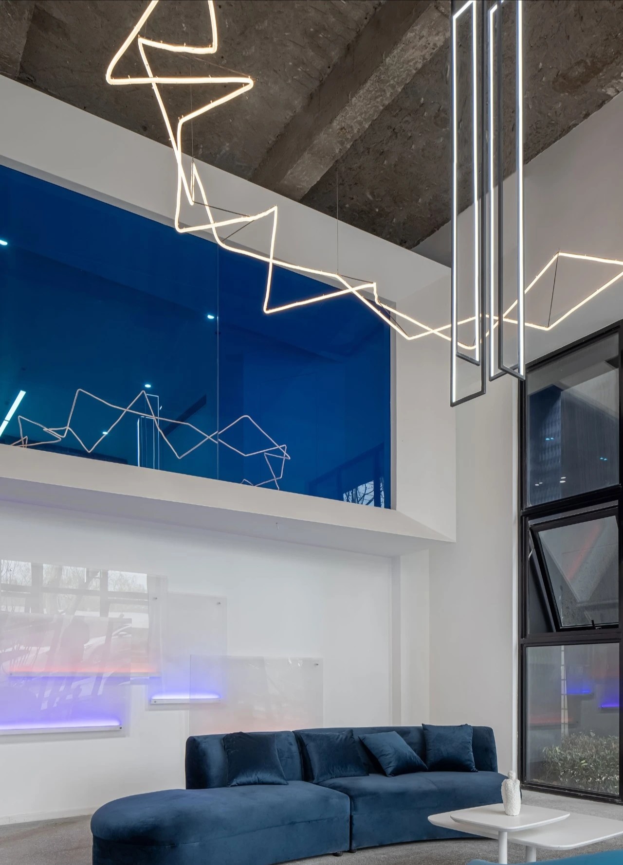 在挑高的休息接待区,我们利用钢筋结合灯带的方式设计了贯穿整个休息区挑空部分的装置线性灯,从光电效应中光子之间的碰撞得到灵感,两条灯带互相错落交织,在办公室顶面延伸。