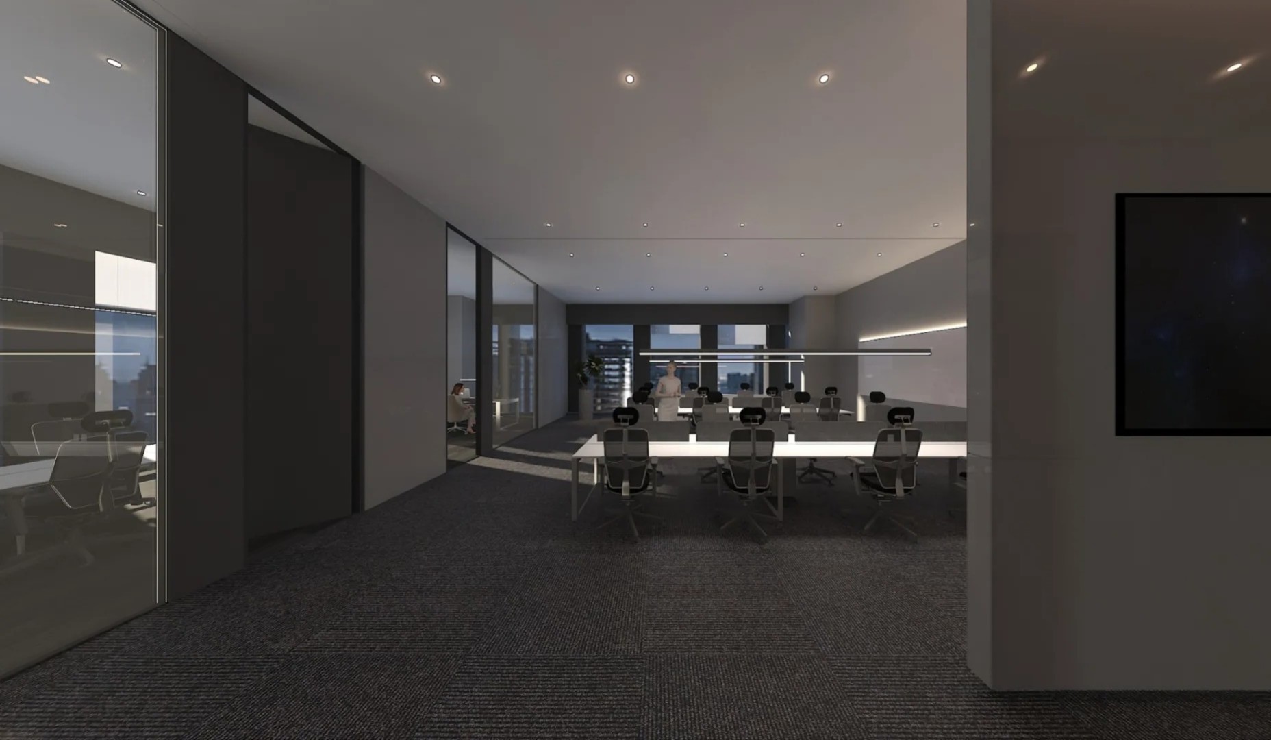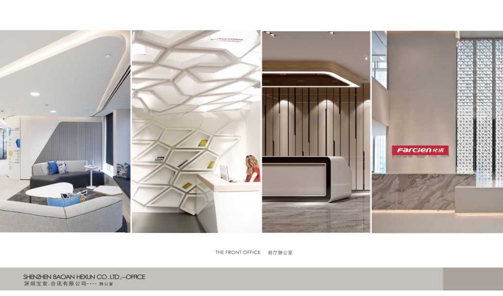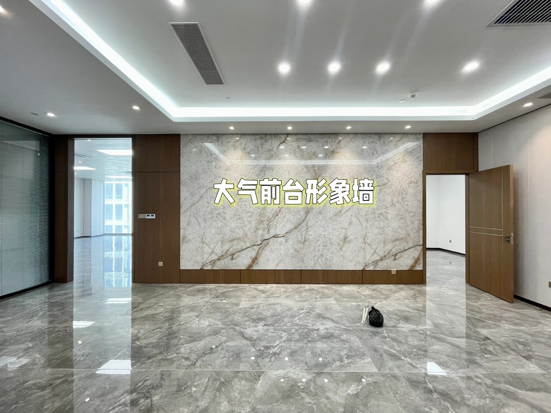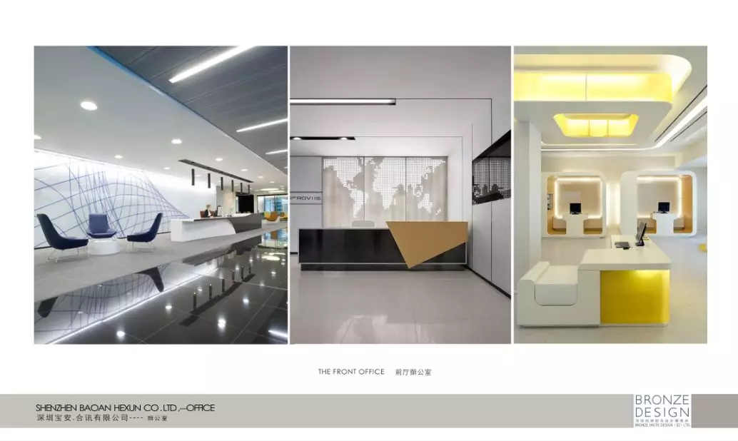 前台入口处的设计才用了弧线的墙面与接待桌形成一个整体,考虑到本身入口的角度,用弧线垭口让这种与整体平面形成夹角的入口形式起到一种引导的作用。大厅接待区是整个办公空间视觉设计感最强的地方,本身利用了空间的层高,让大厅本身有很强的的空间感,用装置艺术结合灯光增添一种科技氛围。彰显企业特点。