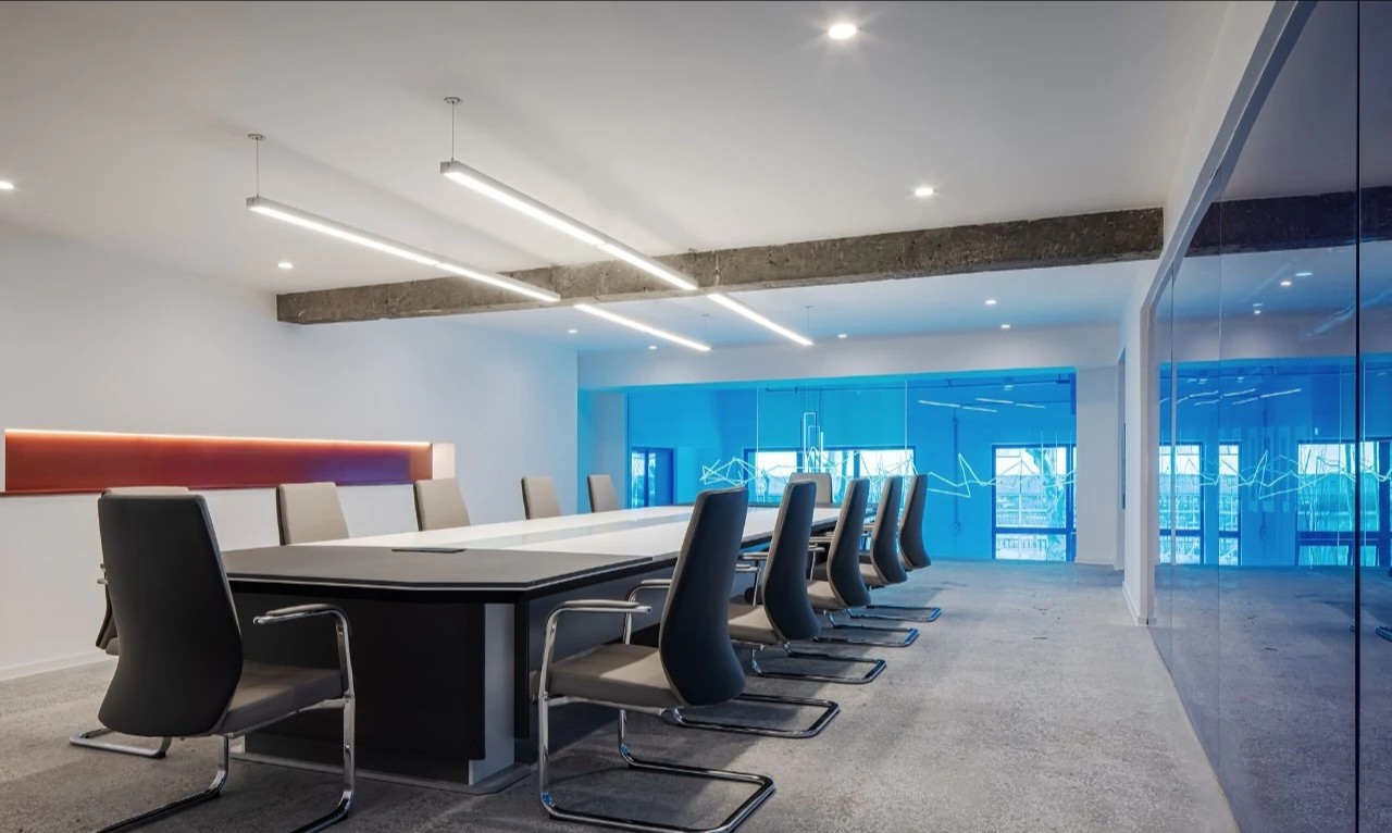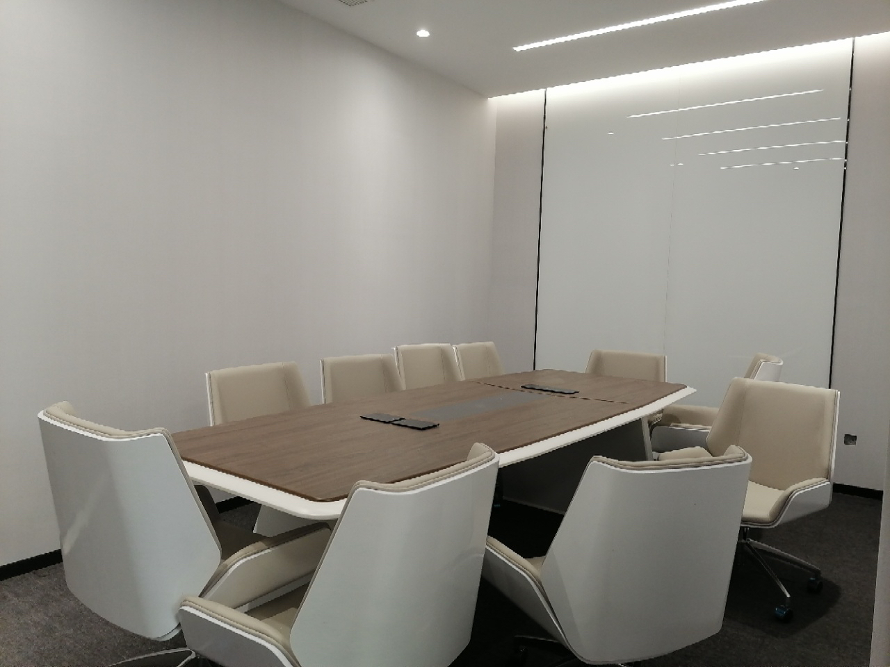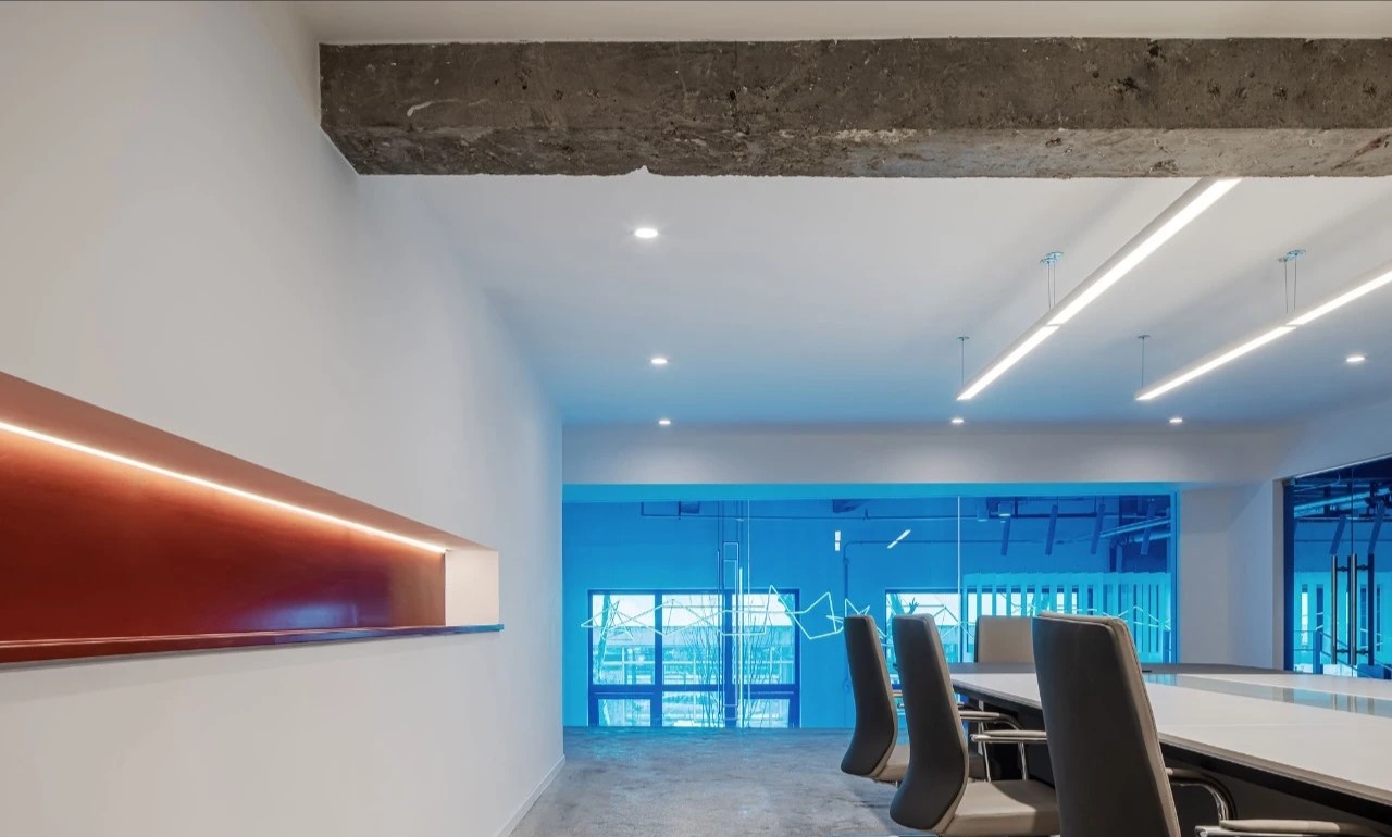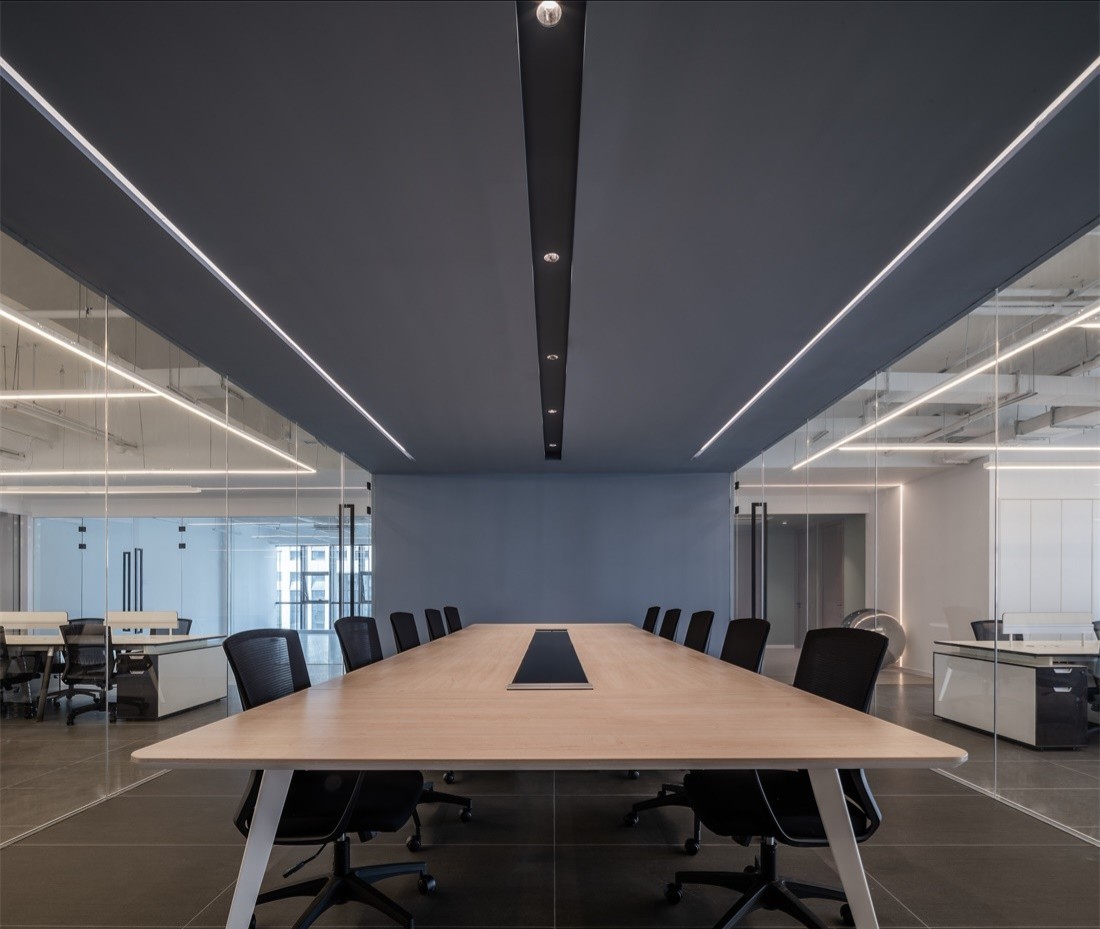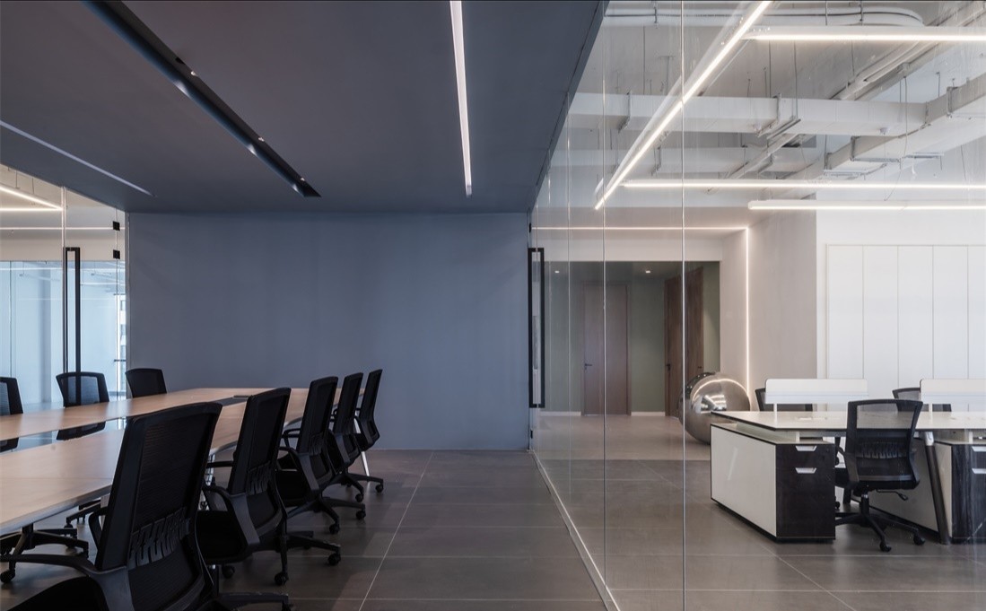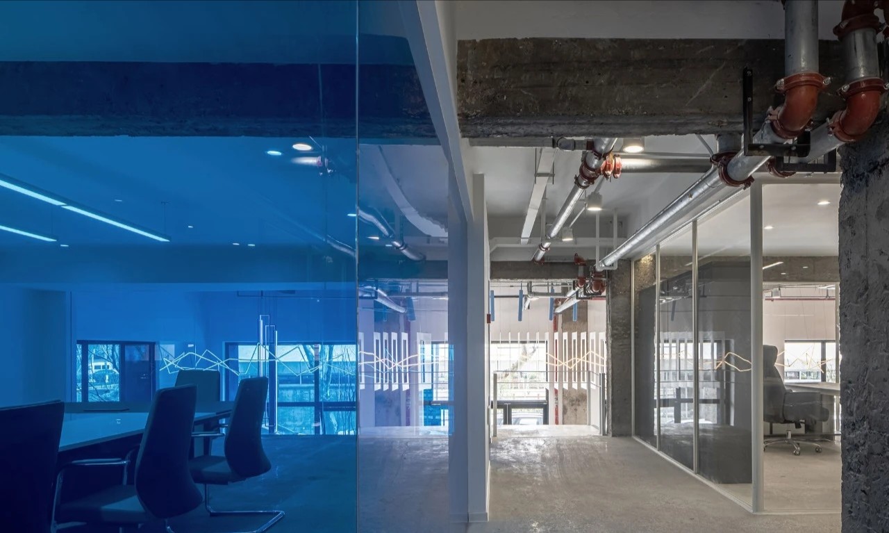 二楼会议室利用整面的蓝色玻璃墙体,也给整体空间增加了一种色彩以及质感上的亮点。