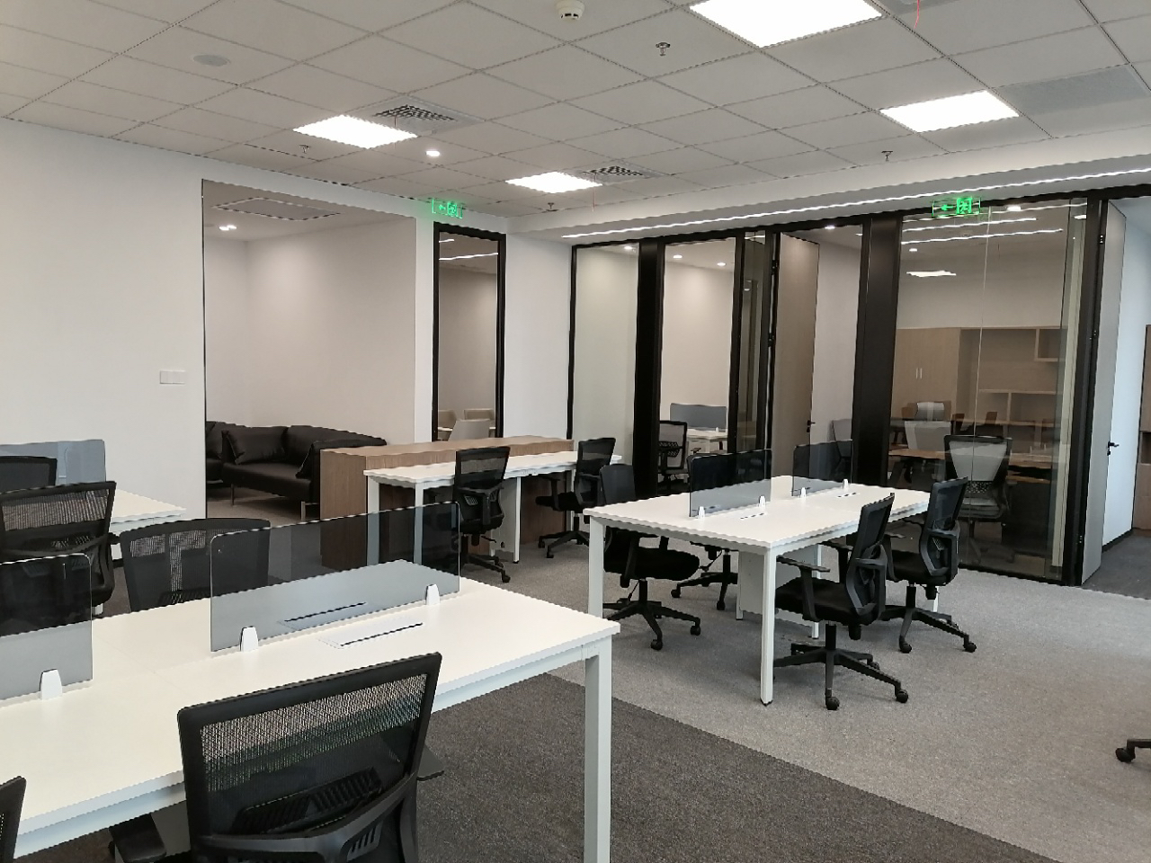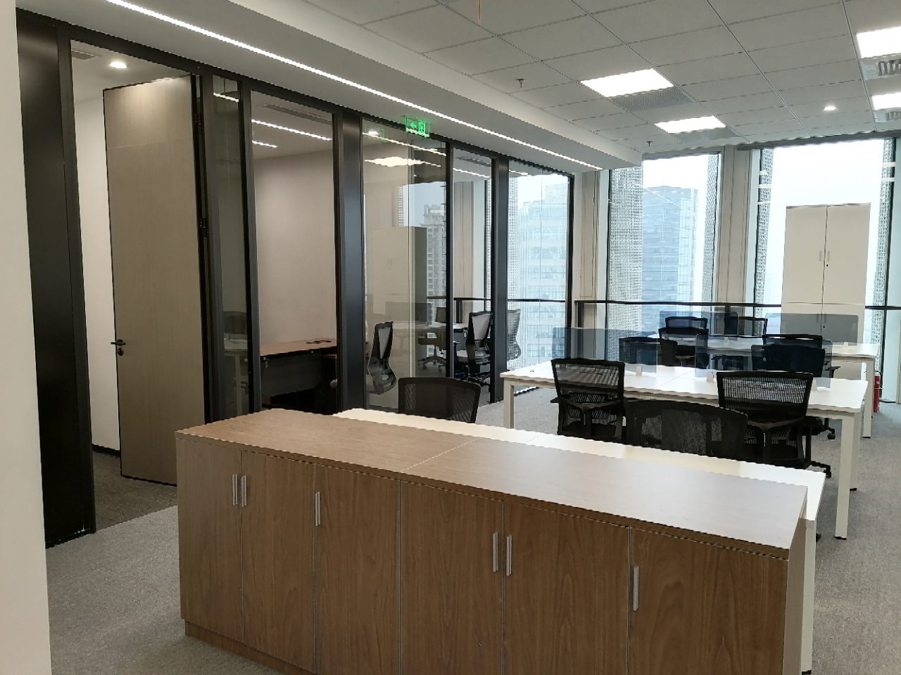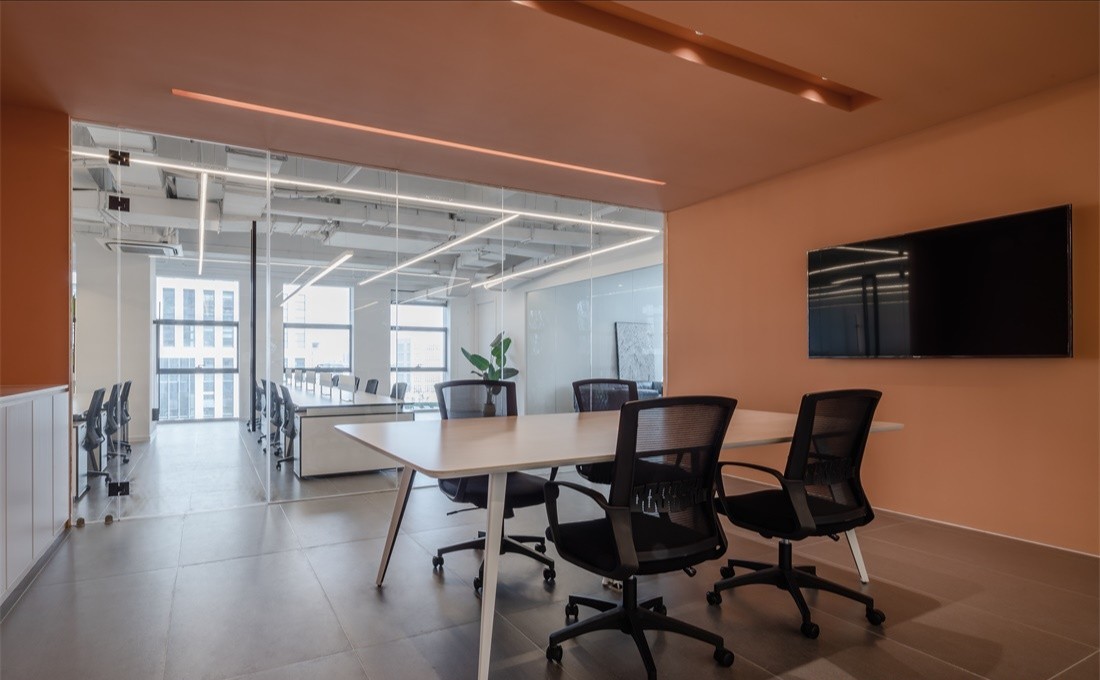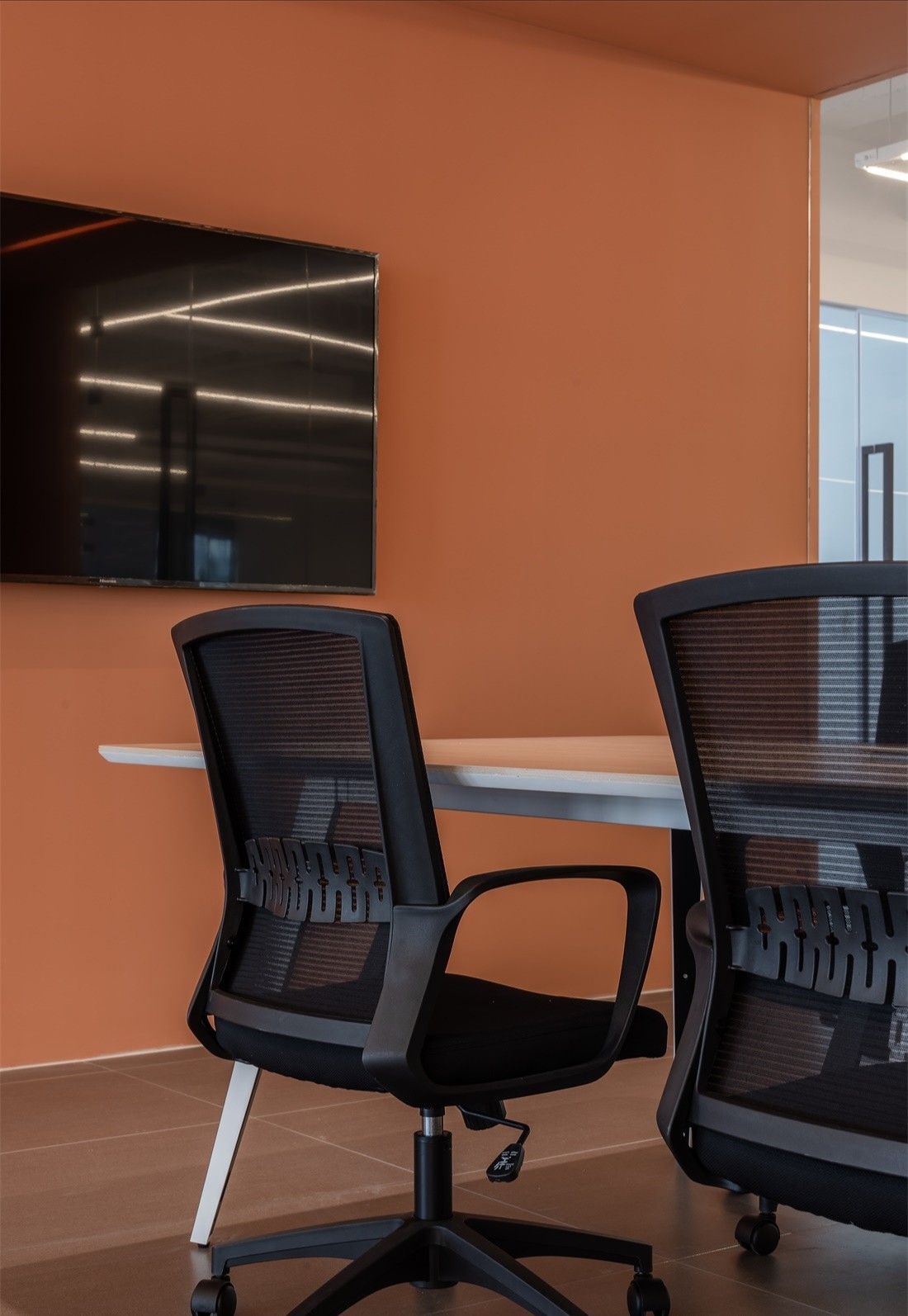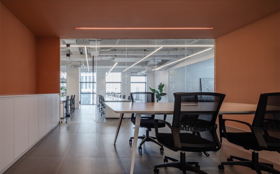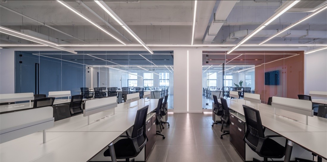 二楼会议室利用整面的蓝色玻璃墙体,也给整体空间增加了一种色彩以及质感上的亮点。