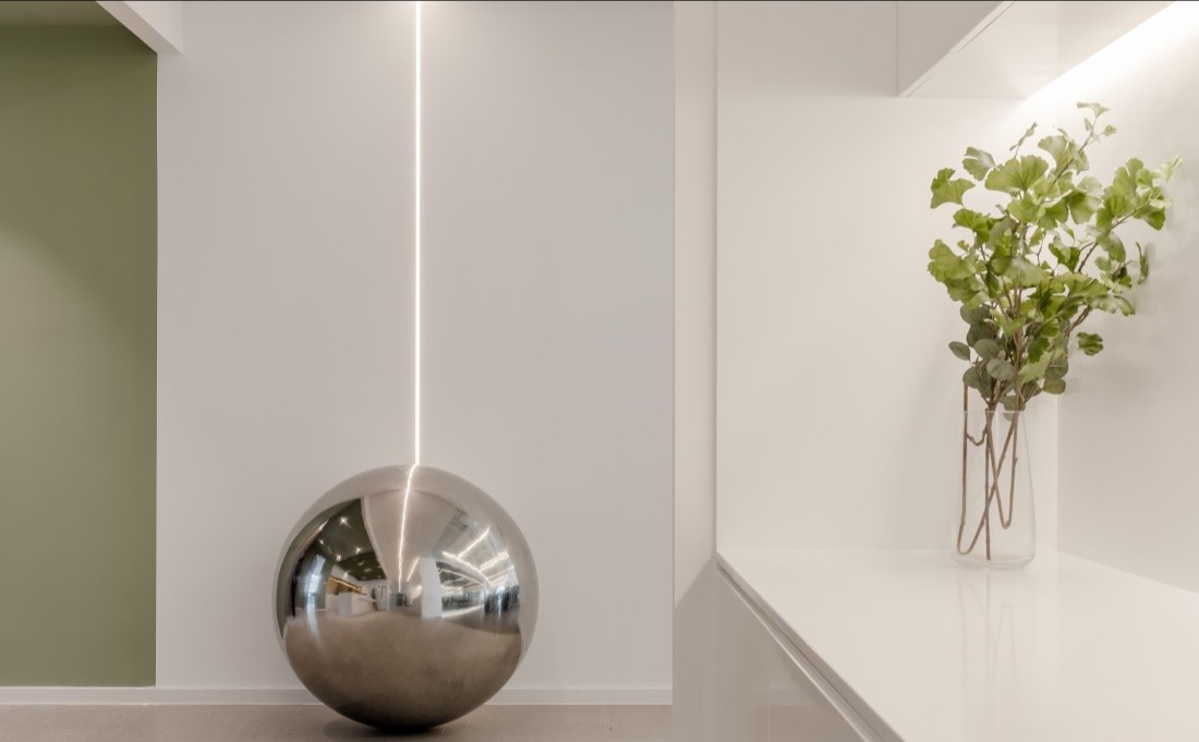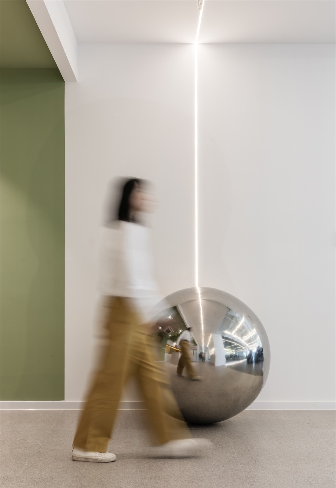 光面装饰球如同某种装置,为空间注入艺术感和叙事性,球面的反射效用在视觉上深入到空间内部,仿佛与空间以及空间中行走的人进行趣味对话和互动。