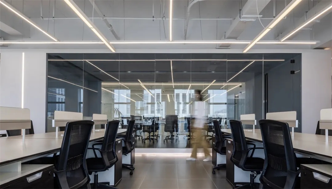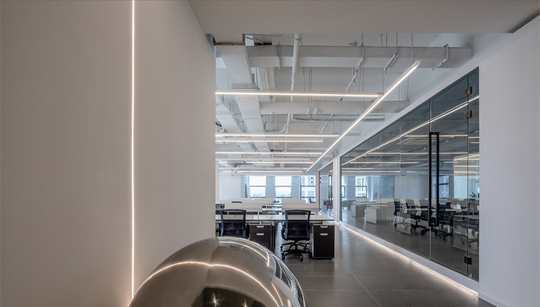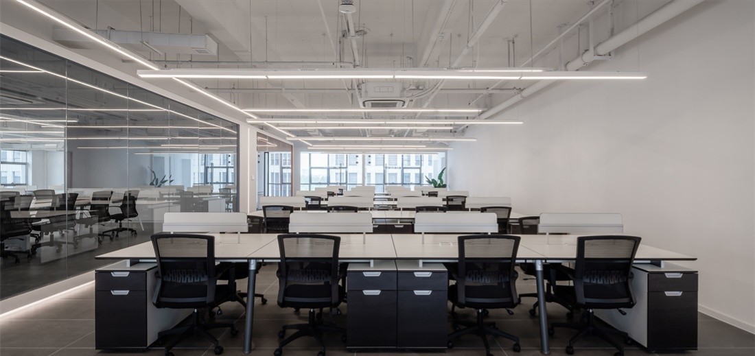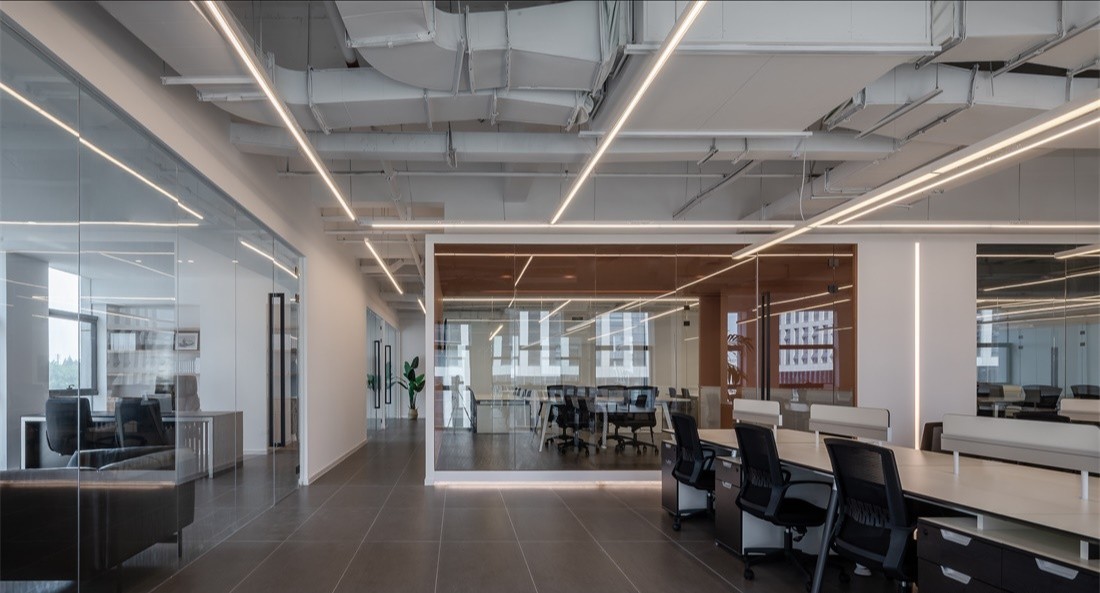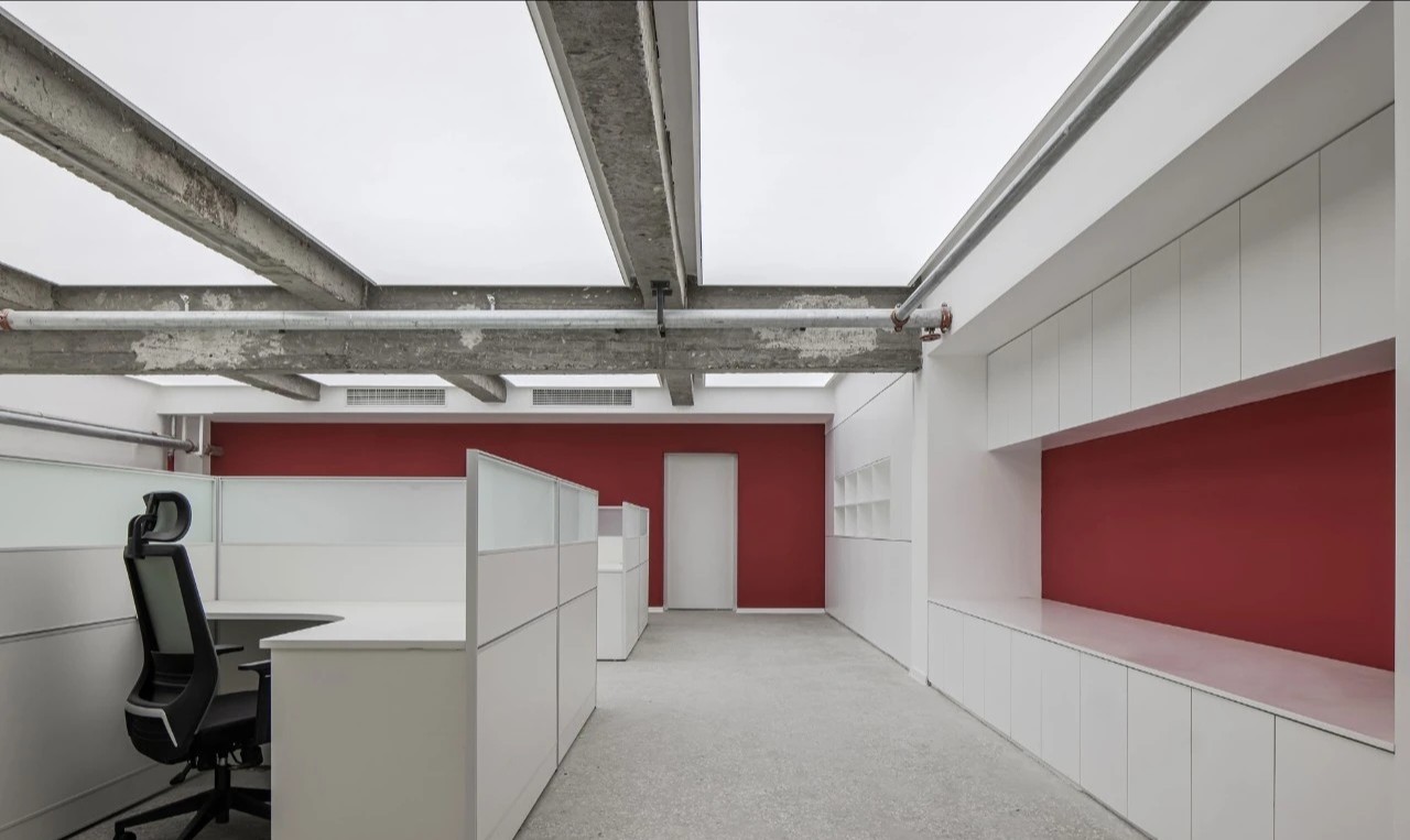 二楼办公区域,因为层高较矮采光较弱的缘故,采用了大面积的平面灯,用整面的发光膜结合原始梁体,最大限度的弱化顶部给办公环境带来的压迫感。