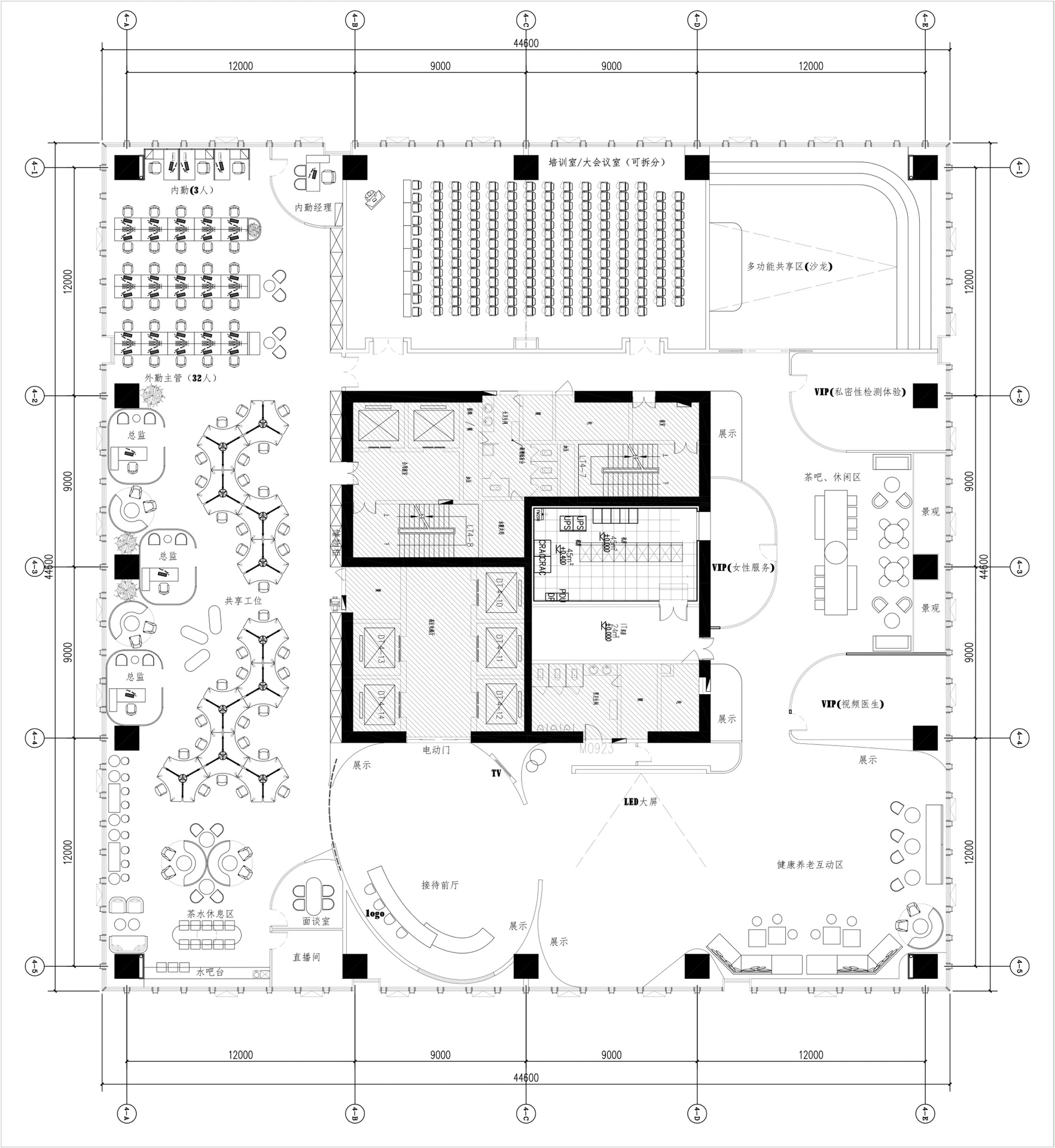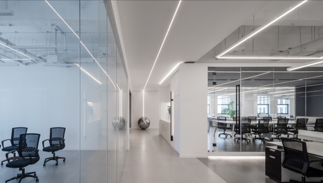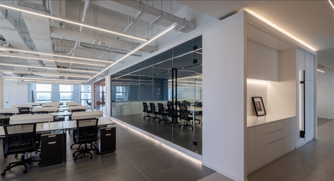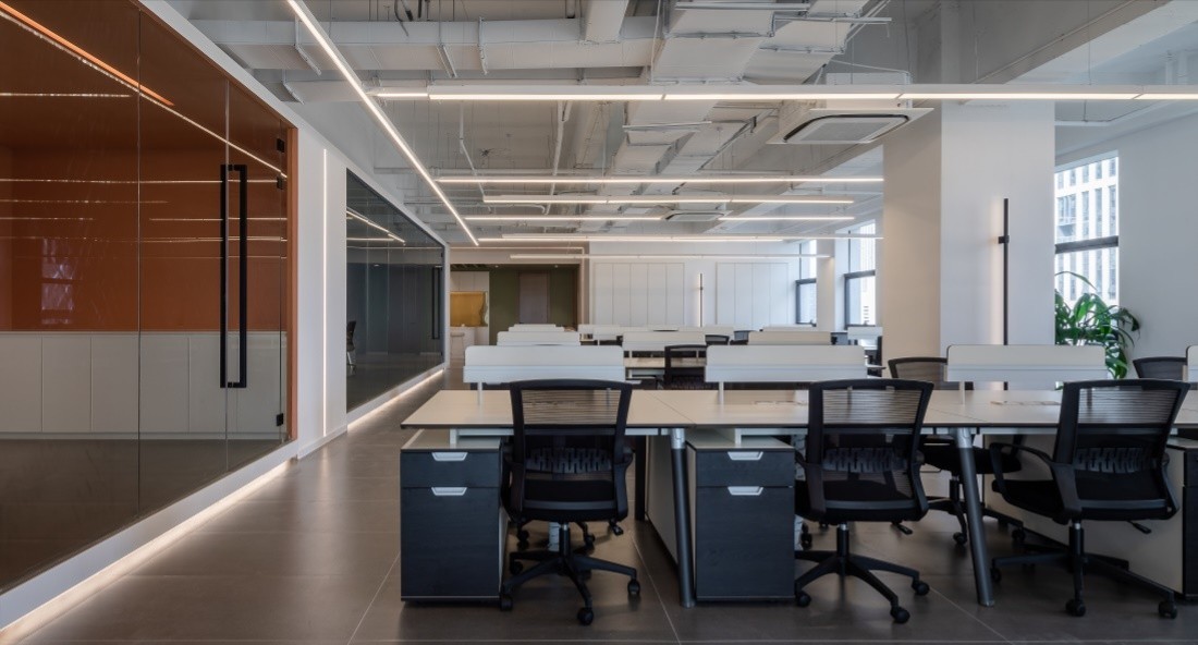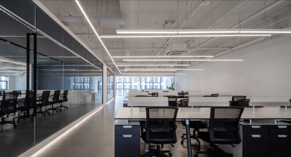 二楼办公区域,因为层高较矮采光较弱的缘故,采用了大面积的平面灯,用整面的发光膜结合原始梁体,最大限度的弱化顶部给办公环境带来的压迫感。