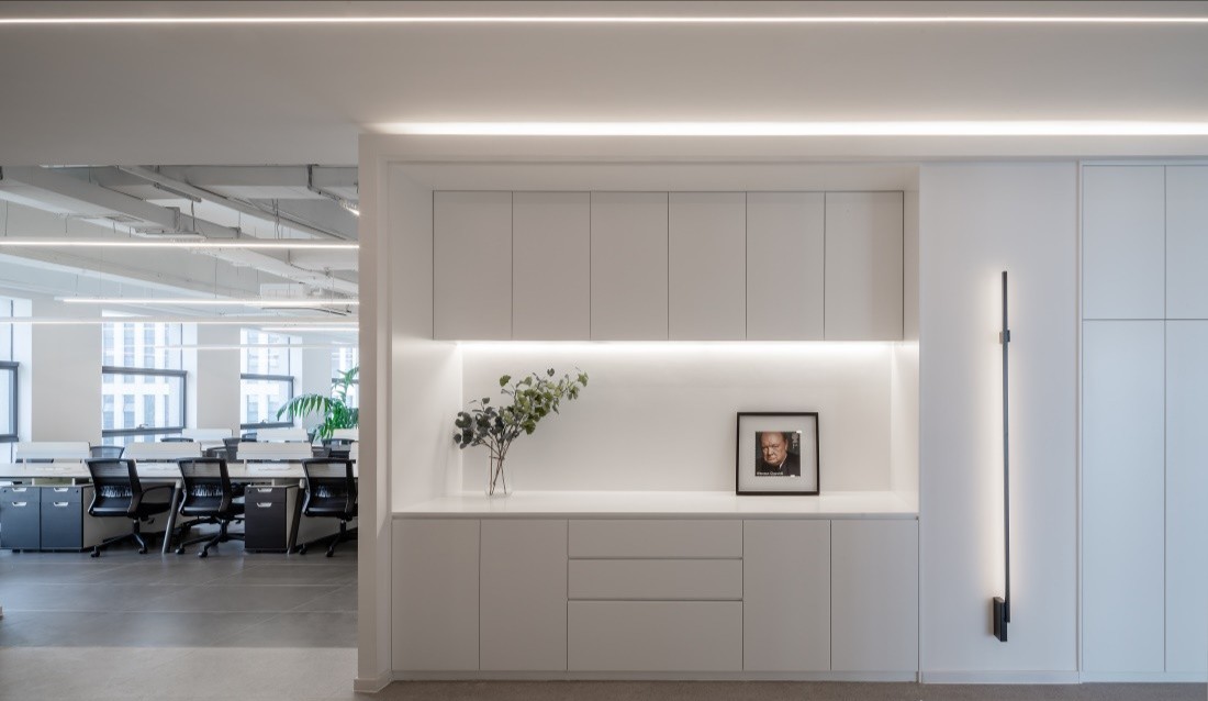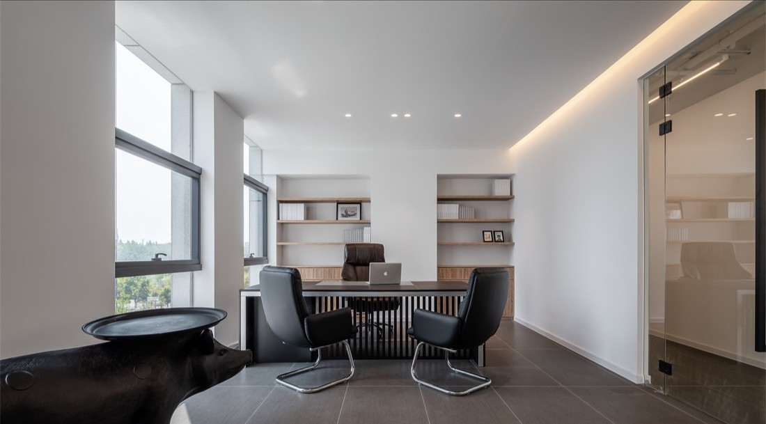 关于办公室的理想模样,每个人都有不同的要求,但共通的一点大概是要令人感到舒适。在这个项目中,设计师以现代主义原则为基础,用最简单的形式和材料为极简概念塑形,白色墙壁、灰色地砖、浅木色桌面的色彩搭配与材质选择让空间静默而内敛,每个区域看起来都非常整洁有序,不聒噪,不拘谨,不累赘。