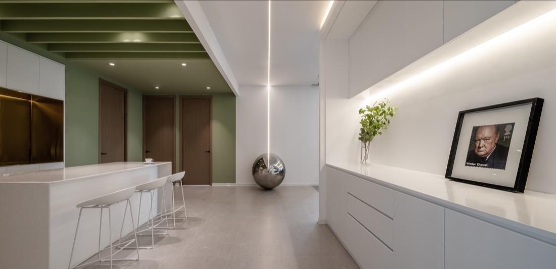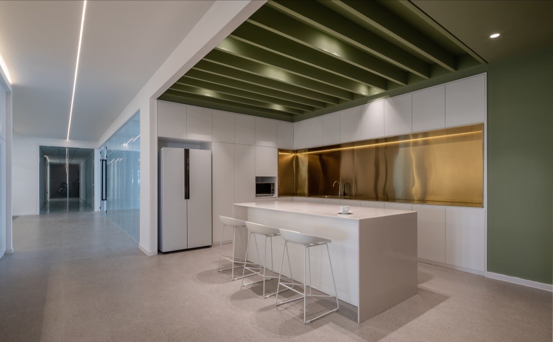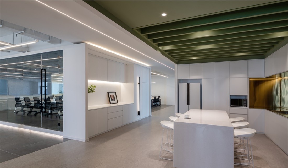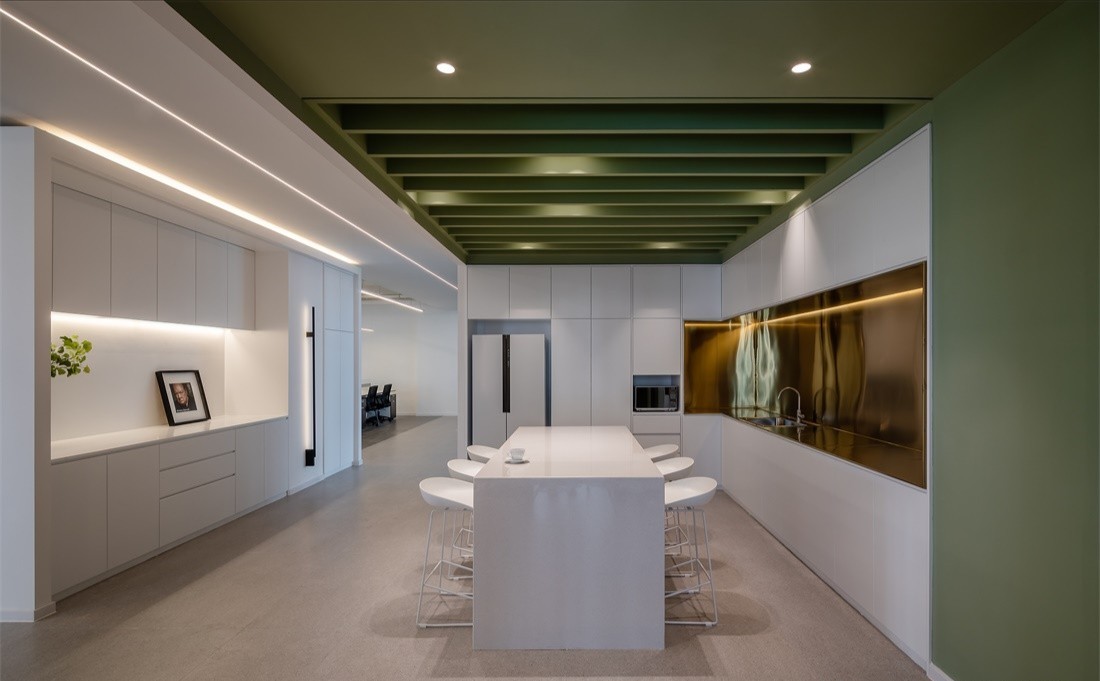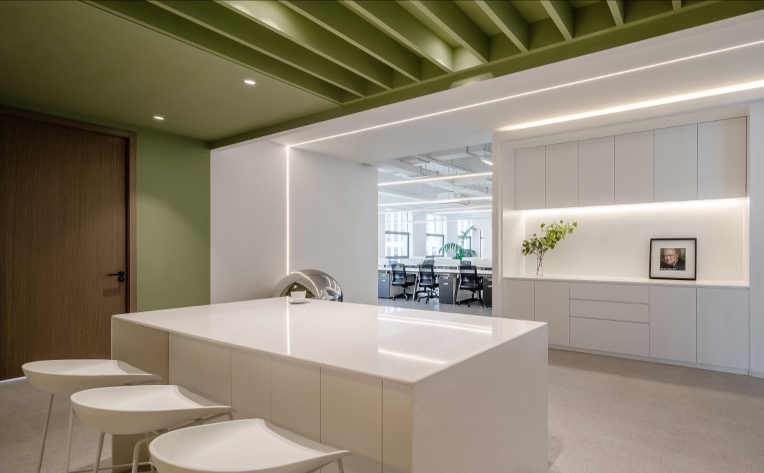 同时,考虑到甲方所处的行业特性与工作模式,设计的方向是在空间里做减法,用一种类似家庭社区的形式,对传统的幽闭分隔的格子间式办公环境进行改善,以此增进团队成员之间的交流与沟通。
