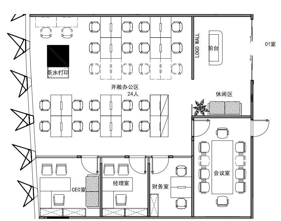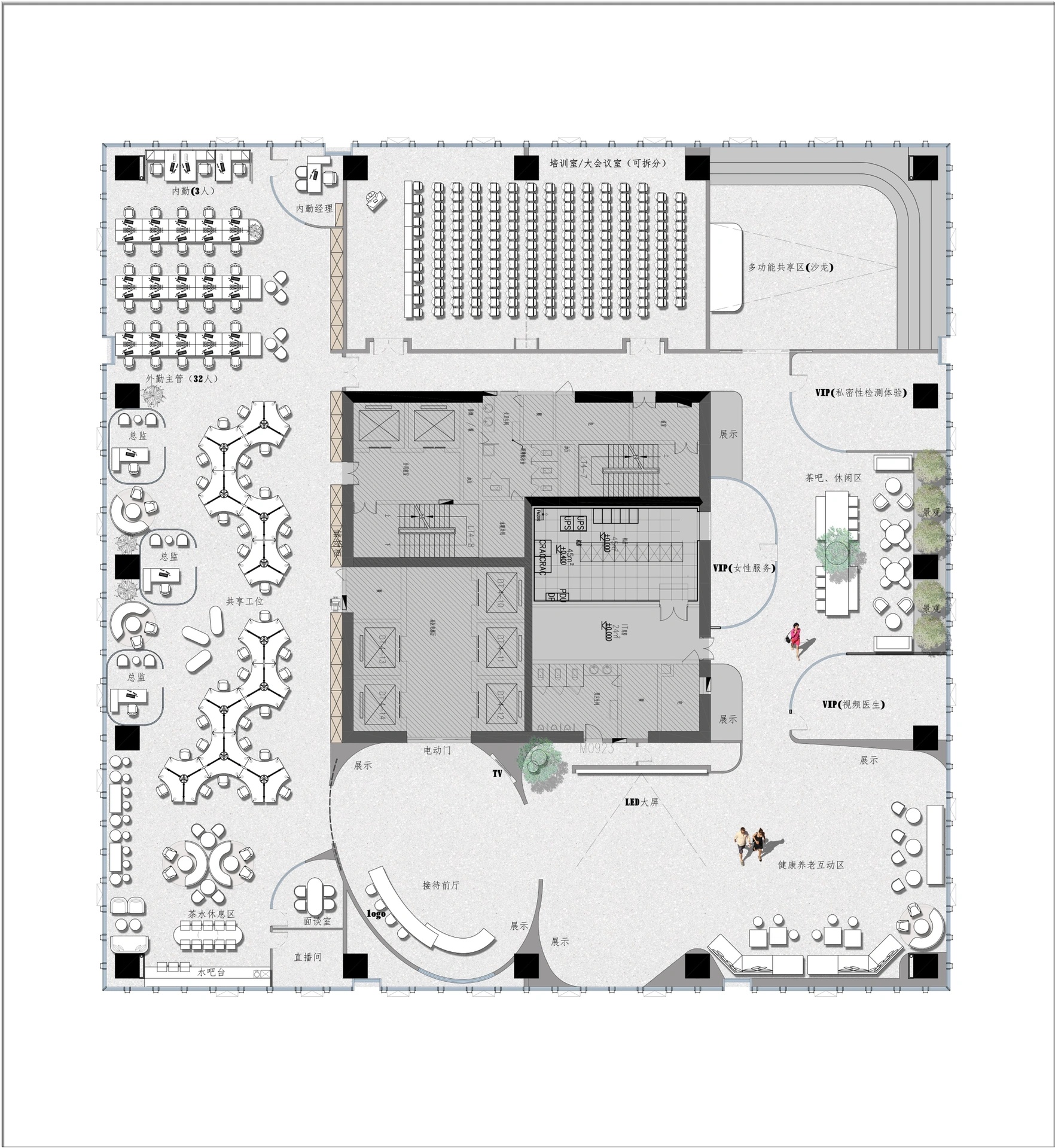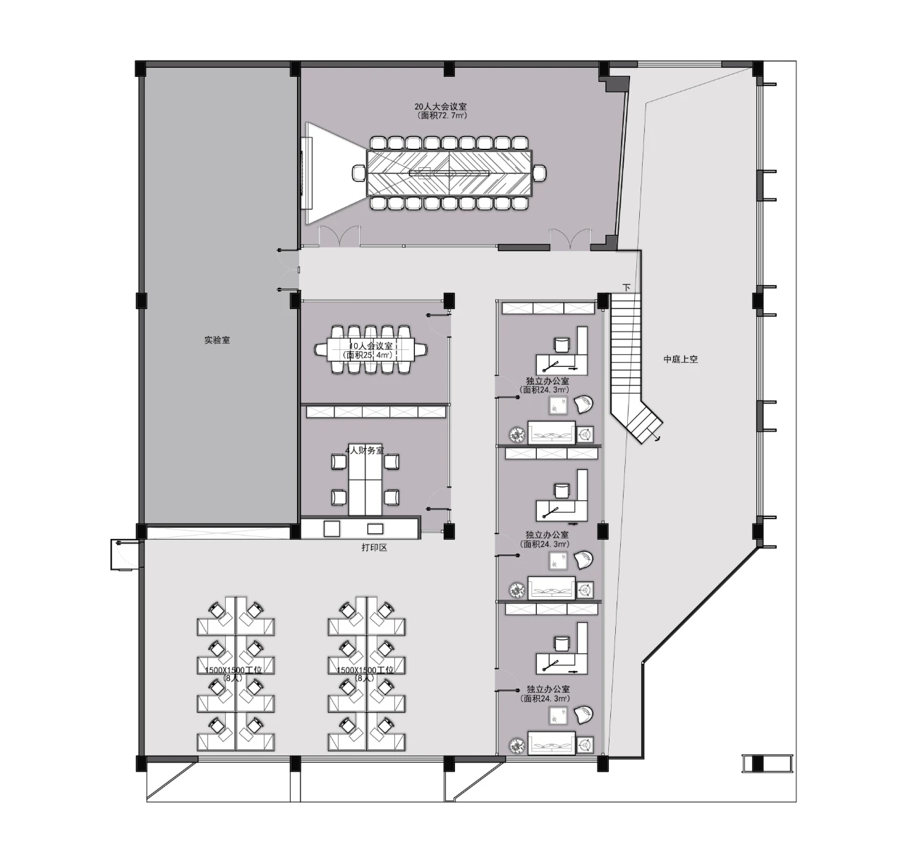 同时,考虑到甲方所处的行业特性与工作模式,设计的方向是在空间里做减法,用一种类似家庭社区的形式,对传统的幽闭分隔的格子间式办公环境进行改善,以此增进团队成员之间的交流与沟通。