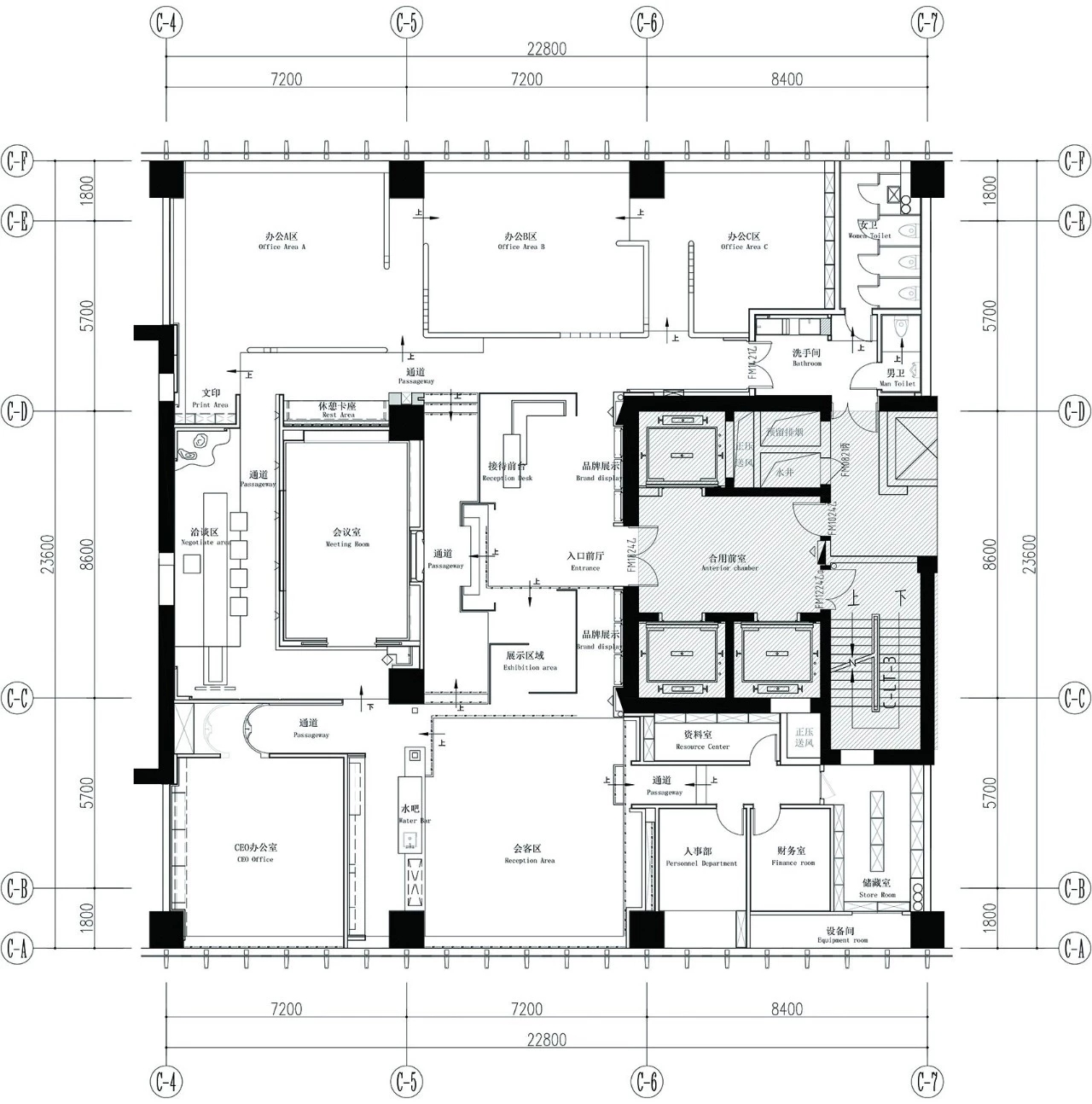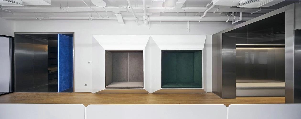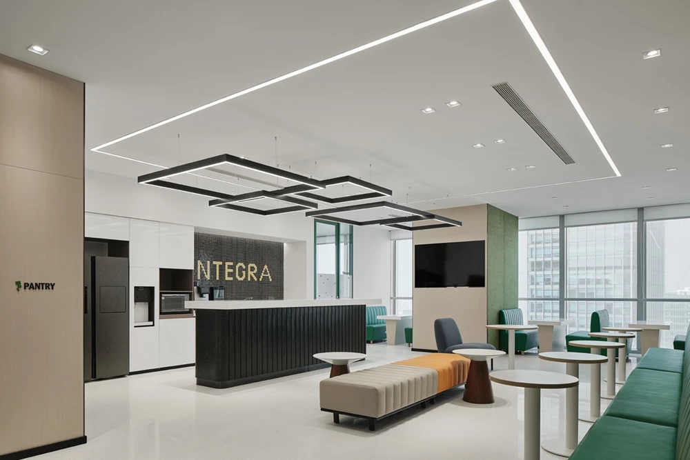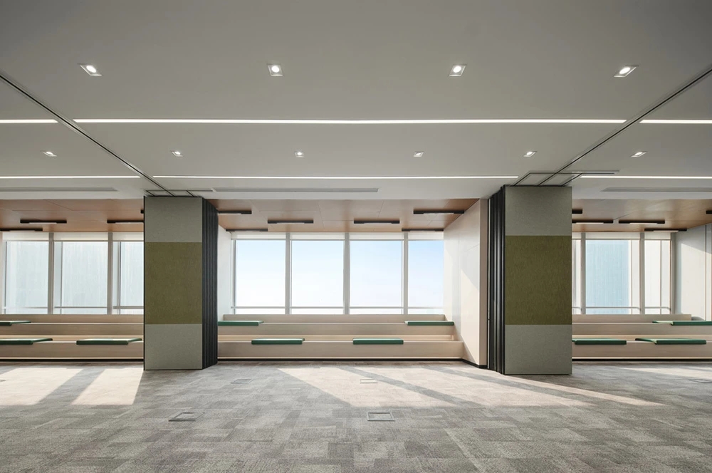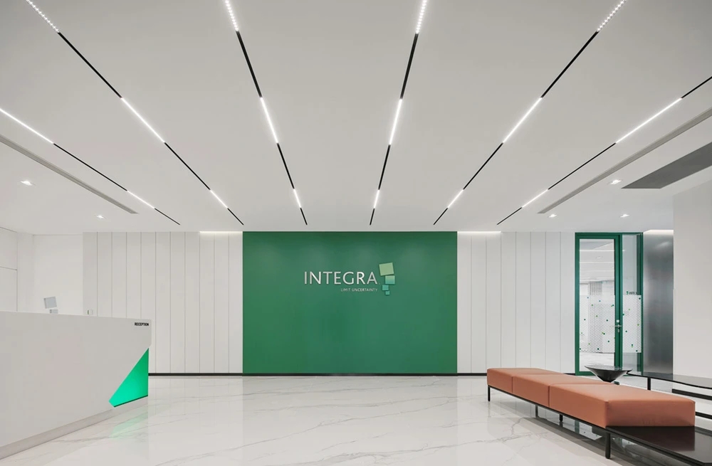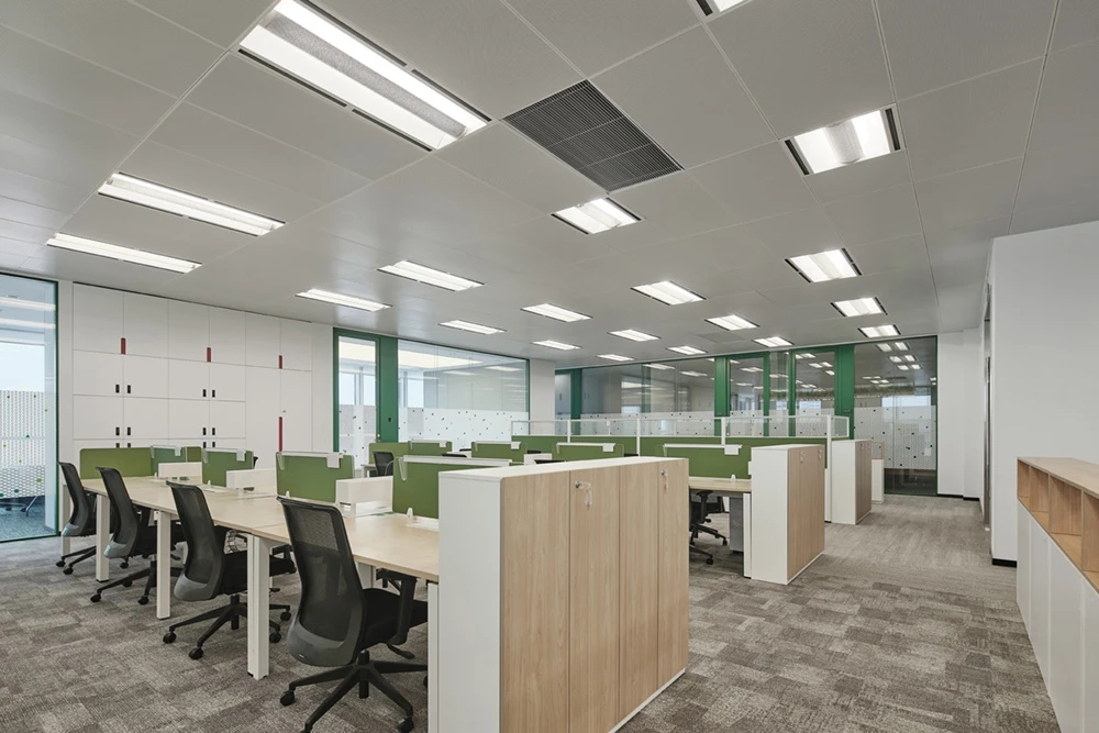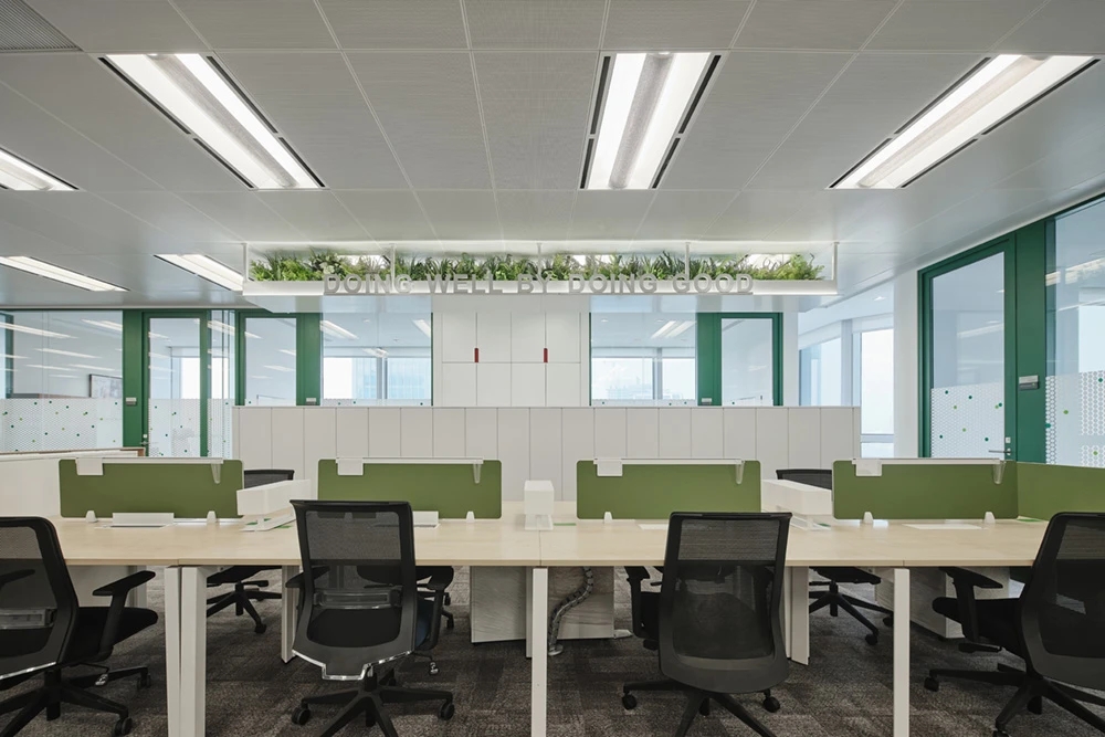 整体设计理念来自于公司方形的LOGO,而配色则选用了白色、绿色、灰色、蓝色作为办公室设计的基础色。