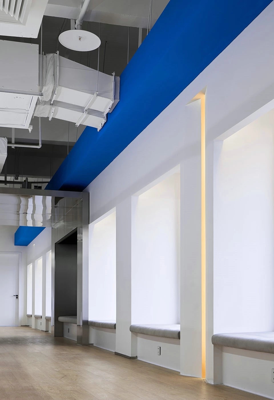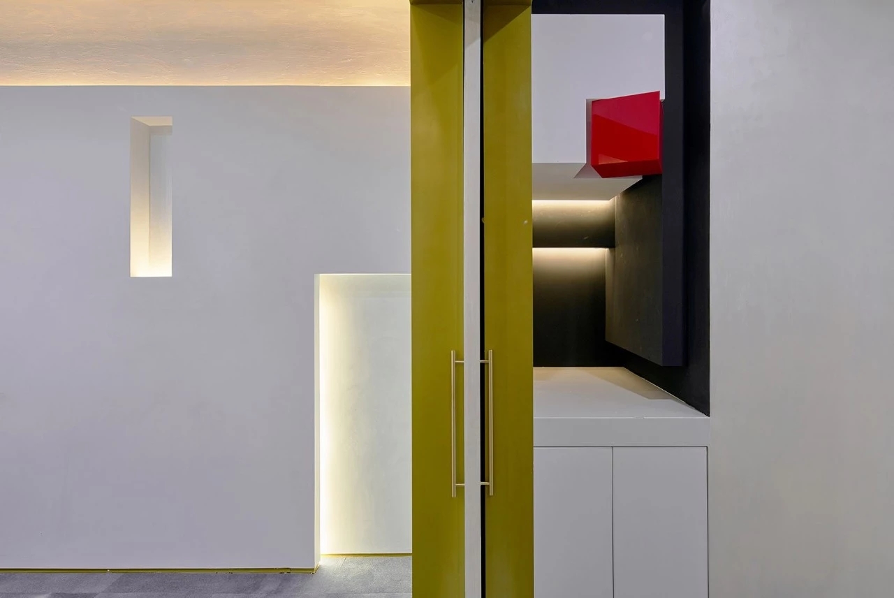 对于空间吊顶与墙面局部的特殊处理,由于结构的改变,光的融合度也产生了变化。利用两层光与光膜的实验,让一种颜色的光包住另一种颜色。