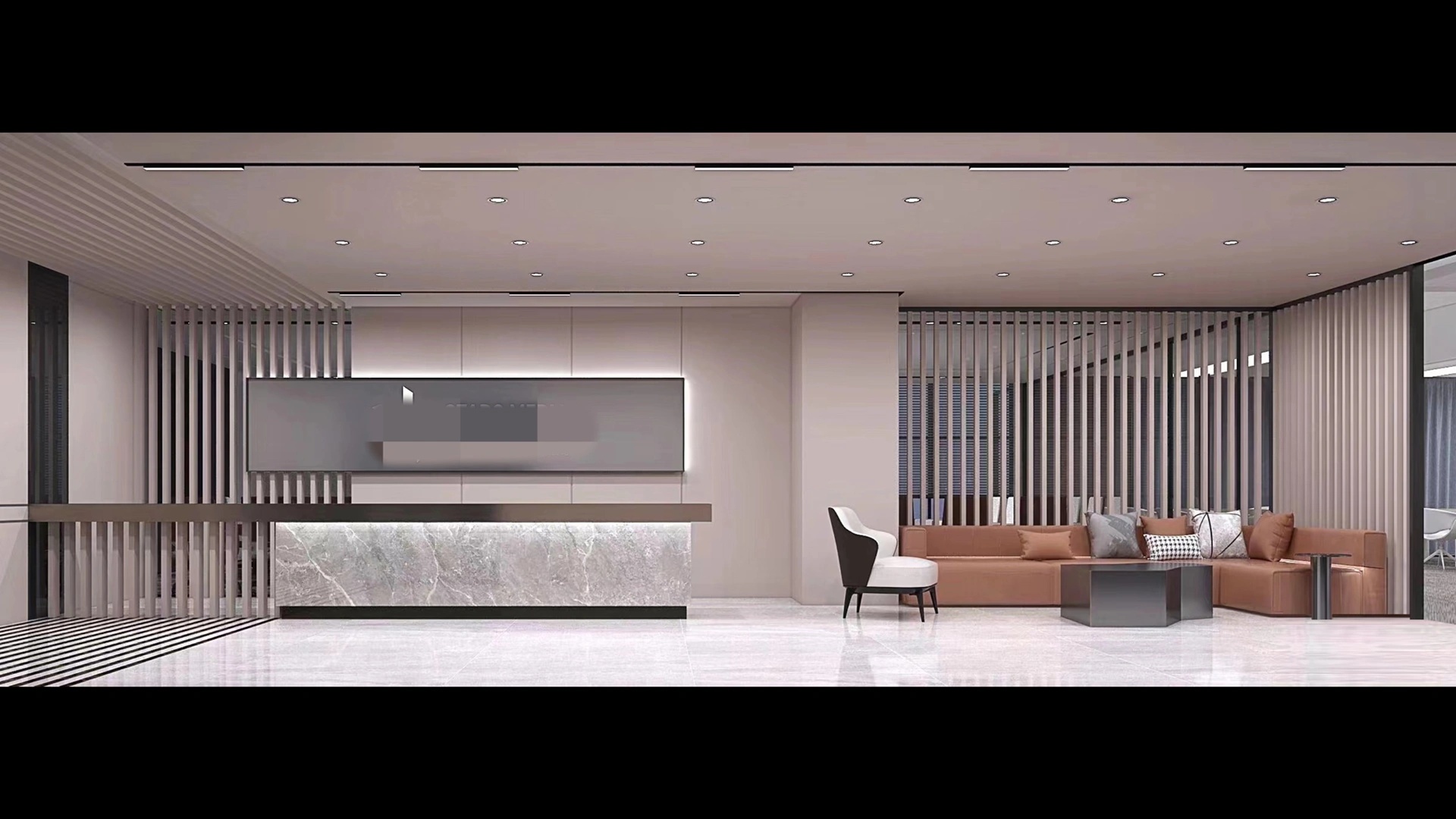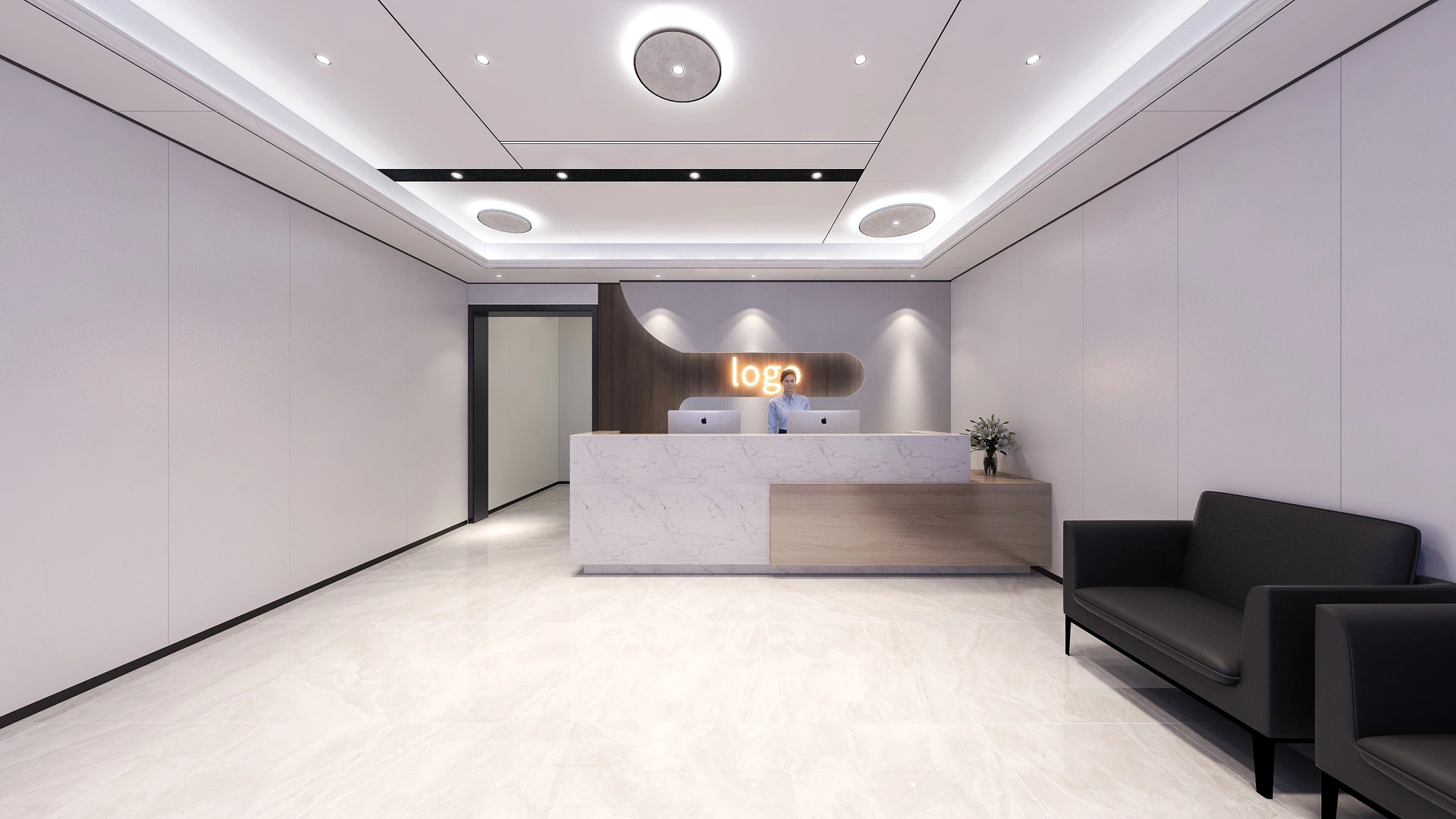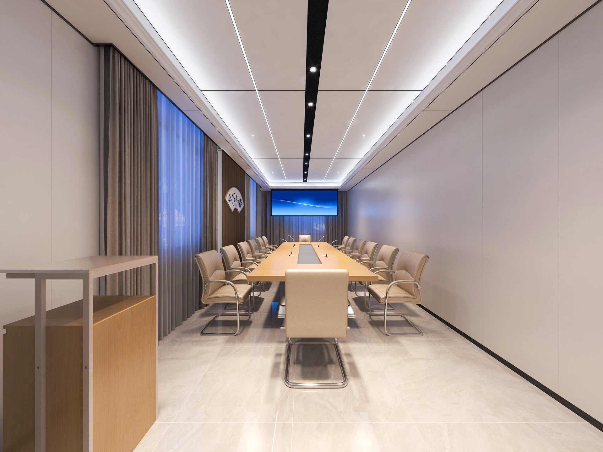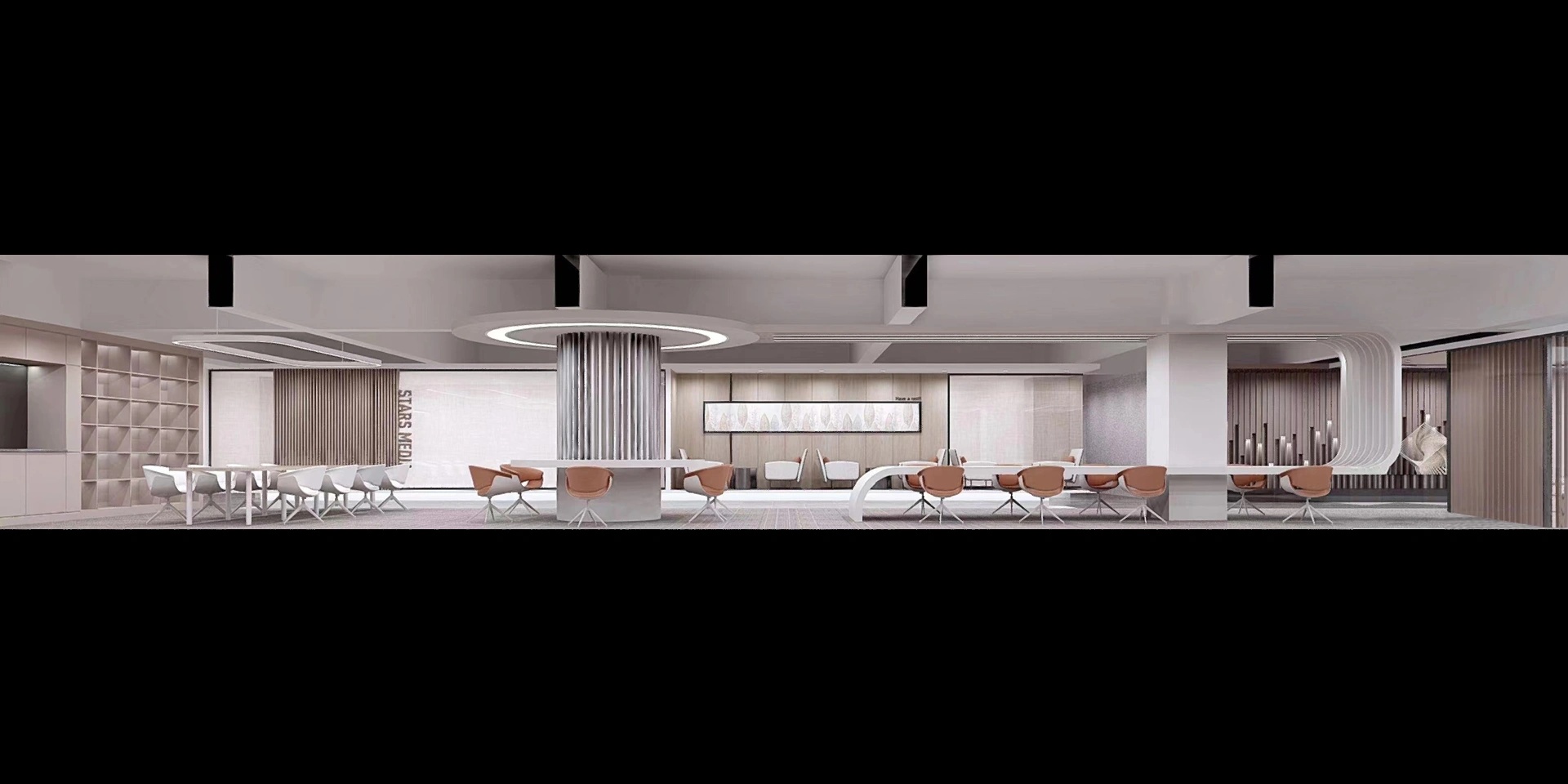 开敞式的办公区域中以木质的办公桌与功能性的实用座椅为主,圆形的悬落式吊灯给人一种视觉上的错觉,繁杂的线条式地板设计,简约之中充满了设计之美。前厅中公司logo墙利用花纹感的设计构建整体的背景空间,简约时尚,突出公司的核心理念,台面上极具设计感的装饰品增添了些许的趣味性。会议室延续办公区域的设计风格,利用几何图形构建会议桌面,最为简洁的黑白色也成为最具时尚特点的代表颜色。