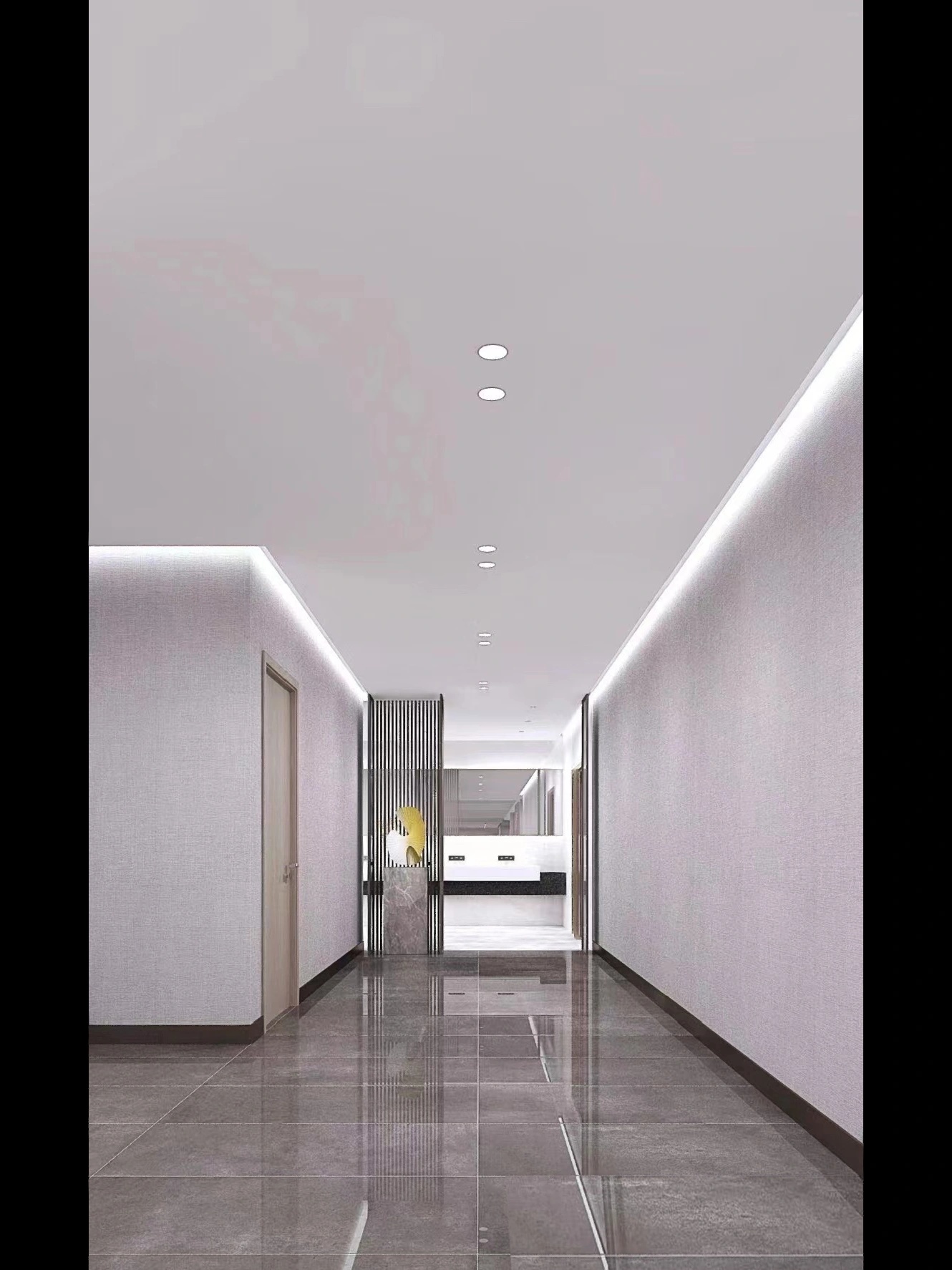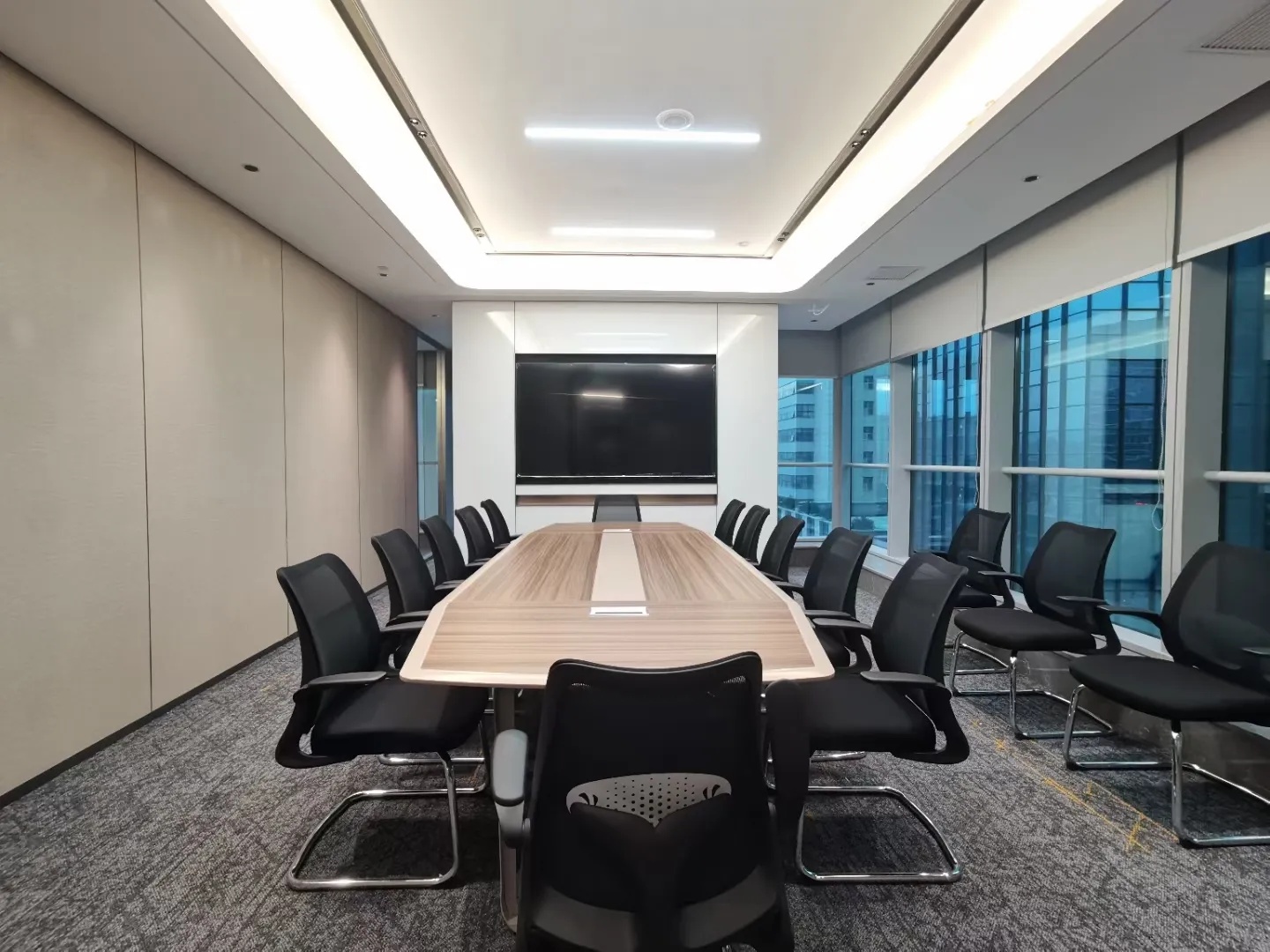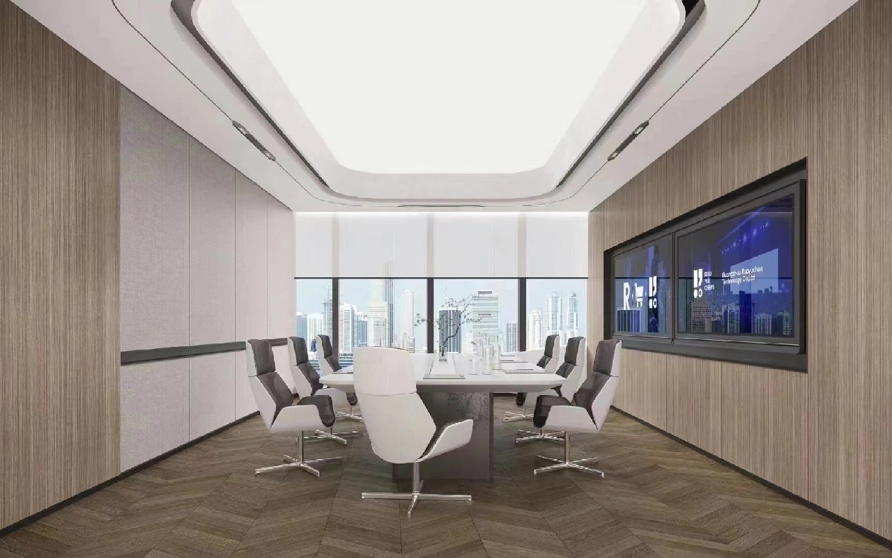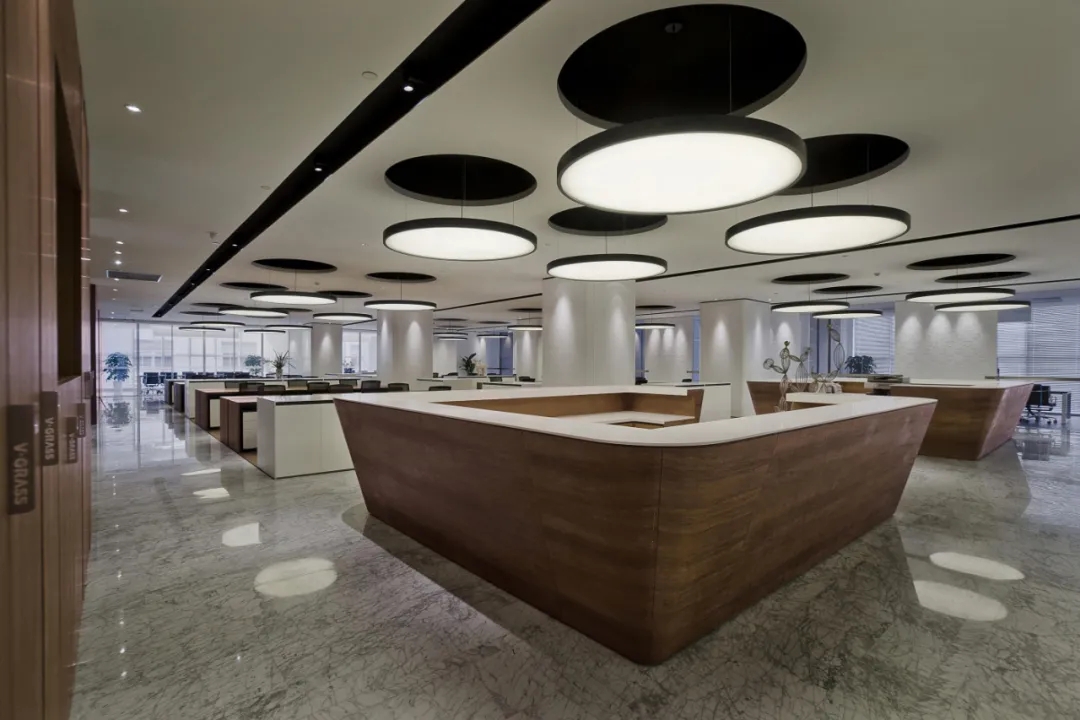 开敞式的办公区域中以木质的办公桌与功能性的实用座椅为主,圆形的悬落式吊灯给人一种视觉上的错觉,繁杂的线条式地板设计,简约之中充满了设计之美。前厅中公司logo墙利用花纹感的设计构建整体的背景空间,简约时尚,突出公司的核心理念,台面上极具设计感的装饰品增添了些许的趣味性。会议室延续办公区域的设计风格,利用几何图形构建会议桌面,最为简洁的黑白色也成为最具时尚特点的代表颜色。