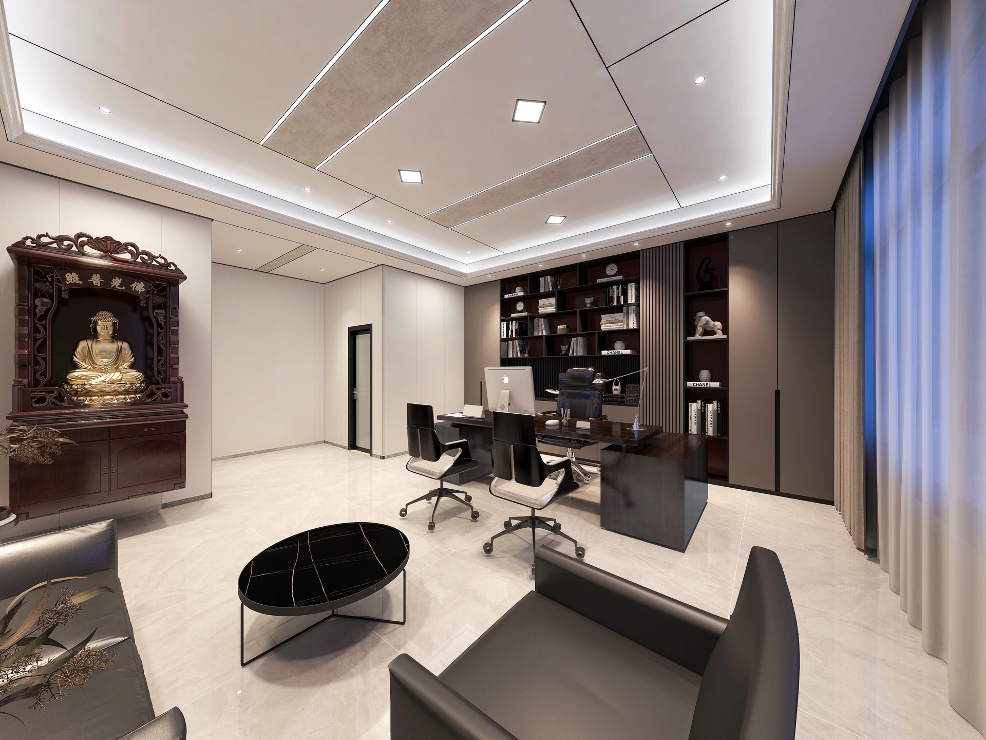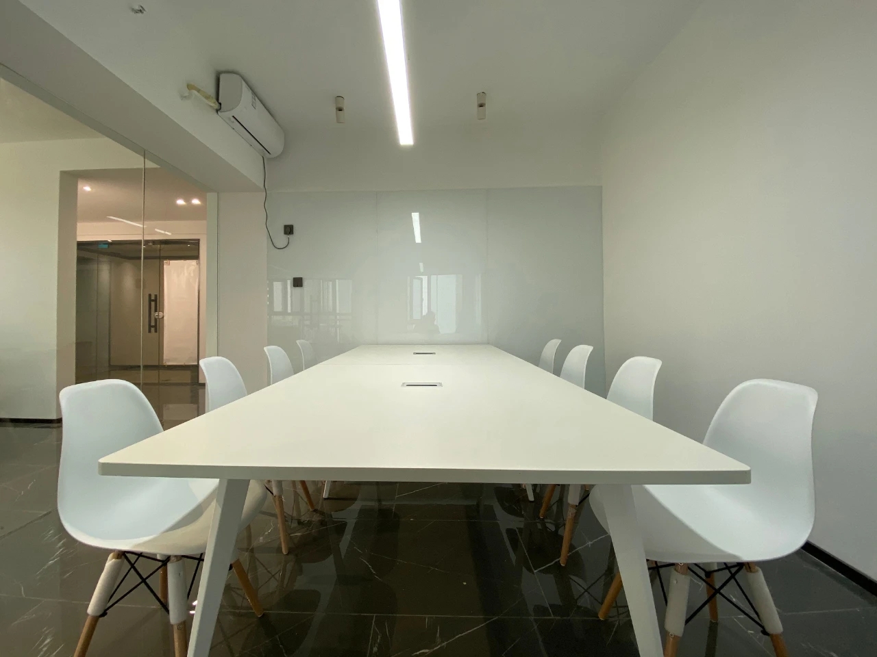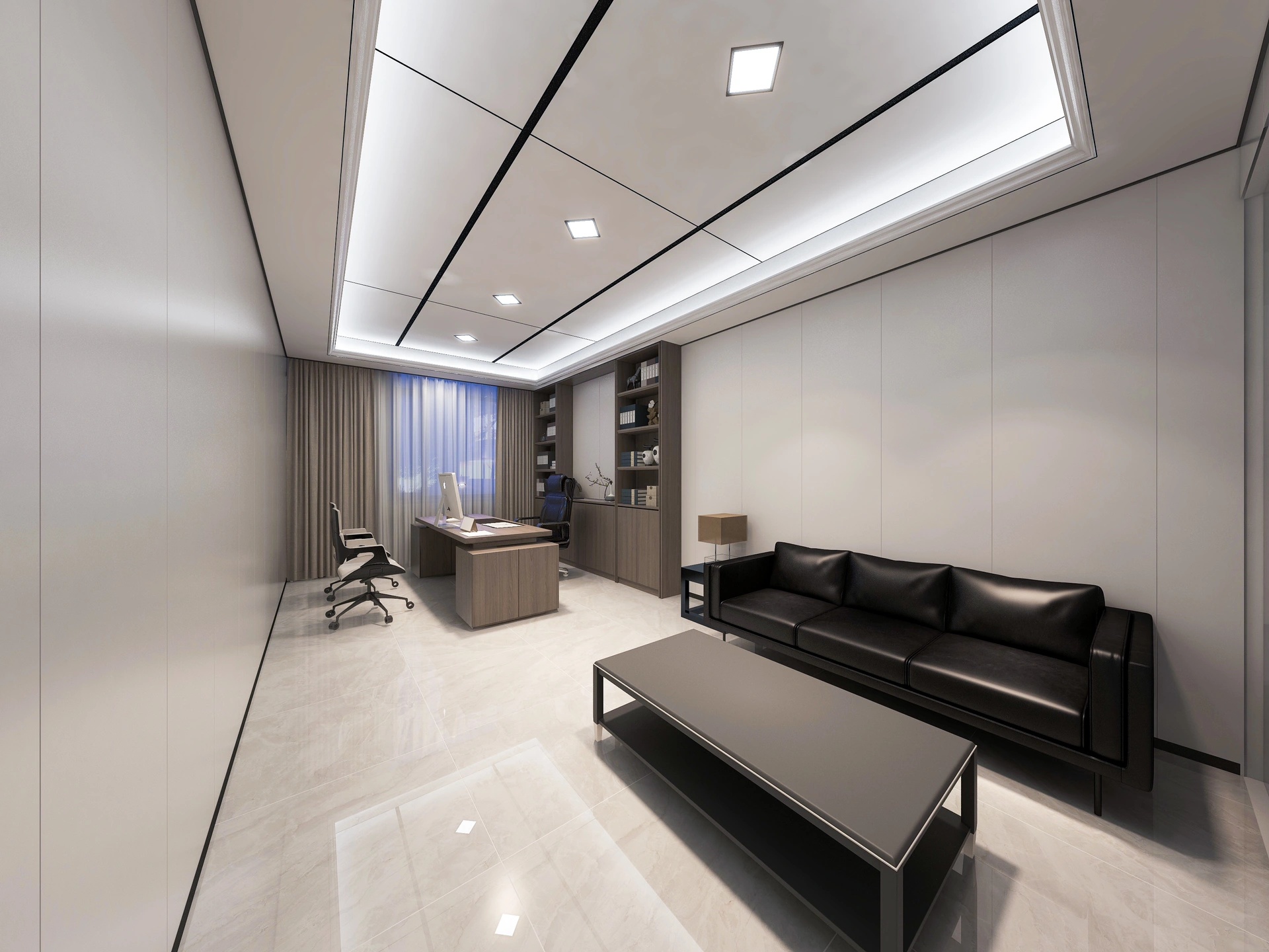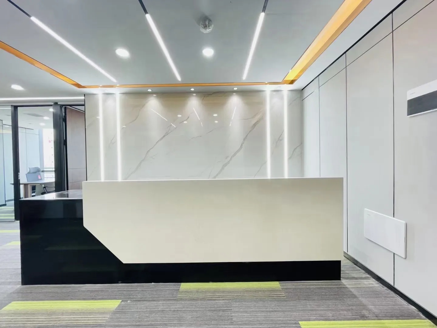 开敞式的办公区域中以木质的办公桌与功能性的实用座椅为主,圆形的悬落式吊灯给人一种视觉上的错觉,繁杂的线条式地板设计,简约之中充满了设计之美。前厅中公司logo墙利用花纹感的设计构建整体的背景空间,简约时尚,突出公司的核心理念,台面上极具设计感的装饰品增添了些许的趣味性。会议室延续办公区域的设计风格,利用几何图形构建会议桌面,最为简洁的黑白色也成为最具时尚特点的代表颜色。