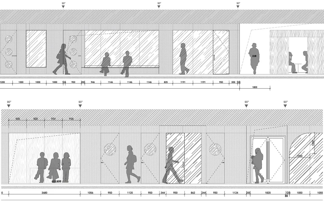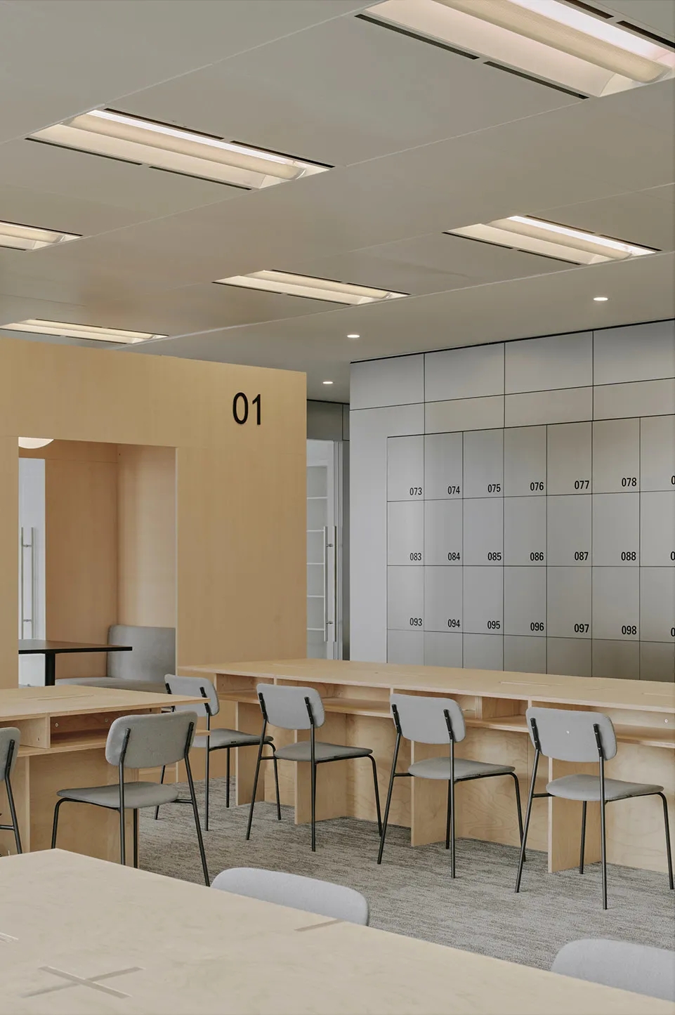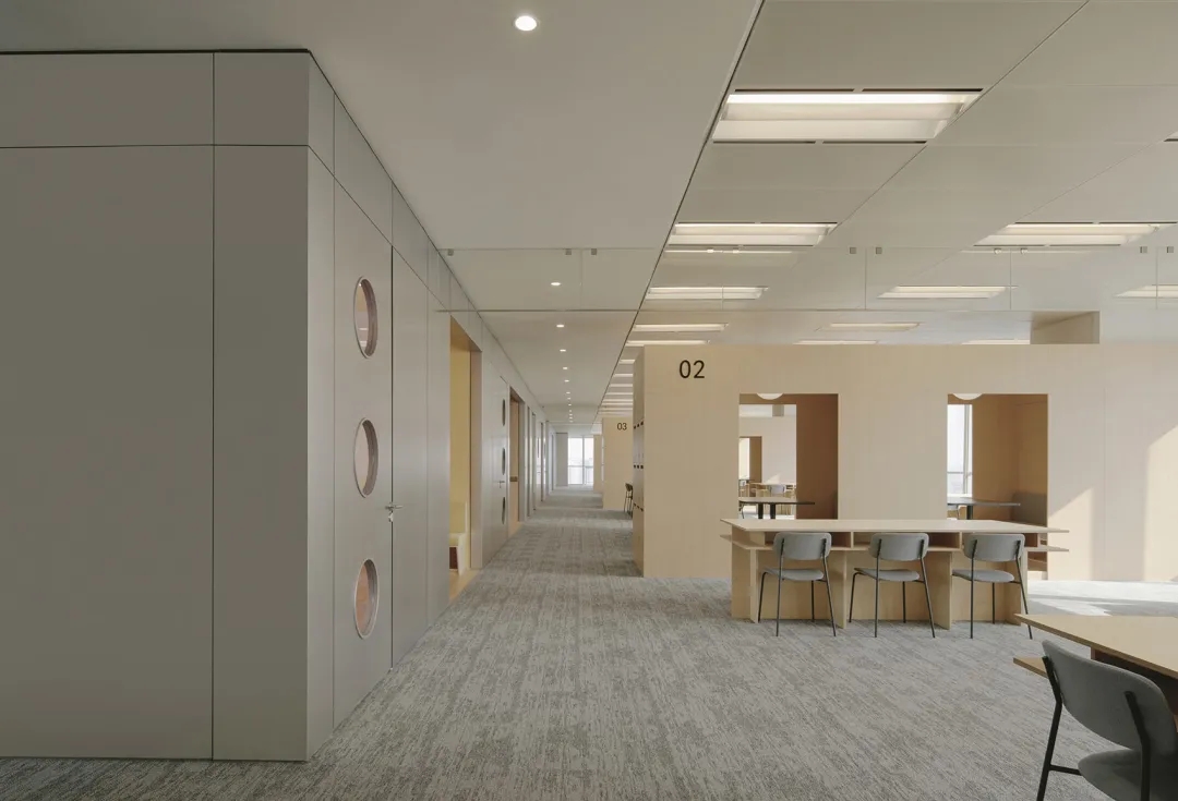 街道–是厚墙所代表的确定性办公场景与办公区所代表的不确定性办公场景之间的空间,通过在主流线上创造了一些小品如嵌入墙面的长椅,凹进厚墙的开放区域,配套的茶水间,允许了偶遇、引导非正式的沟通随时发生。形成了专注工作和专注交流之外的第三种场景。