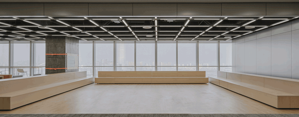 入口处的大的空间被命名为townhall市政厅,集配了茶水间,多功能会议室,会客厅,面室空间,发报栏等附属功能 我们设定了四种组合方式的可移动大台阶,通过变化可以围合出剧院、展厅、团建、培训等多种场景。
