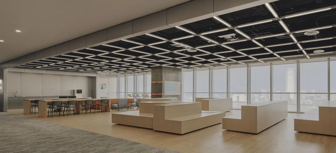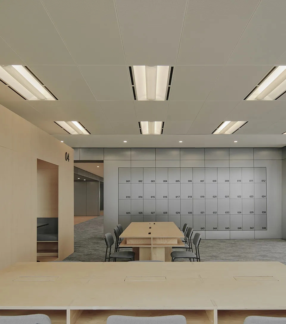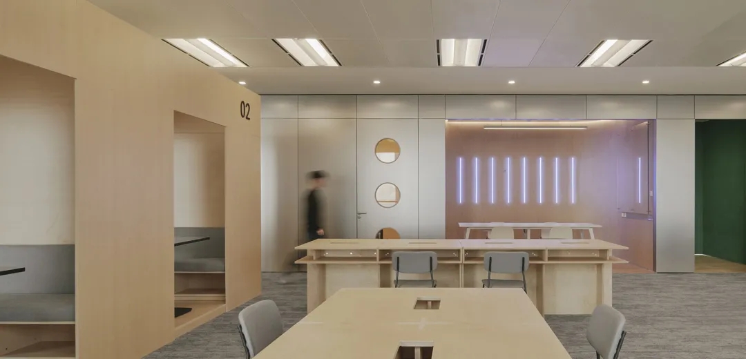民居–待定义的空间。开放办公区的木盒子、半开放的厚墙空间以及可自由组合的办公家具让不同小组可以根据兴趣及习惯重新定义其功能。配套的木盒子让员工随时可以进入其中快速讨论,切换成私密的工作场景或者打电话。