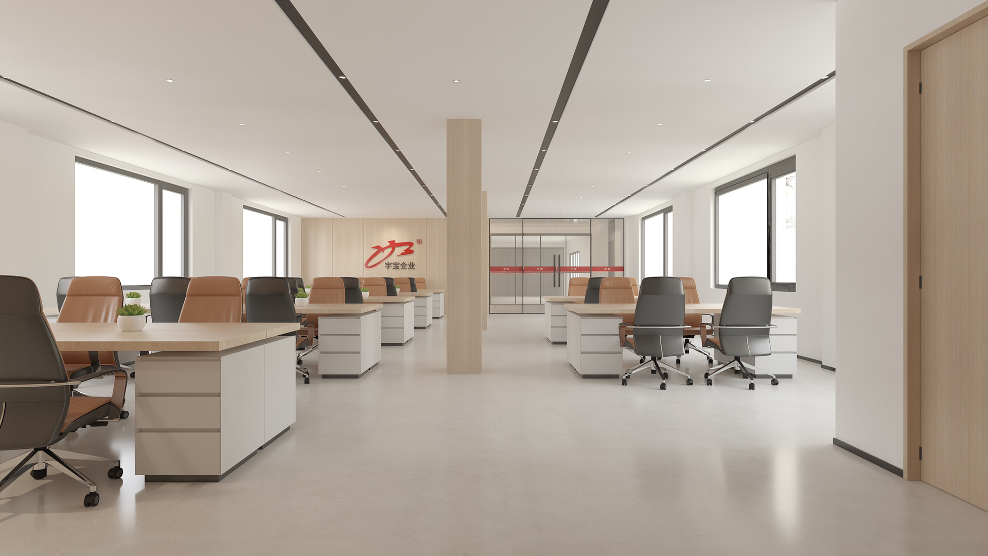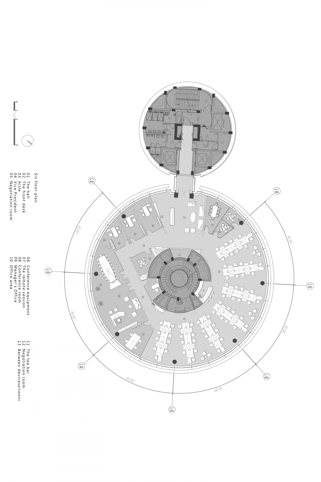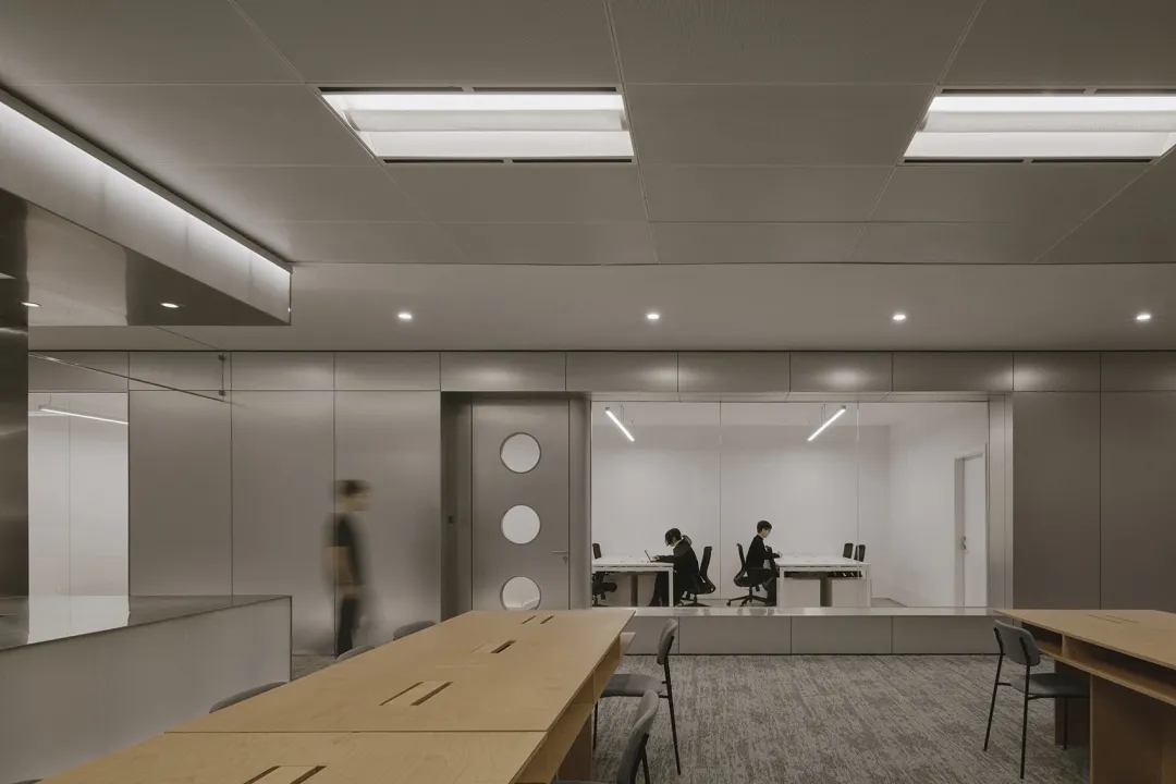 开放式办公展示区以圆形空间主导,米色木材质的办公桌,以及银色德国制造钢板手扶办公椅,造型前卫,充满未来感,顶部线行的金属罩造型,充满了方向性,与办公桌上下呼应,去打破圆形的束缚,形成一个聚合能量场。
