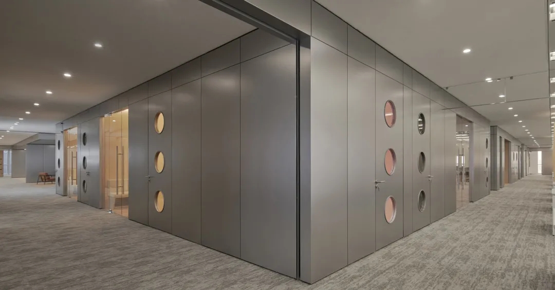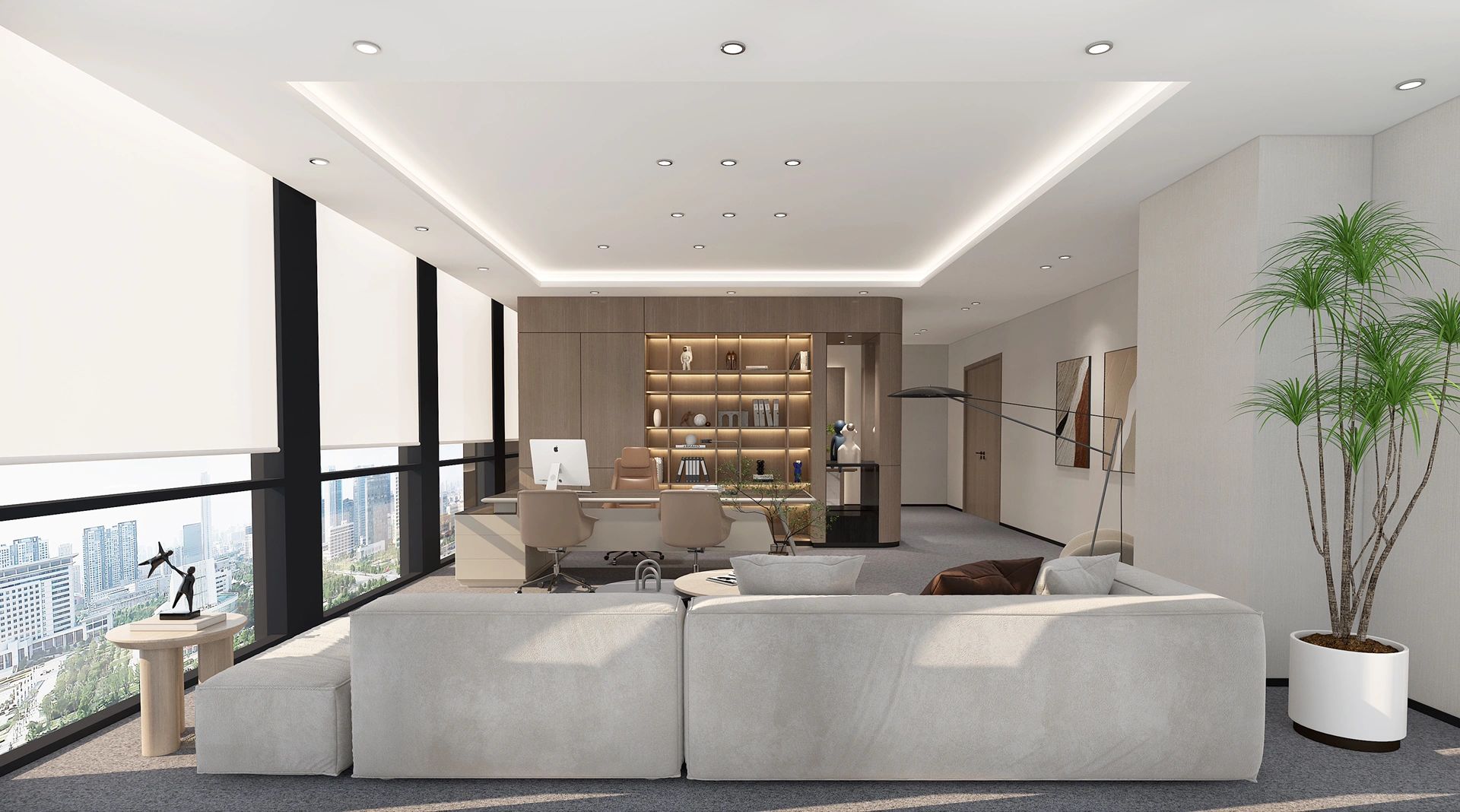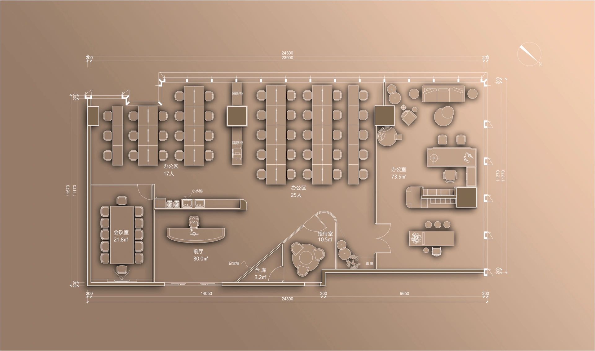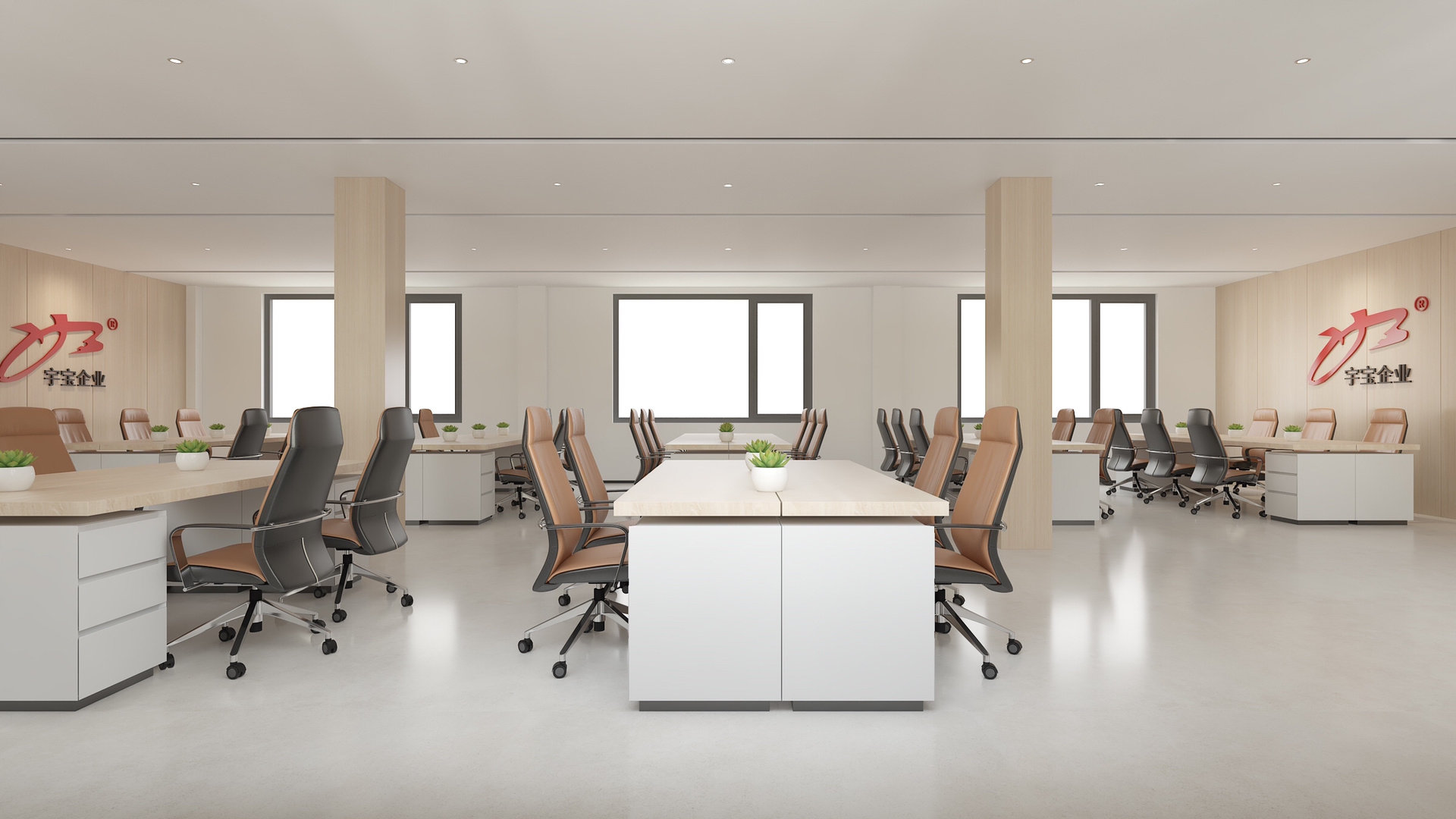 开放式办公展示区以圆形空间主导,米色木材质的办公桌,以及银色德国制造钢板手扶办公椅,造型前卫,充满未来感,顶部线行的金属罩造型,充满了方向性,与办公桌上下呼应,去打破圆形的束缚,形成一个聚合能量场。