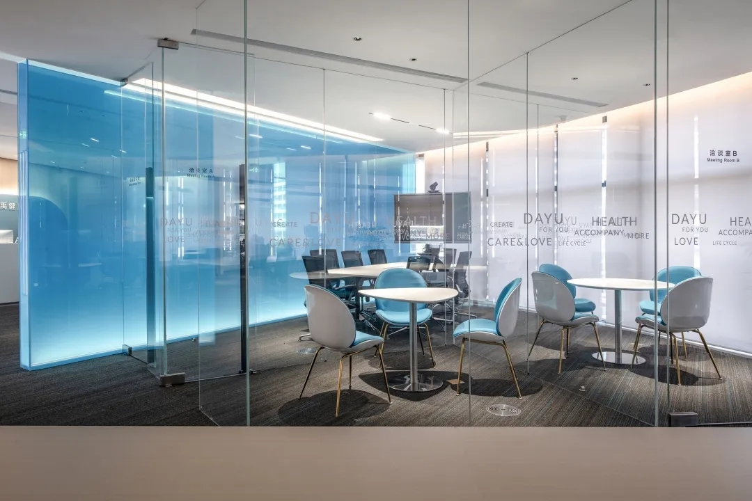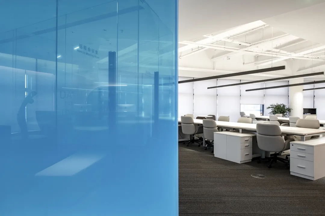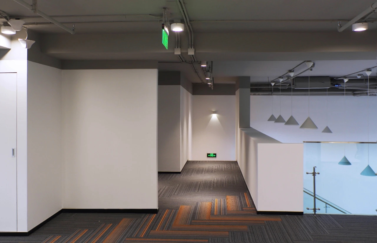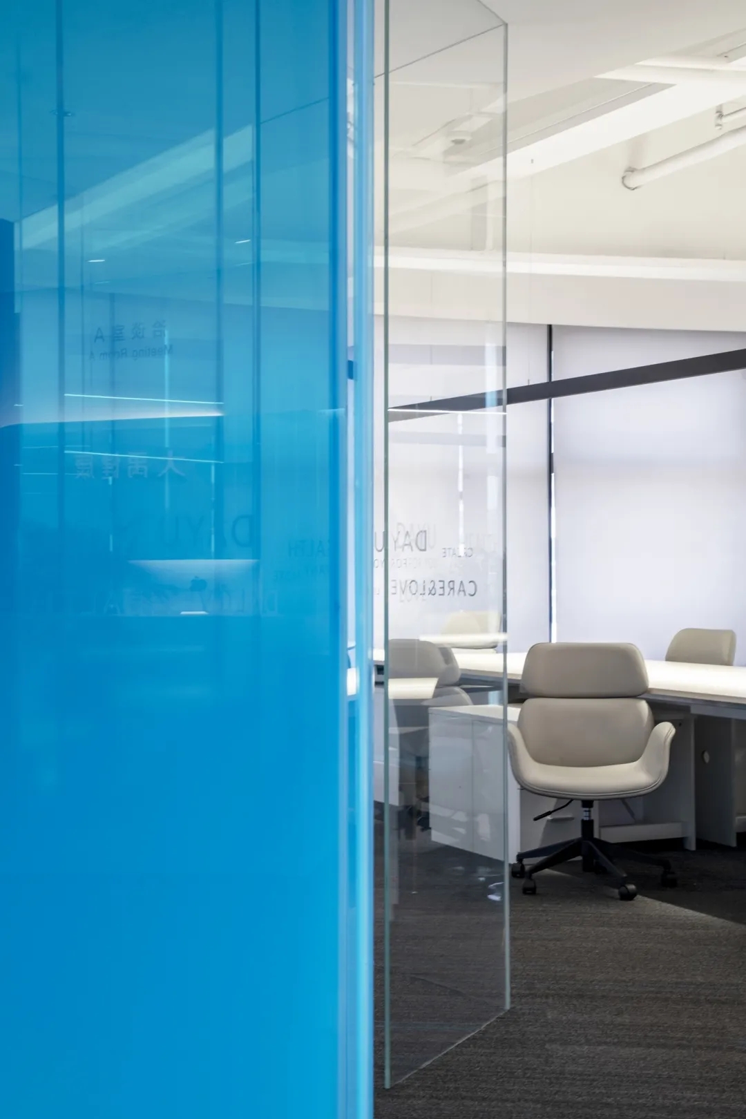 办公区域的规划设计,充分考虑到开放共享和私密性的双重需求,规划不同尺寸的单间及开敞办公区。设计师用透明玻璃,隔墙,不同颜色的编织地毯分割指引各功能部门,既保证一定程度的开放性,也兼顾到办公空间的私密性。