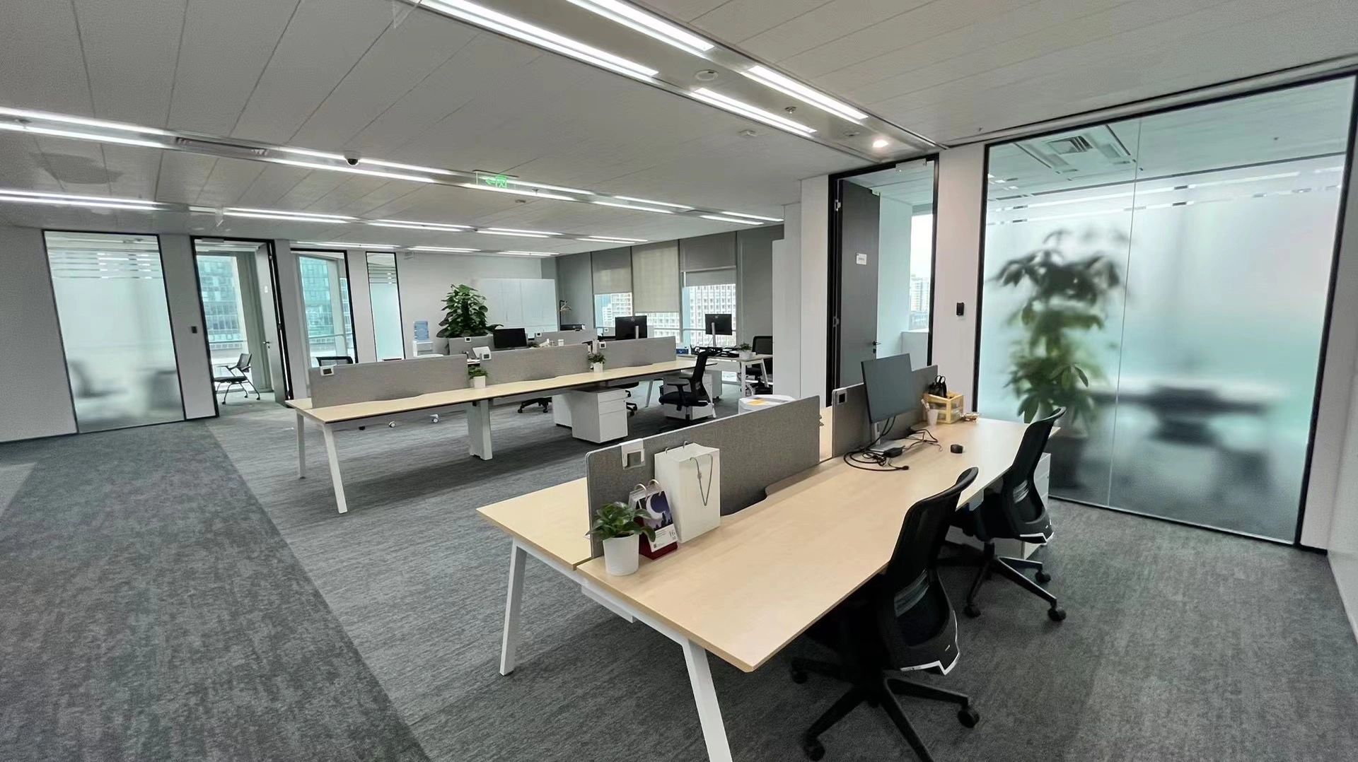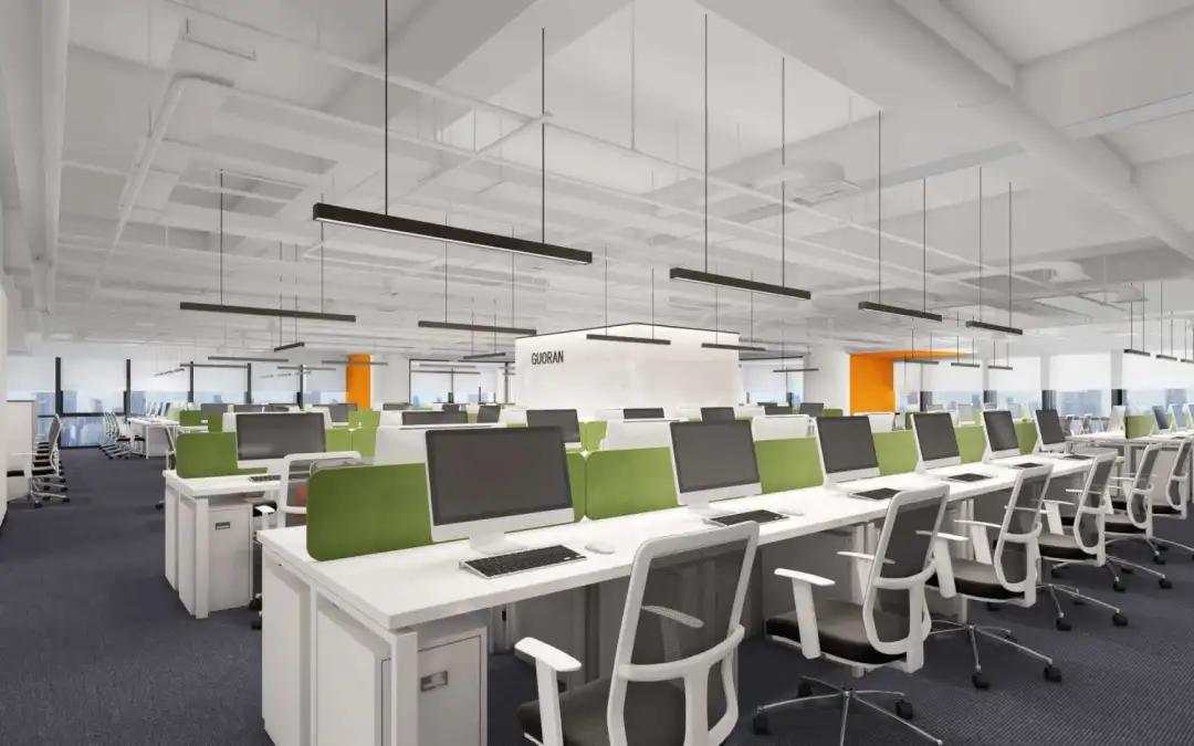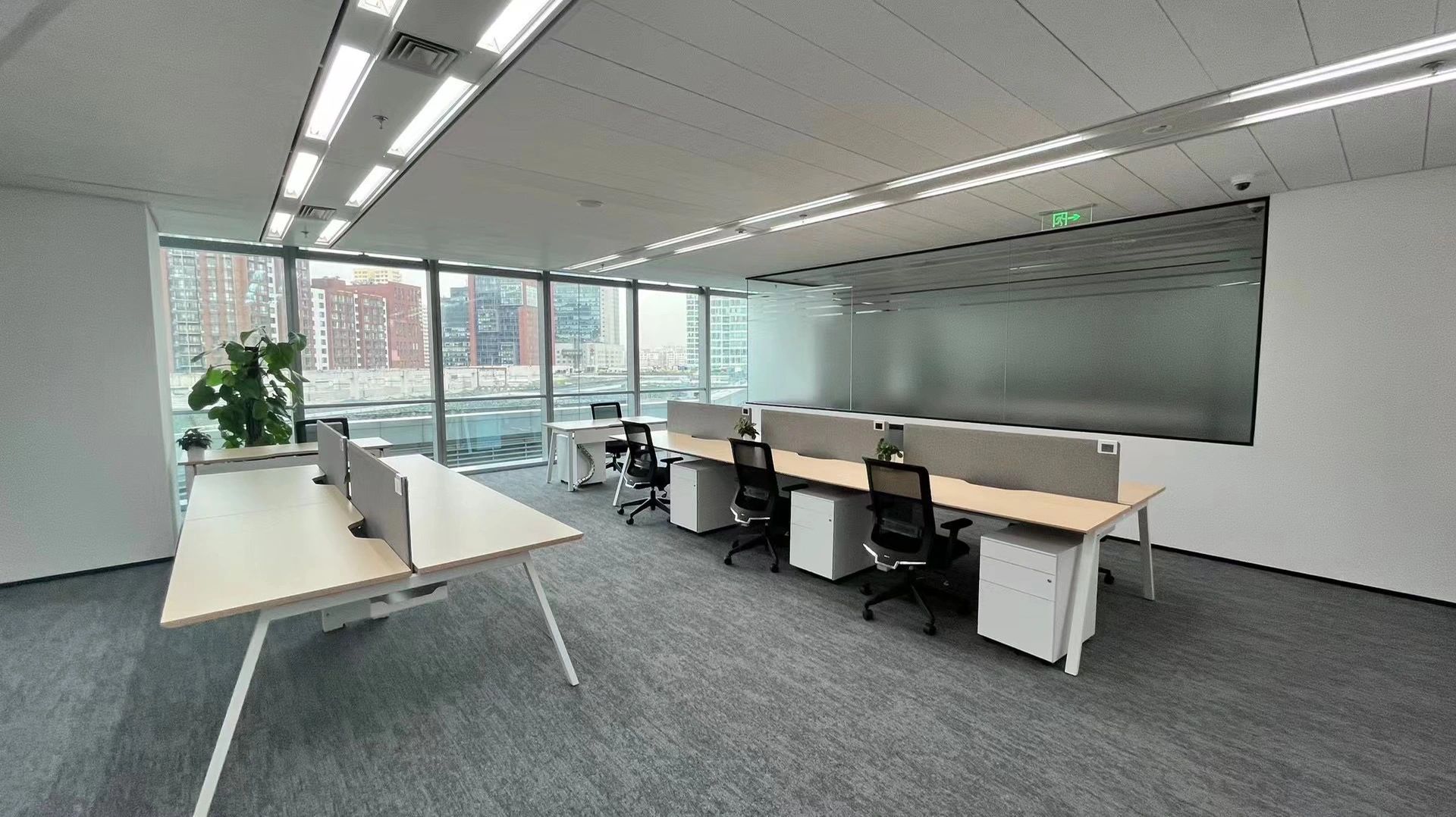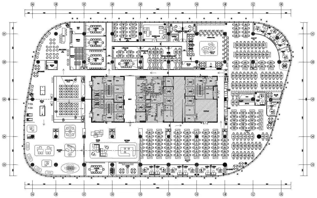 办公区采取外向型的公共开敞式,限定性和私密性小,自然采光良好,视野开阔,强调与空间环境的渗透,便于各部门之前相互交流与沟通,提高工作效率。