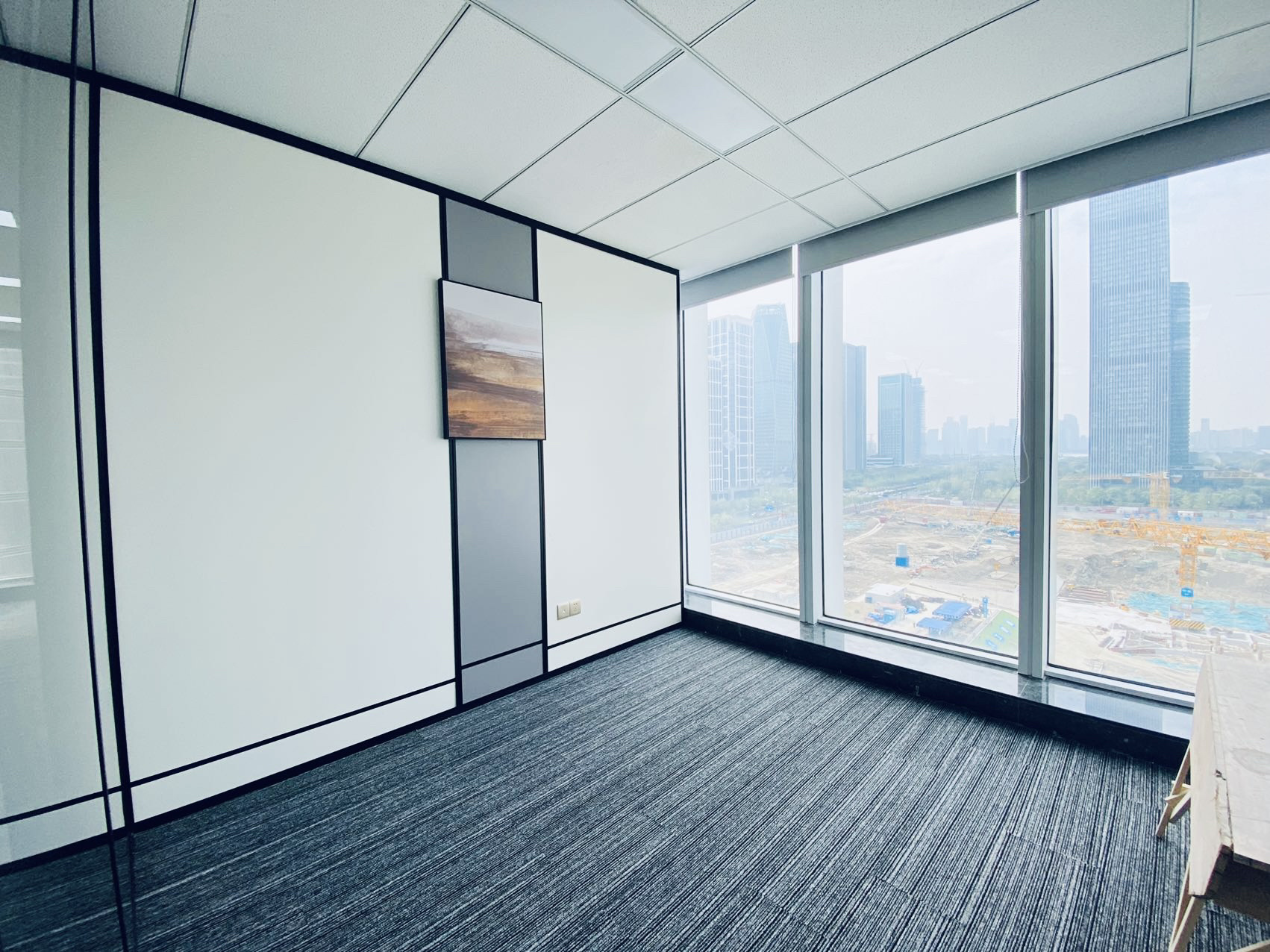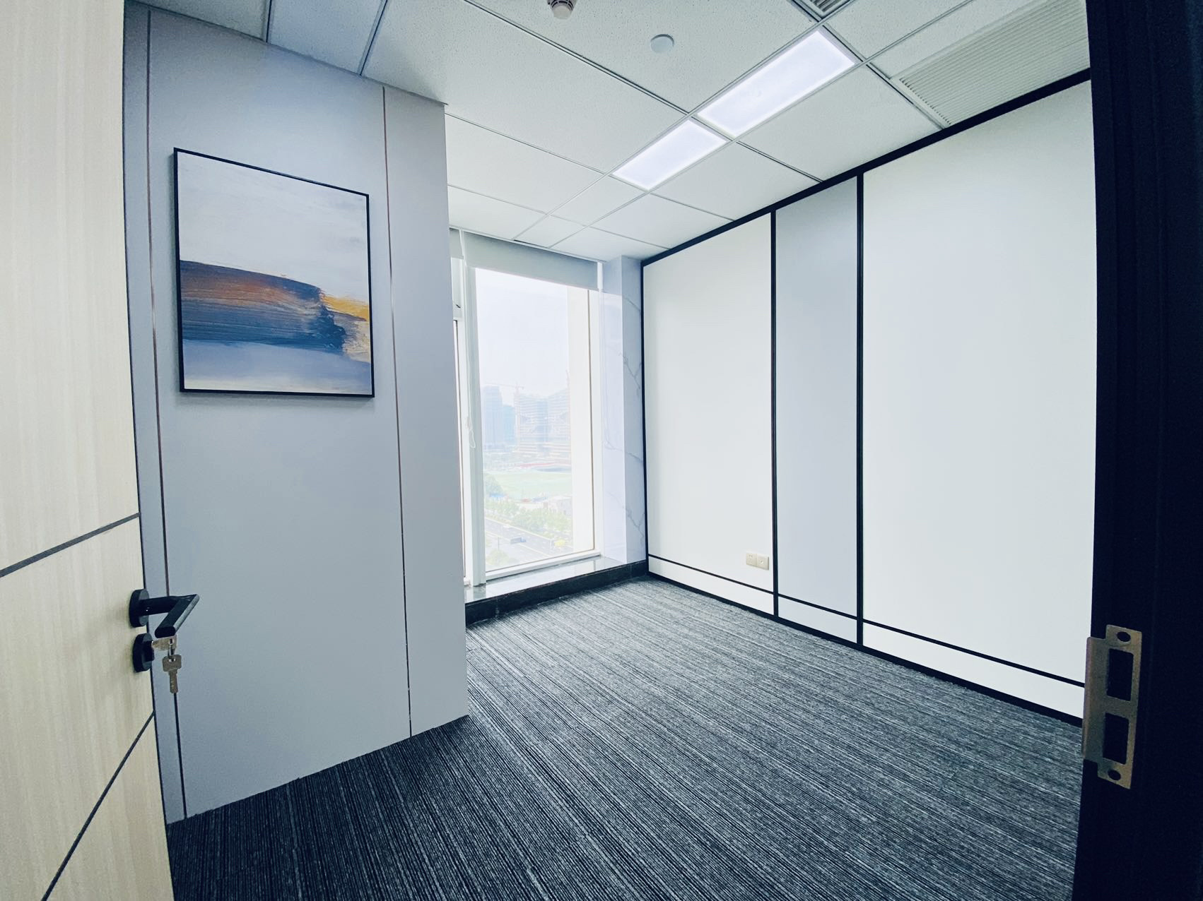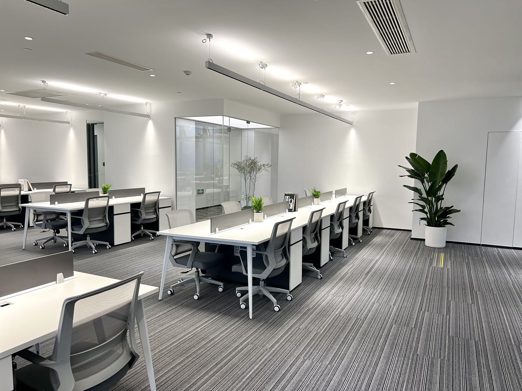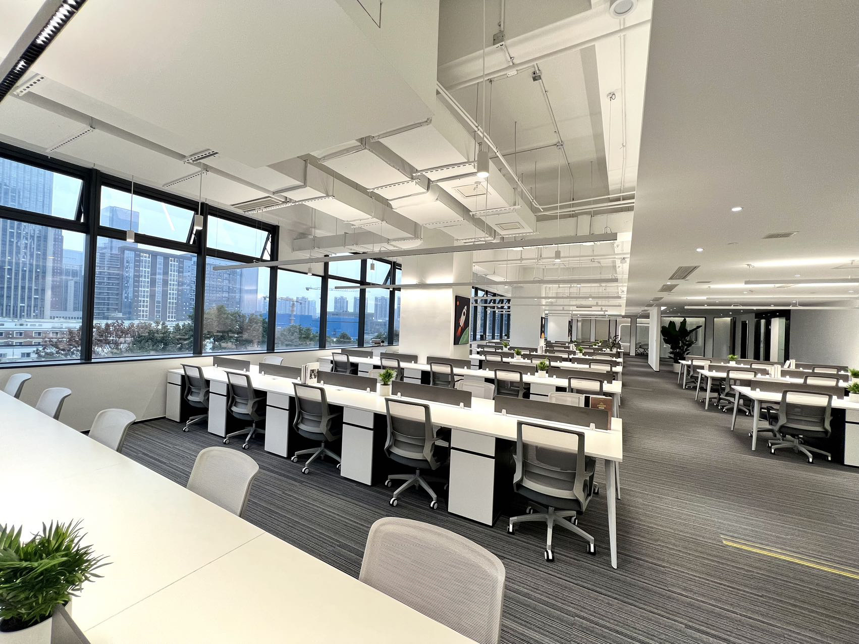 办公区采取外向型的公共开敞式,限定性和私密性小,自然采光良好,视野开阔,强调与空间环境的渗透,便于各部门之前相互交流与沟通,提高工作效率。