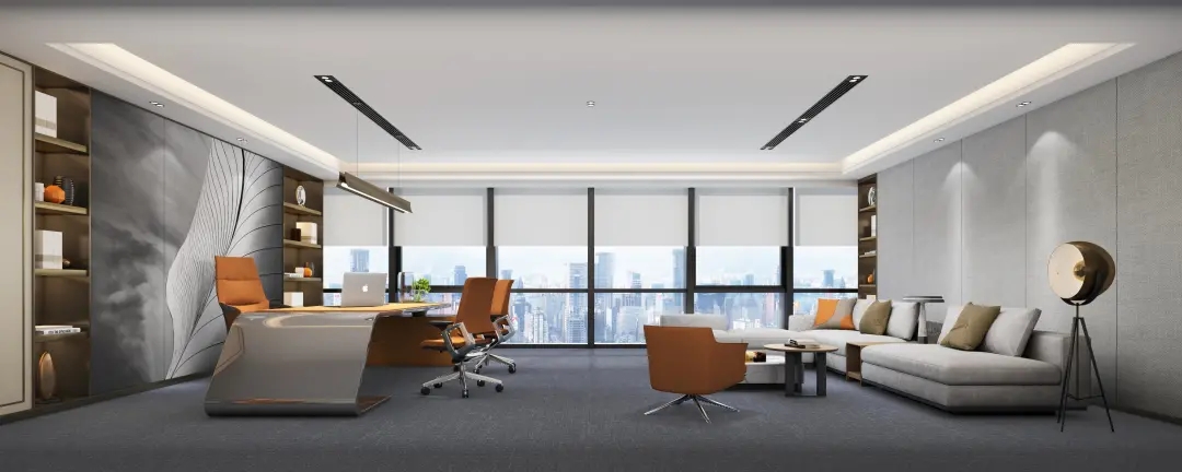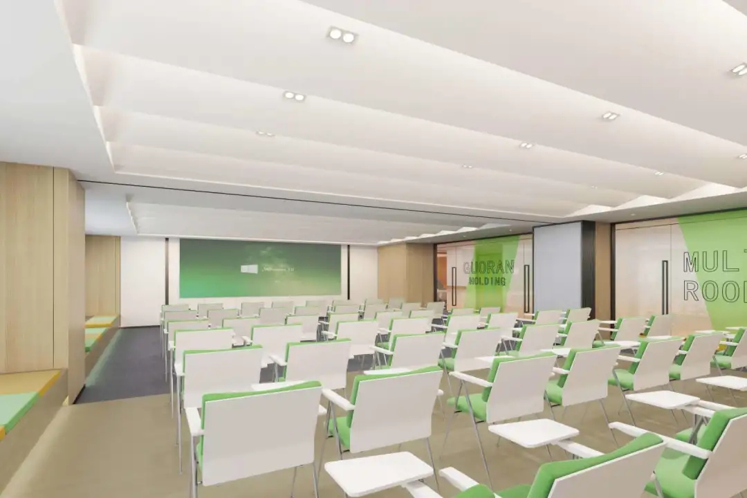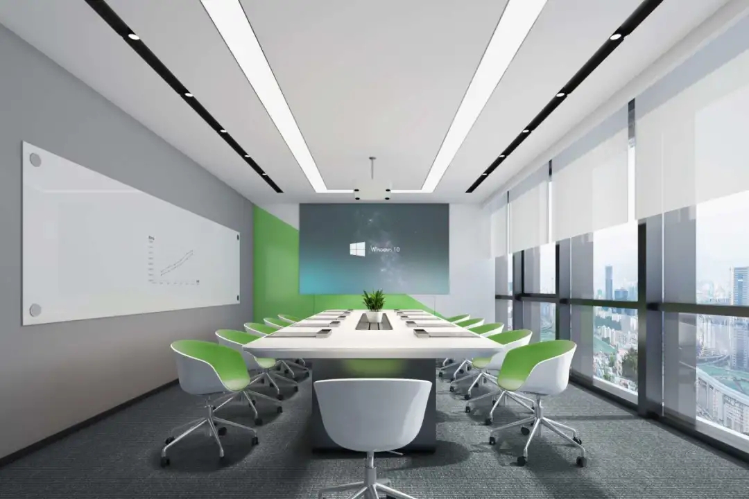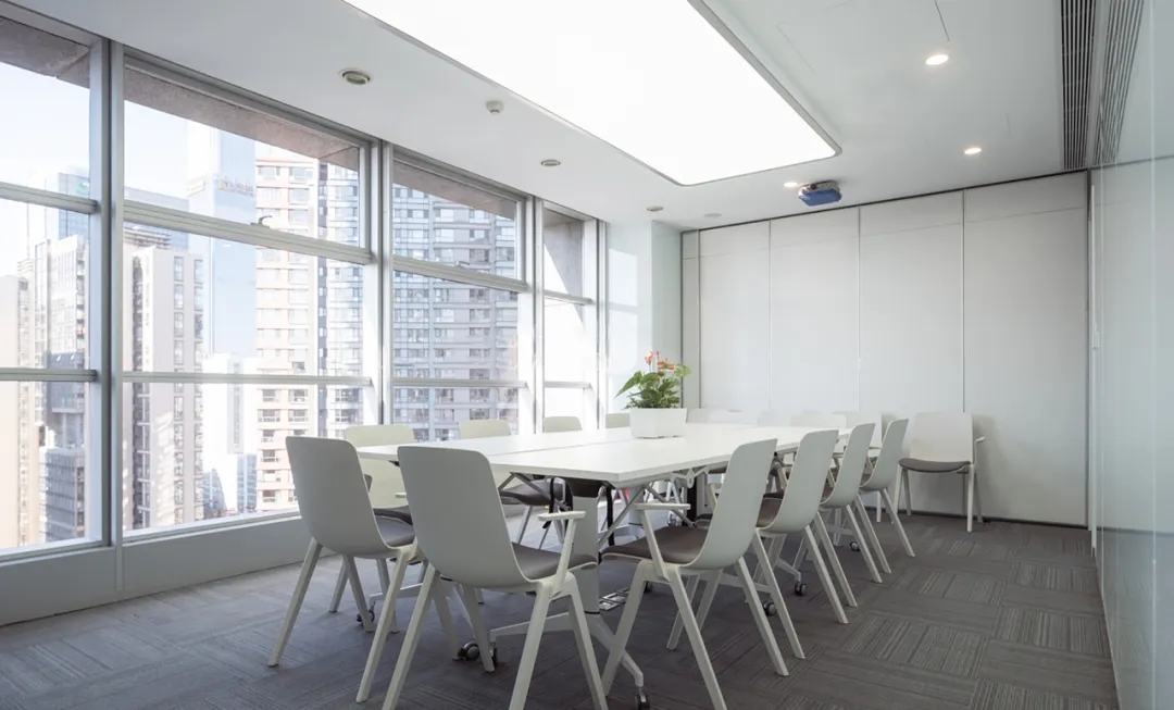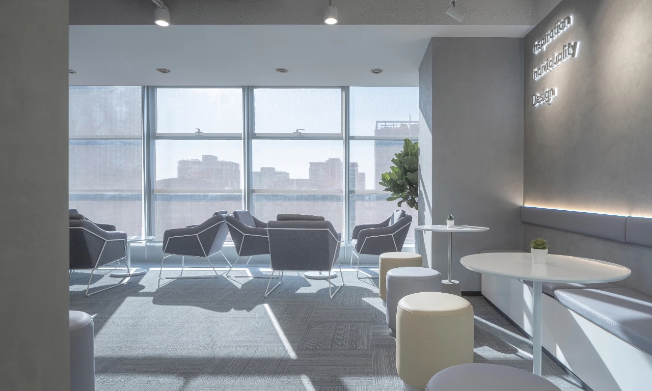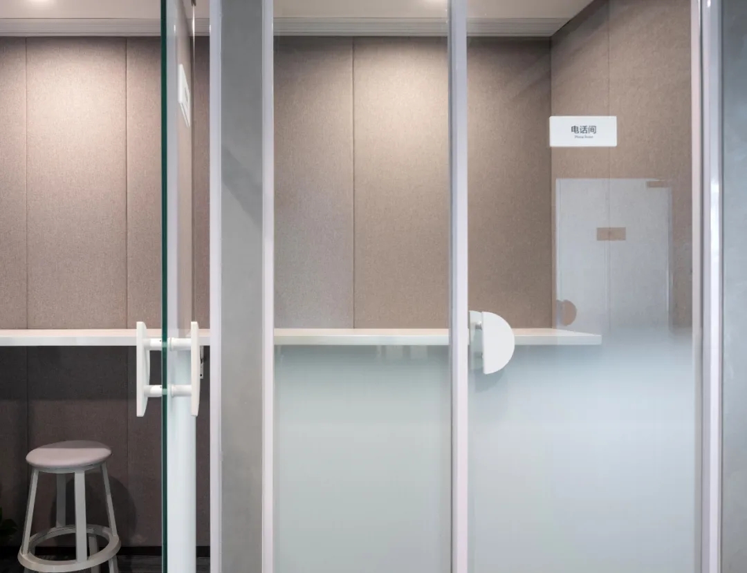 办公室的休闲交流区是信息枢纽站,是交流中心,是企业文化展现舞台。因此设计师匹配自然采光最佳,城市景观视野最开阔的空间。沿窗摆放若干组桌椅,内侧墙面镶嵌发光字体及LED屏,成为企业文化展示界面。在此可举行内部小型的研讨会,发布会,生日会或者其他接待活动等,根据不同的功能需求组摆桌椅。会议室是办公空间的一种综合性场所,设计师设计了不同规模的会议空间。小会议室满足小型讨论会或者站立办公需求,大会议室满足智能/远程会议,或内部员工培训等需求,电话间作为私密性的接打电话场所,同时也可以作为单人办公或者双人私密会议空间。