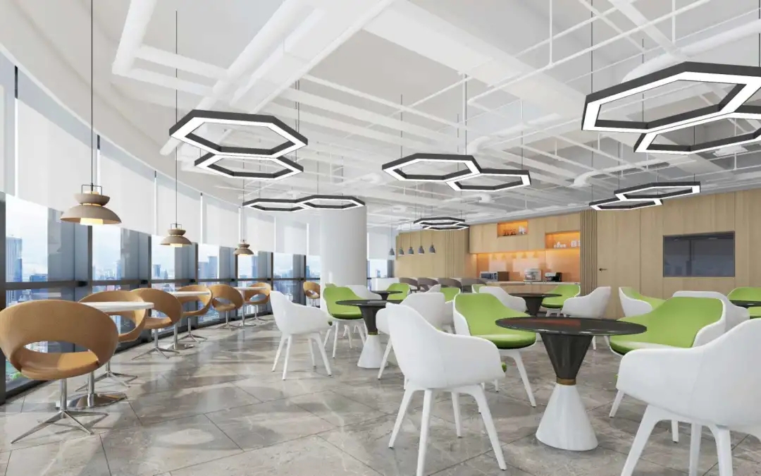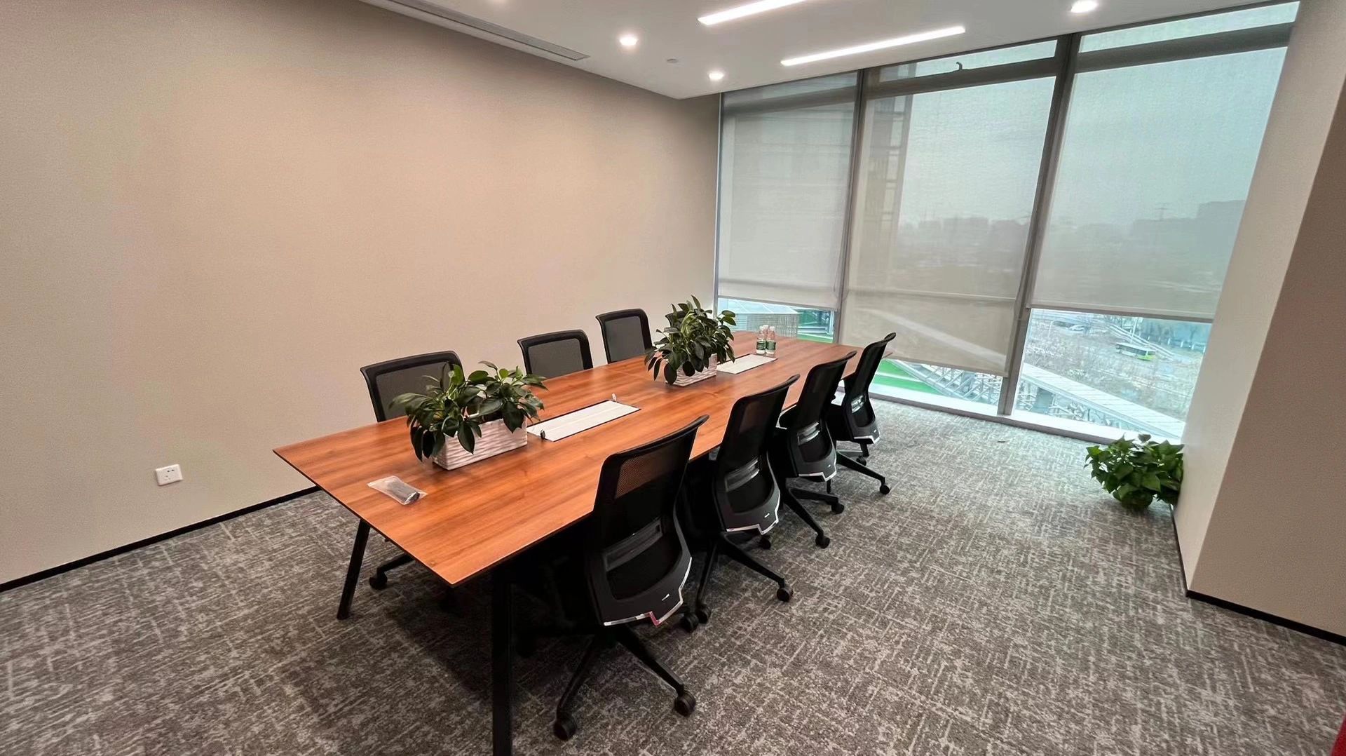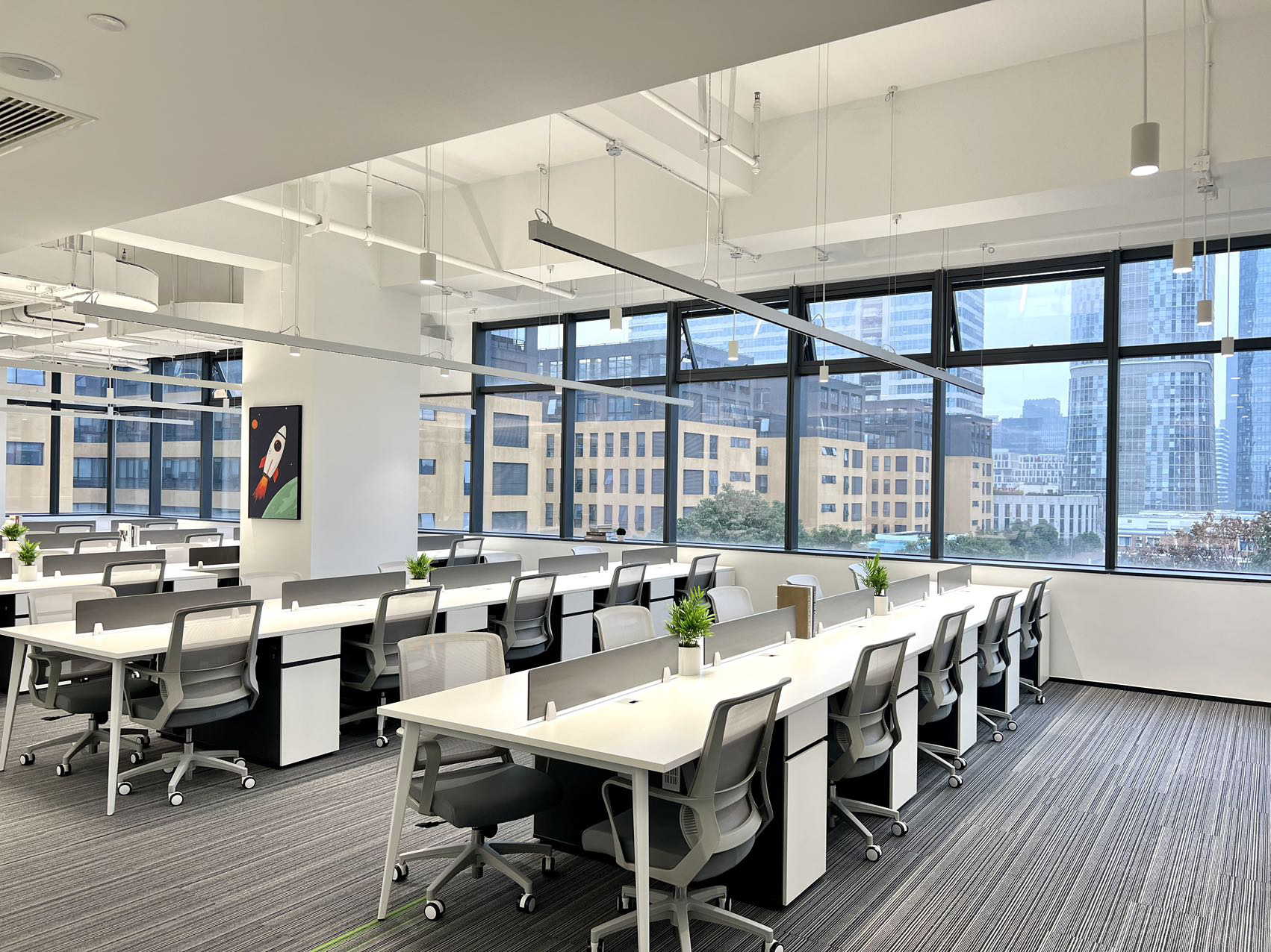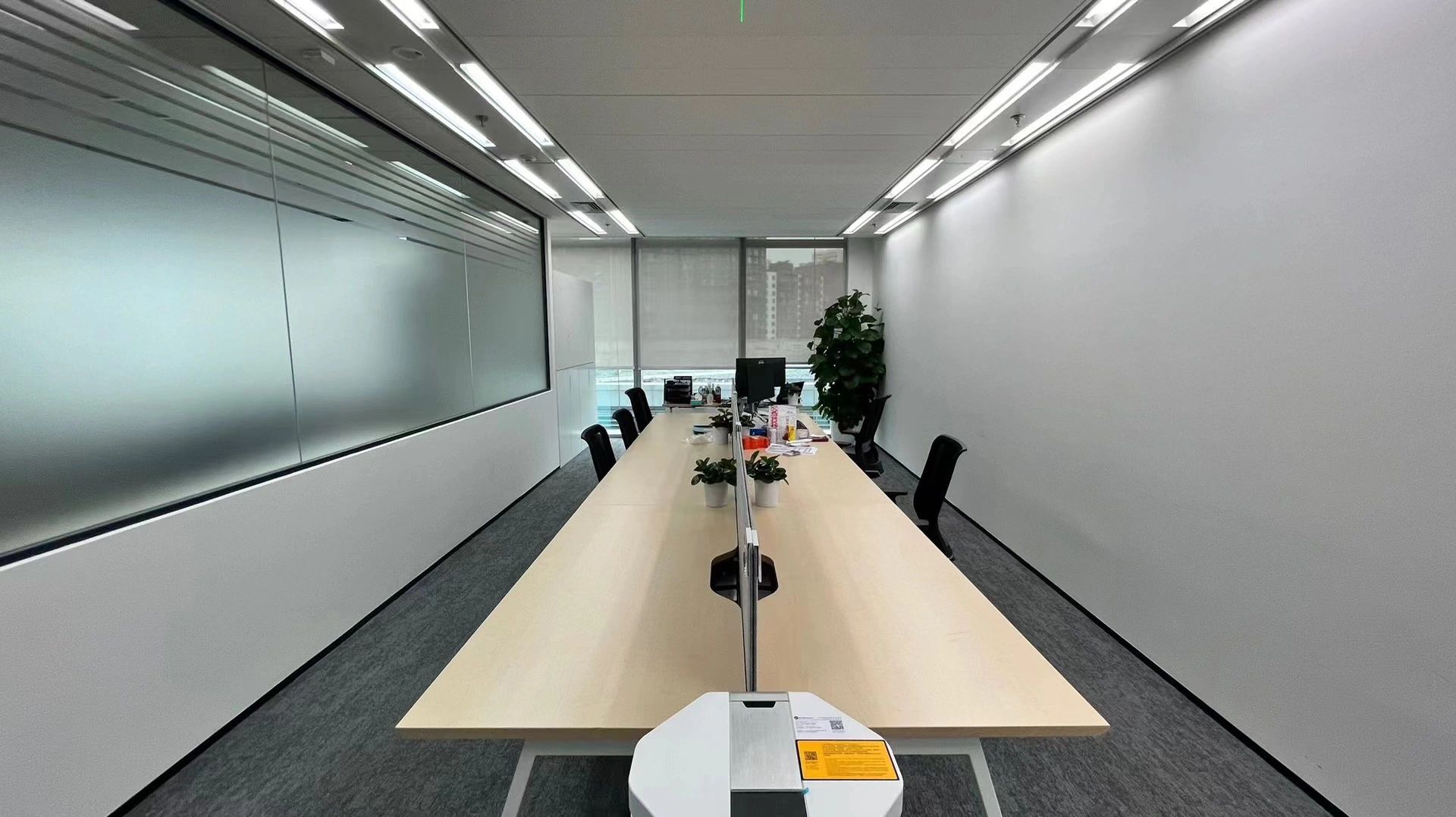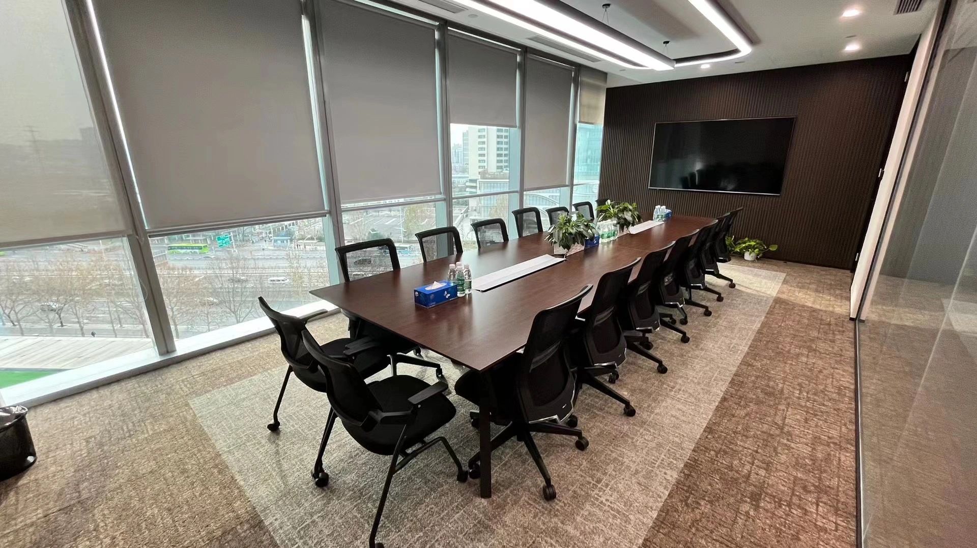 办公室的休闲交流区是信息枢纽站,是交流中心,是企业文化展现舞台。因此设计师匹配自然采光最佳,城市景观视野最开阔的空间。沿窗摆放若干组桌椅,内侧墙面镶嵌发光字体及LED屏,成为企业文化展示界面。在此可举行内部小型的研讨会,发布会,生日会或者其他接待活动等,根据不同的功能需求组摆桌椅。会议室是办公空间的一种综合性场所,设计师设计了不同规模的会议空间。小会议室满足小型讨论会或者站立办公需求,大会议室满足智能/远程会议,或内部员工培训等需求,电话间作为私密性的接打电话场所,同时也可以作为单人办公或者双人私密会议空间。