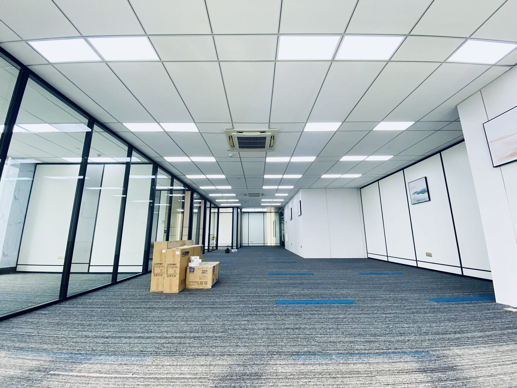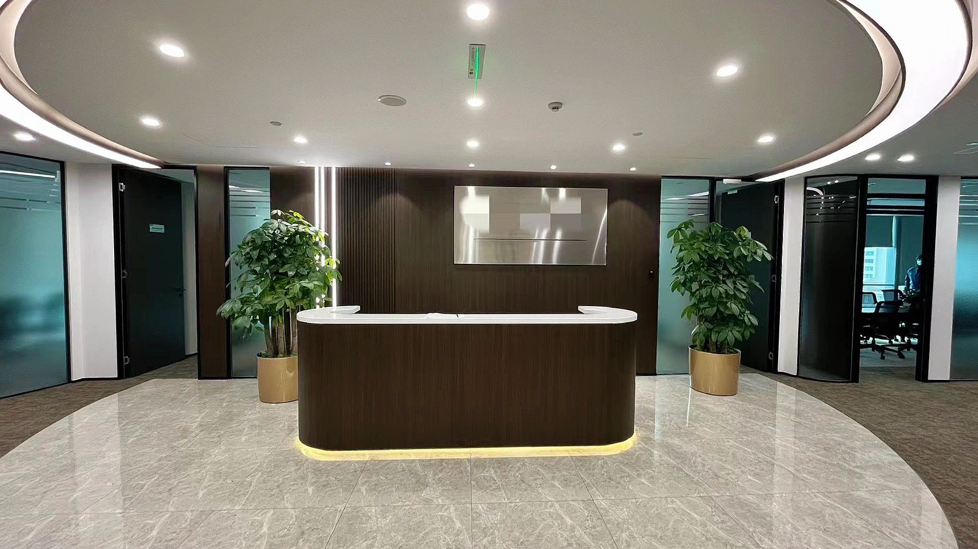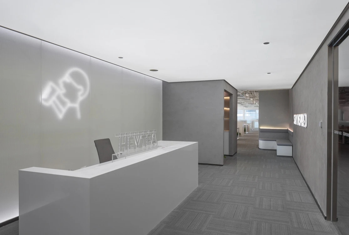 接待空间,设计师巧妙的置入方盒子,隔出半开放半封闭的空间,盒子内是私密的面试间,盒子外是开放的等候区,并且以发光体字,展示品牌文化,增加空间的氛围感。