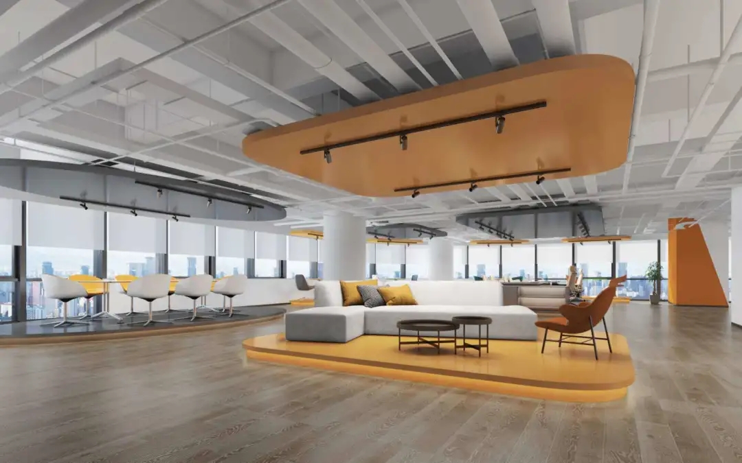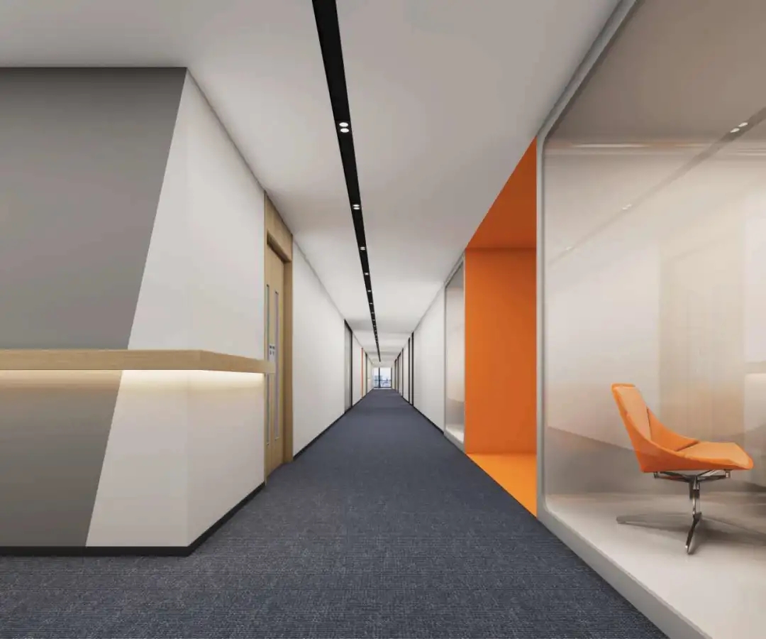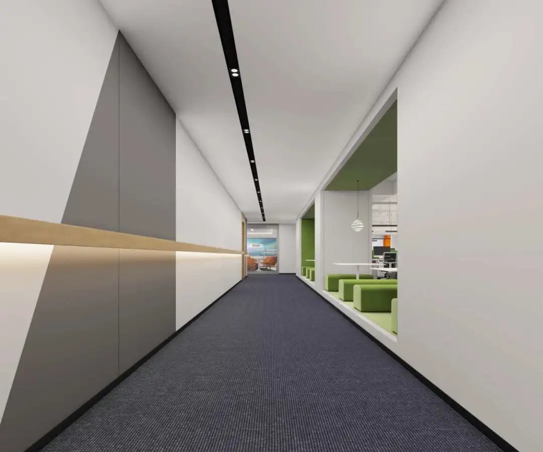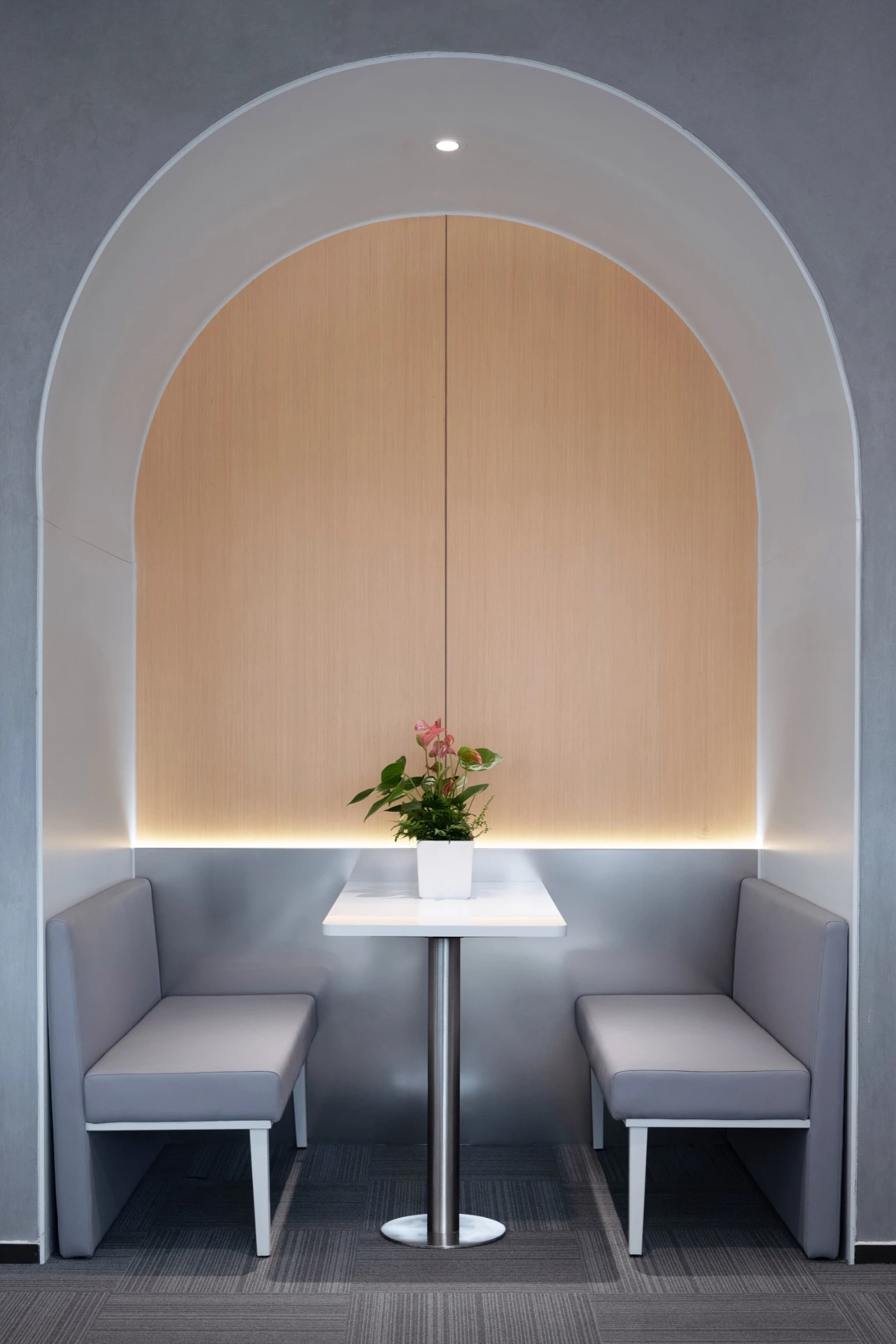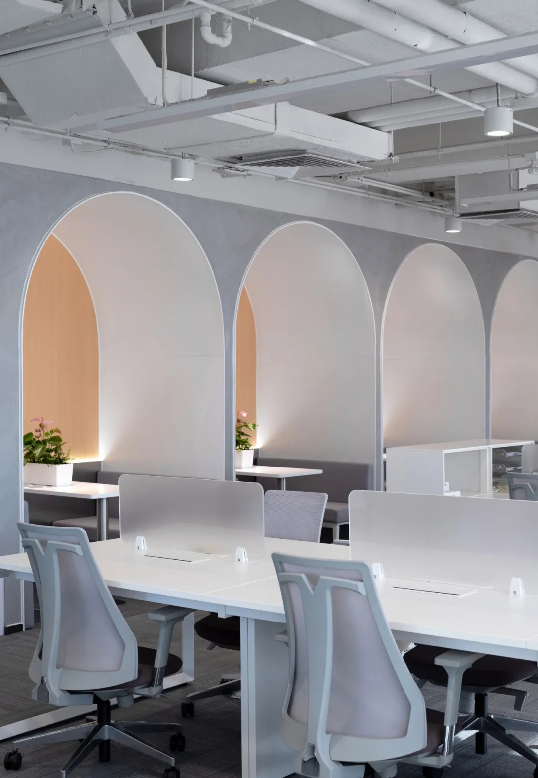 公共办公区沿着核心筒一侧,设置休闲讨论区,一排拱券式结构相连,灰色卡座及原木色背景,增加整个空间的活跃度。功能上鼓励并促进员工相互讨论,心理上暖色调及空间形式的变化,劳逸结合,缓解工作压力。