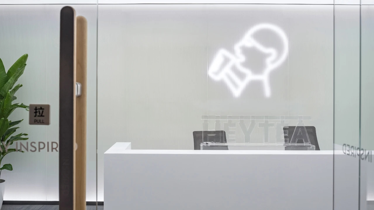 喜茶办公室依然延续简洁及强烈视觉辨识度的风格。入口接待空间,呆萌小人儿LOGO品牌形象及透明立牌,醒目的彰显着空间身份。