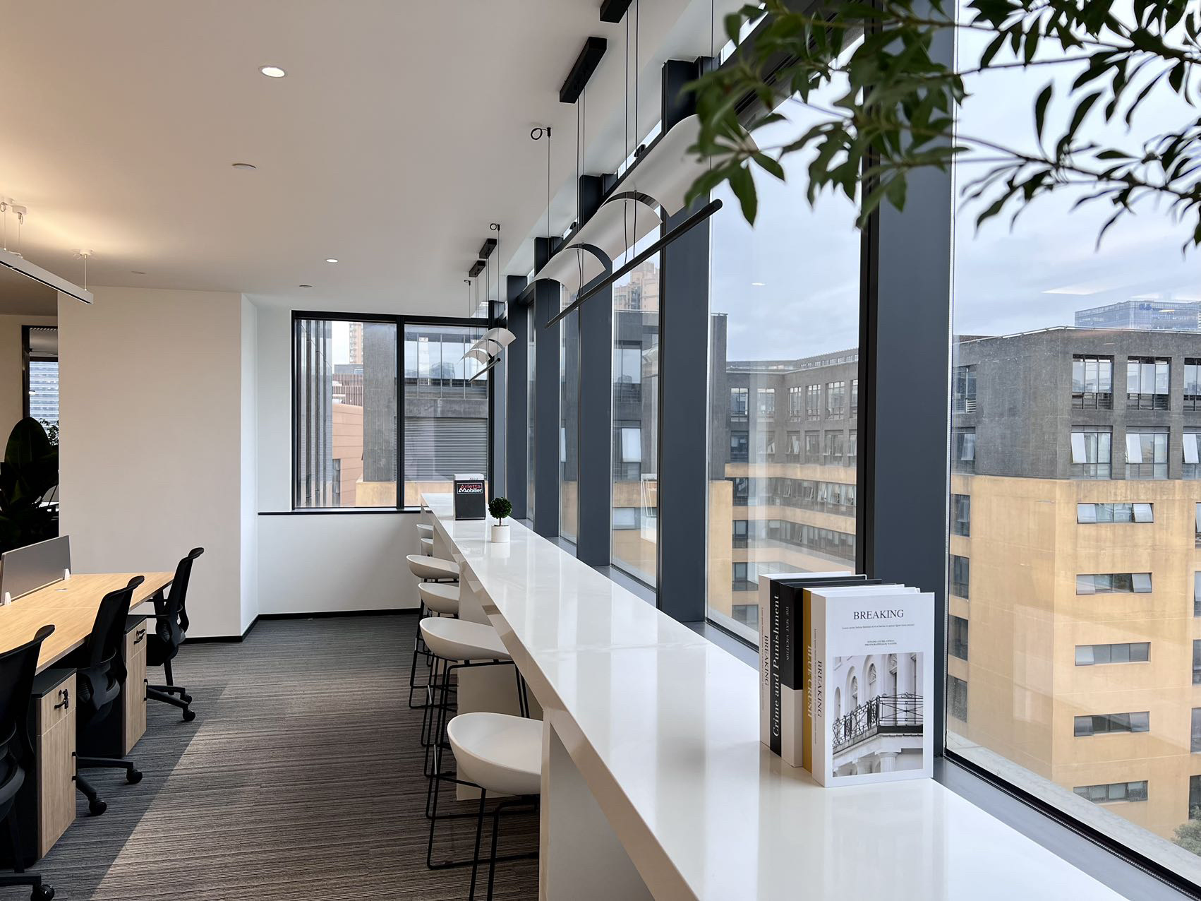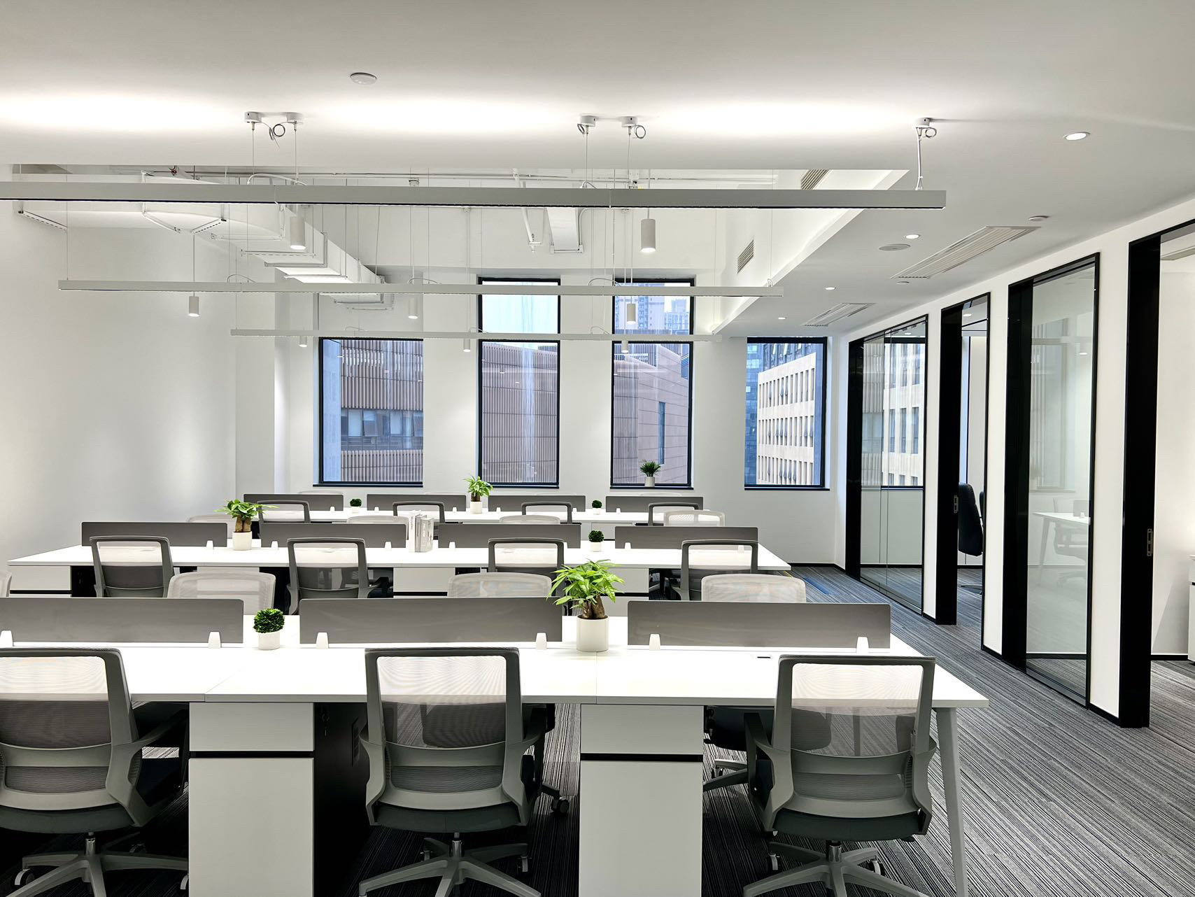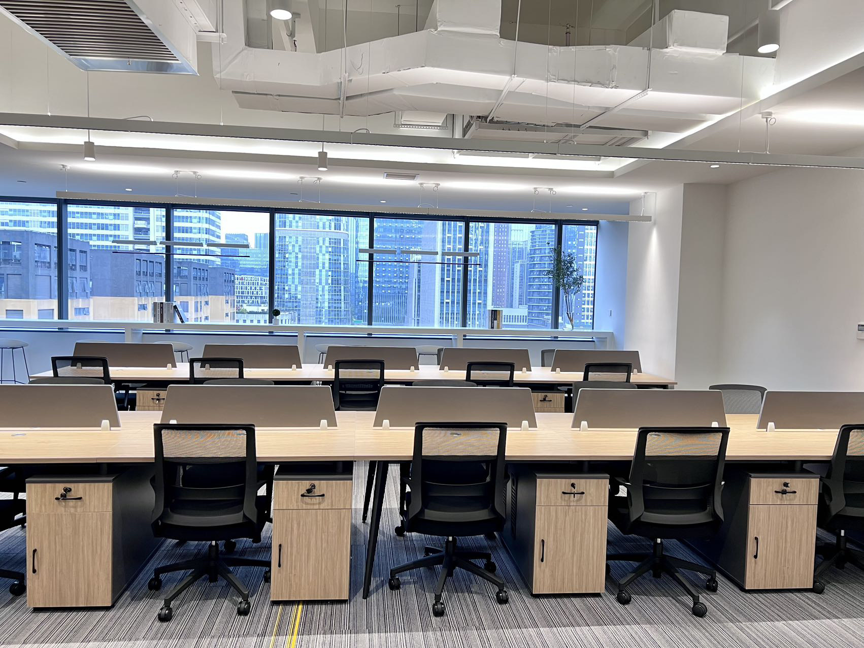 大面积的落地窗户,极好的采光加之足够的高度,开阔明亮的氛围不会左右调动任何情绪,更自由更开放大型开放式空间提升视线和流通效果,让空间更为透彻,不显压抑,为使用者营造了更舒适、更加协同合作和促进社交沟通的工作环境。