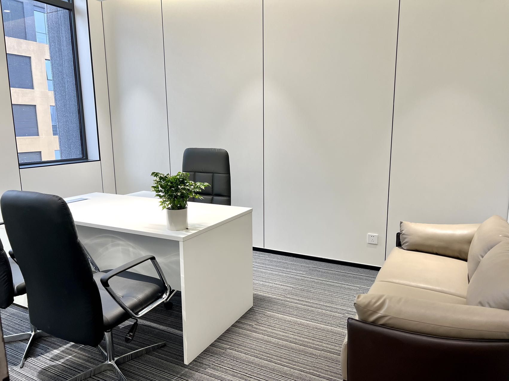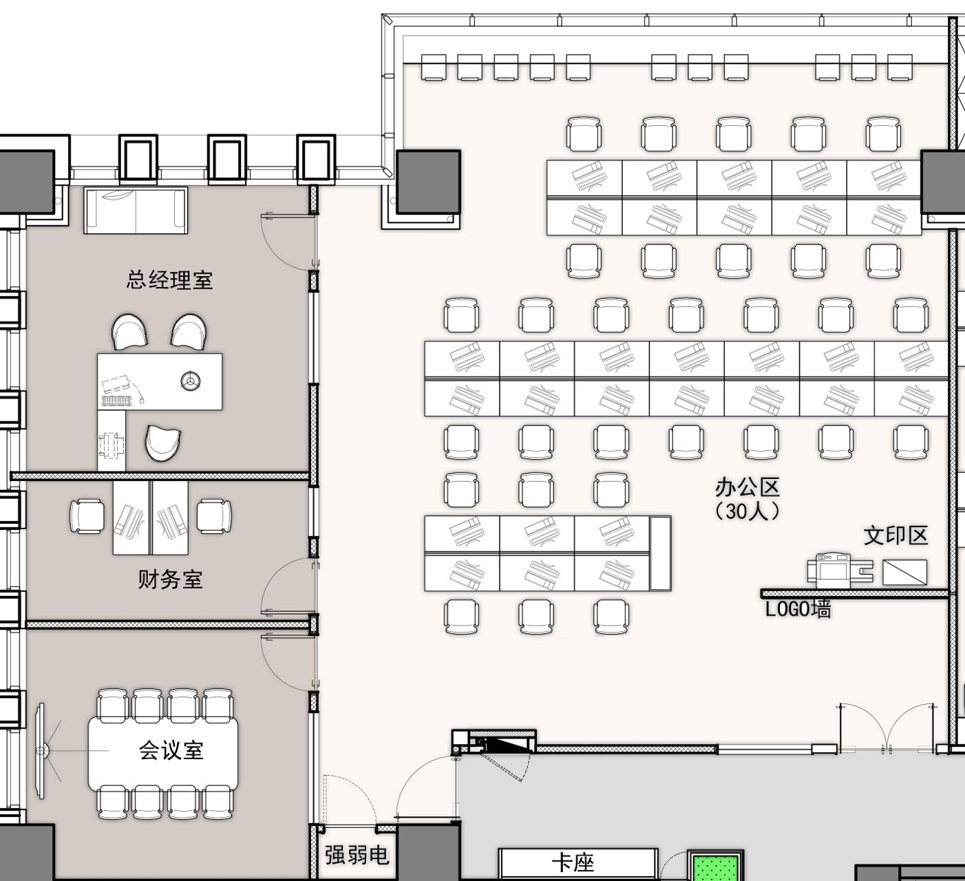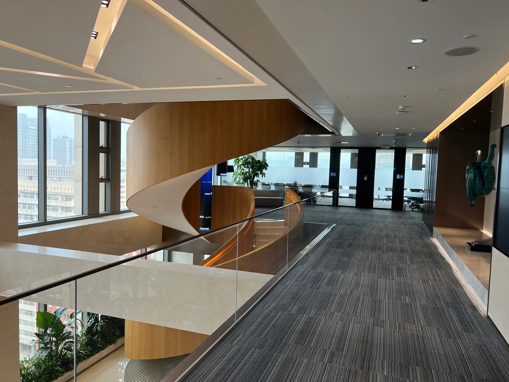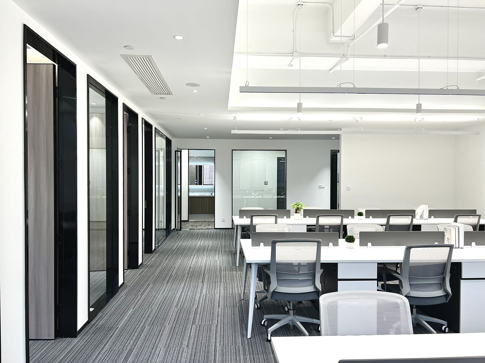 大面积的落地窗户,极好的采光加之足够的高度,开阔明亮的氛围不会左右调动任何情绪,更自由更开放大型开放式空间提升视线和流通效果,让空间更为透彻,不显压抑,为使用者营造了更舒适、更加协同合作和促进社交沟通的工作环境。